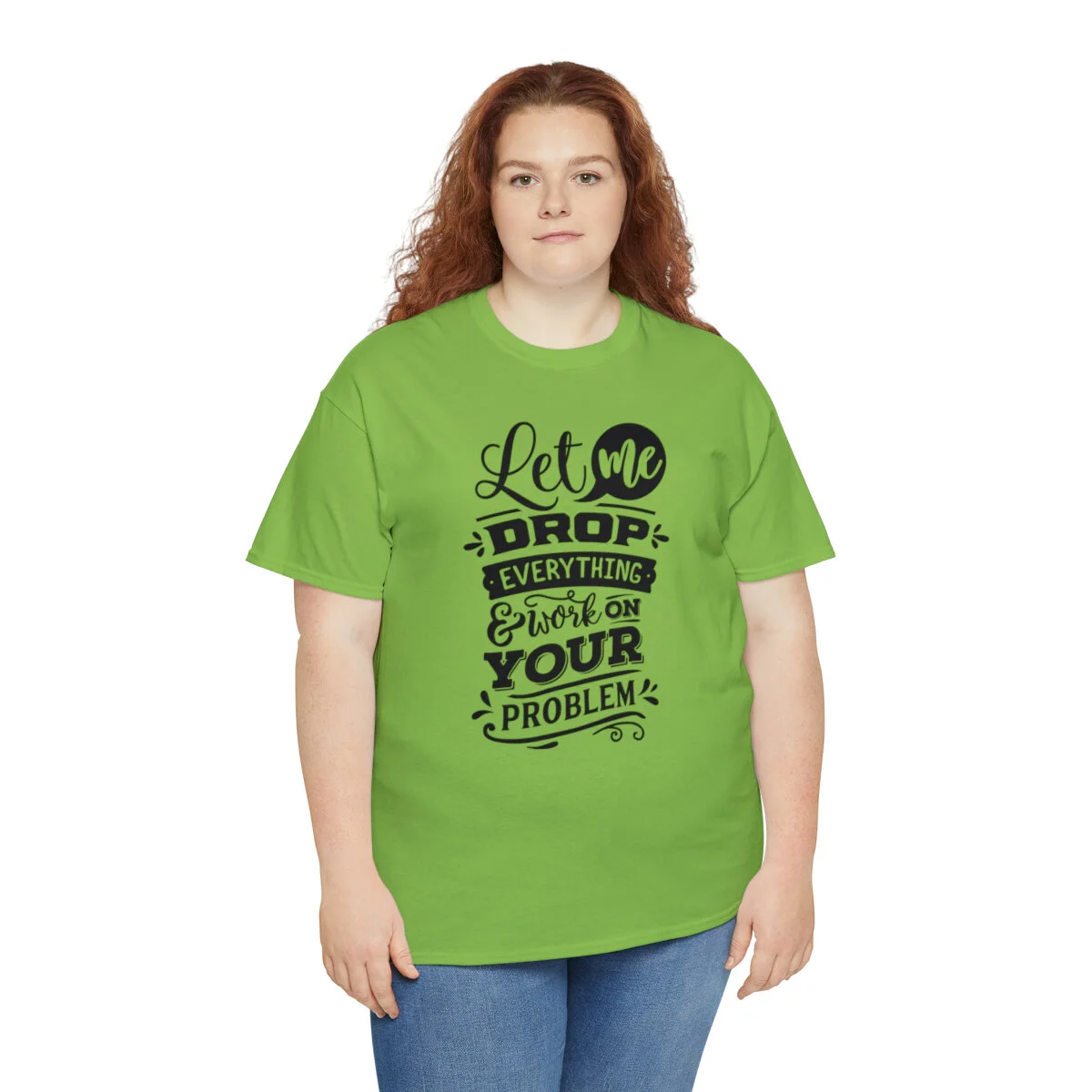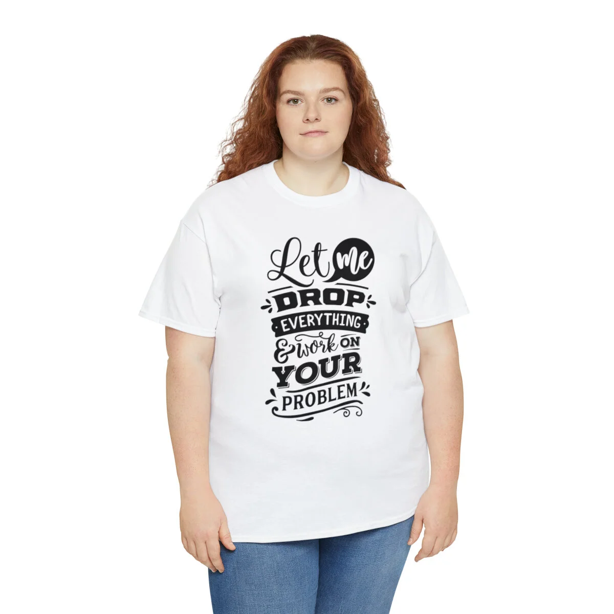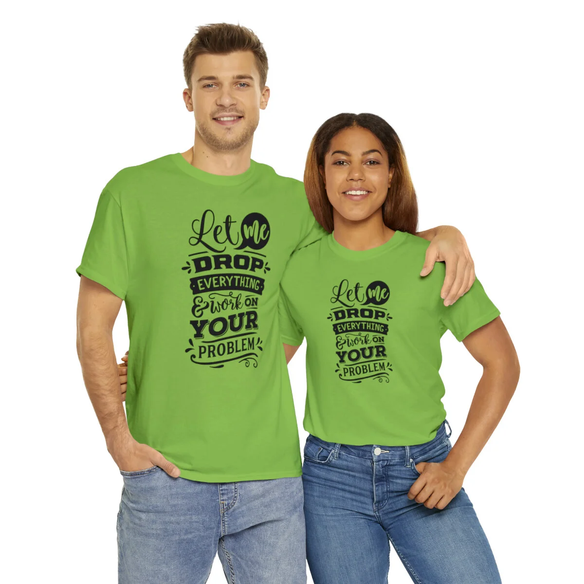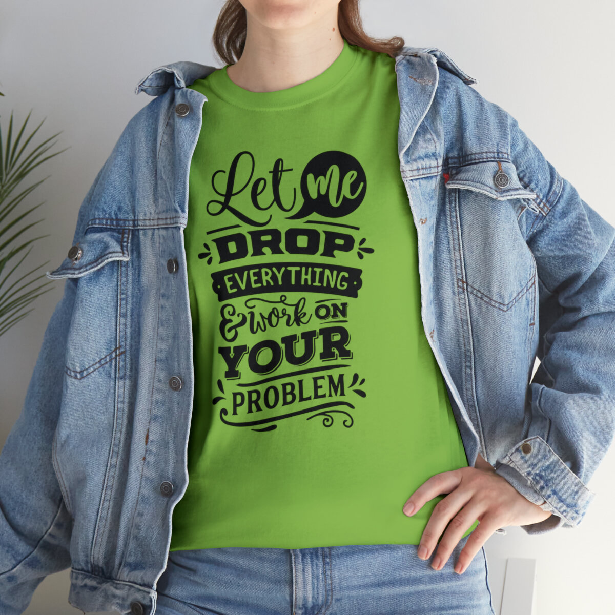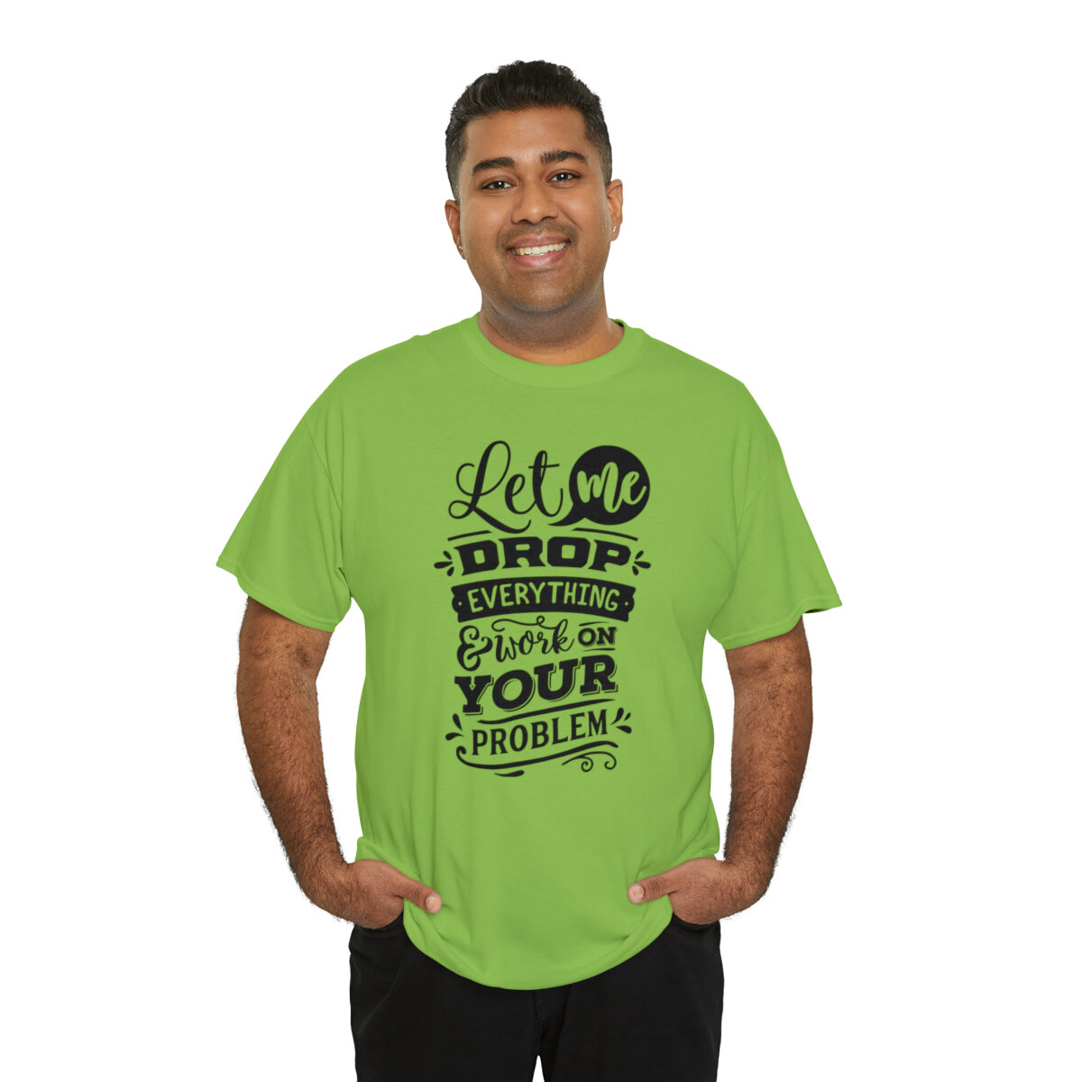 Crafted with care, this t-shirt is made from high-quality fabric to ensure exceptional comfort and durability. The design features the clever phrase, "Let me drop everything and work on your problem," elegantly displayed in multiple colors. Choose from a variety of vibrant options, including red, blue, yellow, or classic black and white, to find the hue that best matches your style and personality.