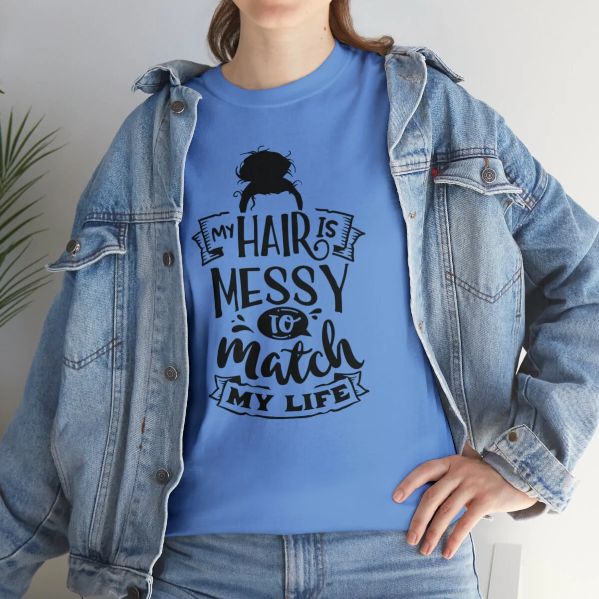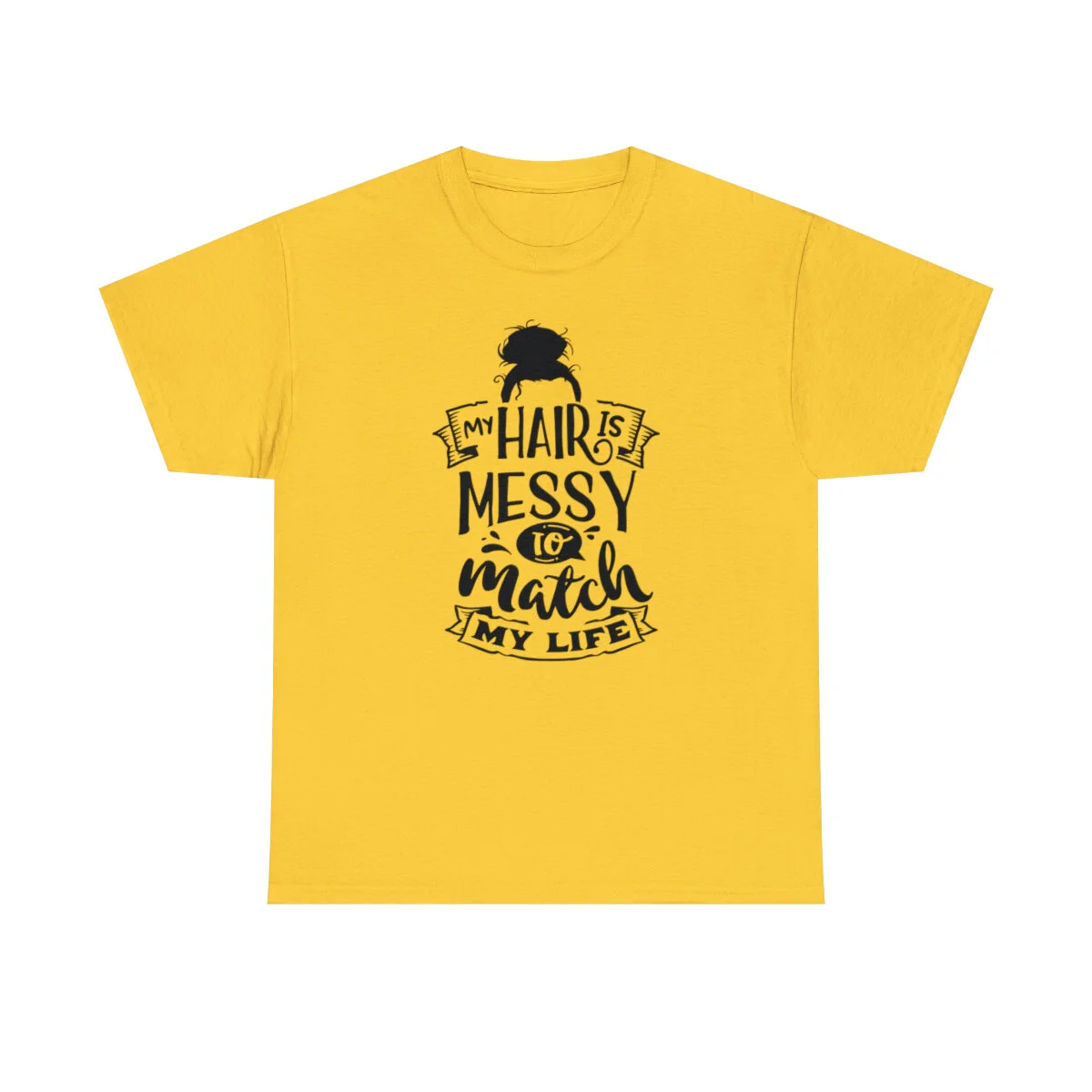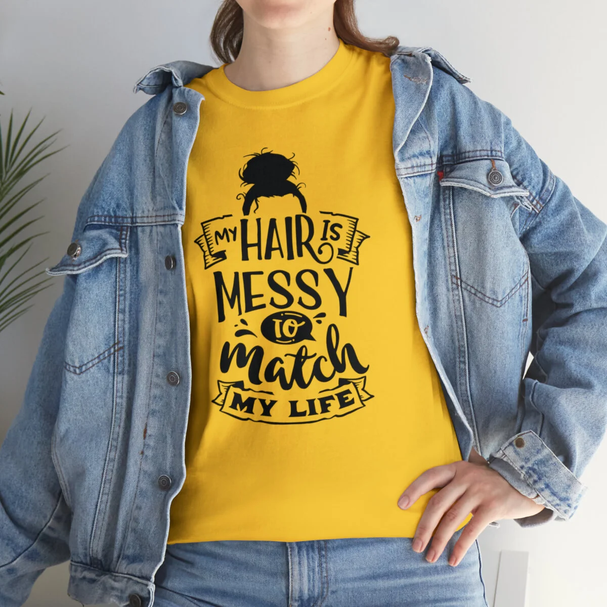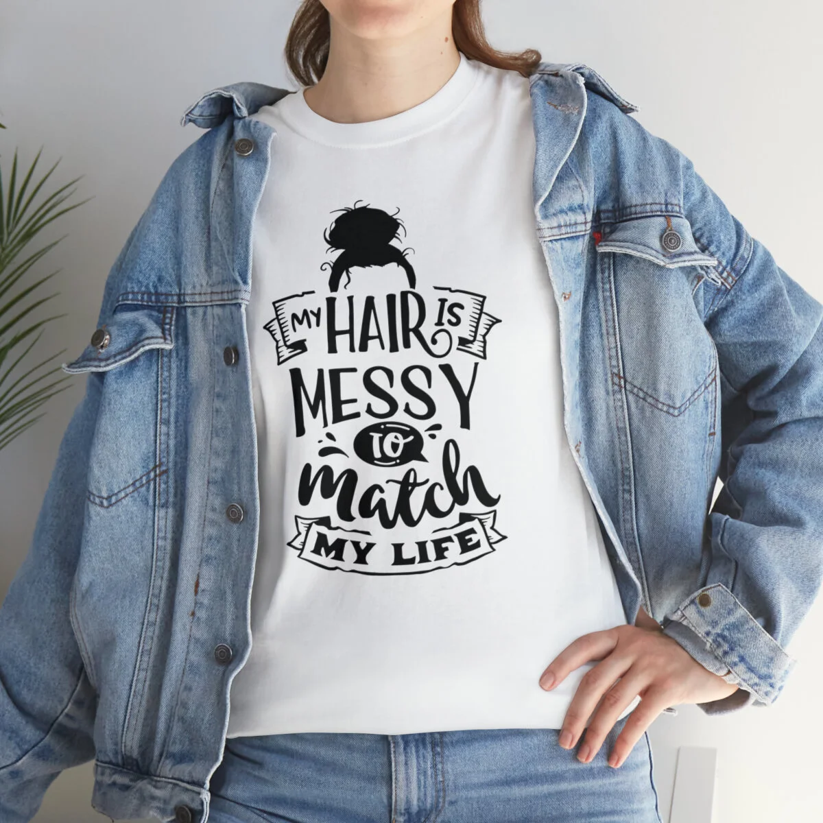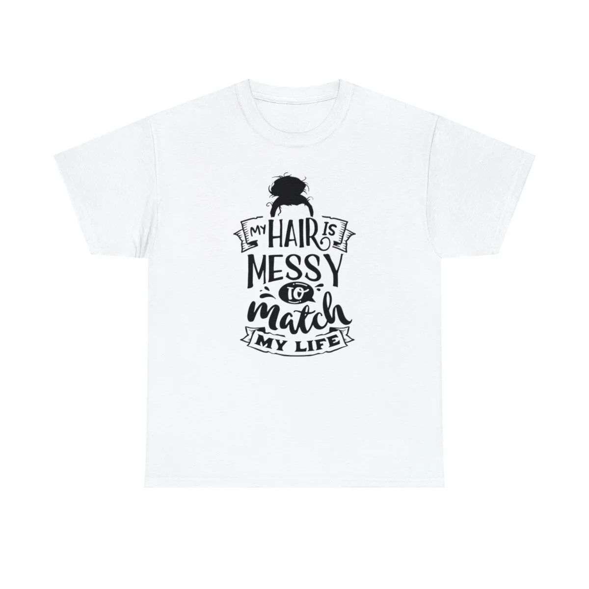 Crafted with care, this t-shirt is made from high-quality fabric to ensure exceptional comfort and durability. The design features the clever phrase, "My hair is messy, to match my life," elegantly displayed in multiple colors. Choose from a variety of vibrant options, including red, blue, yellow, or classic black and white, to find the hue that best matches your style and personality.