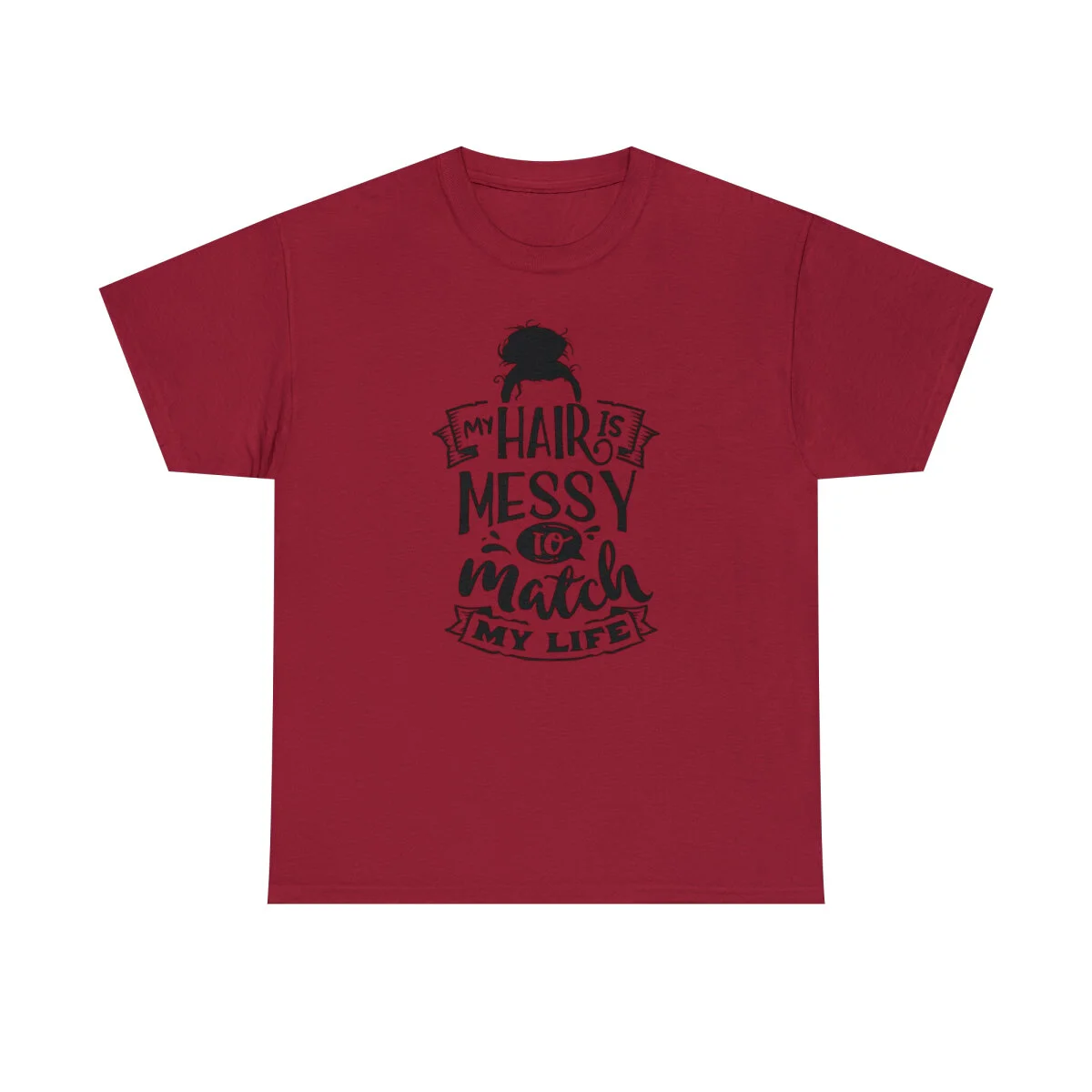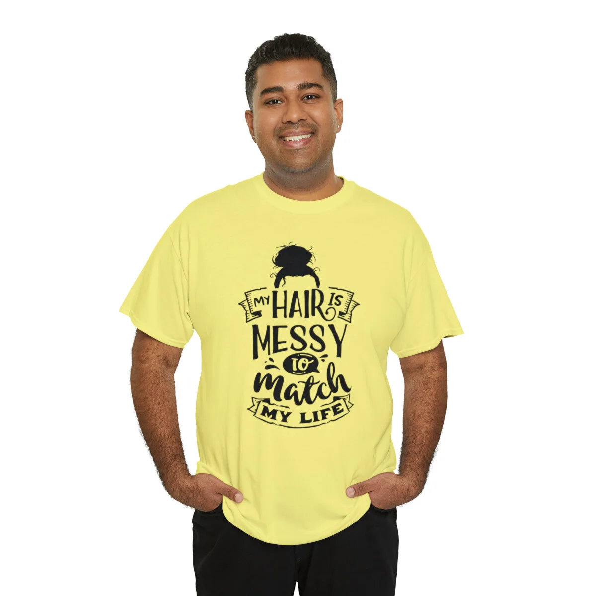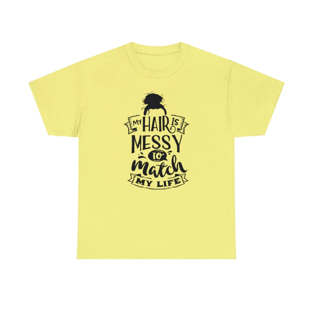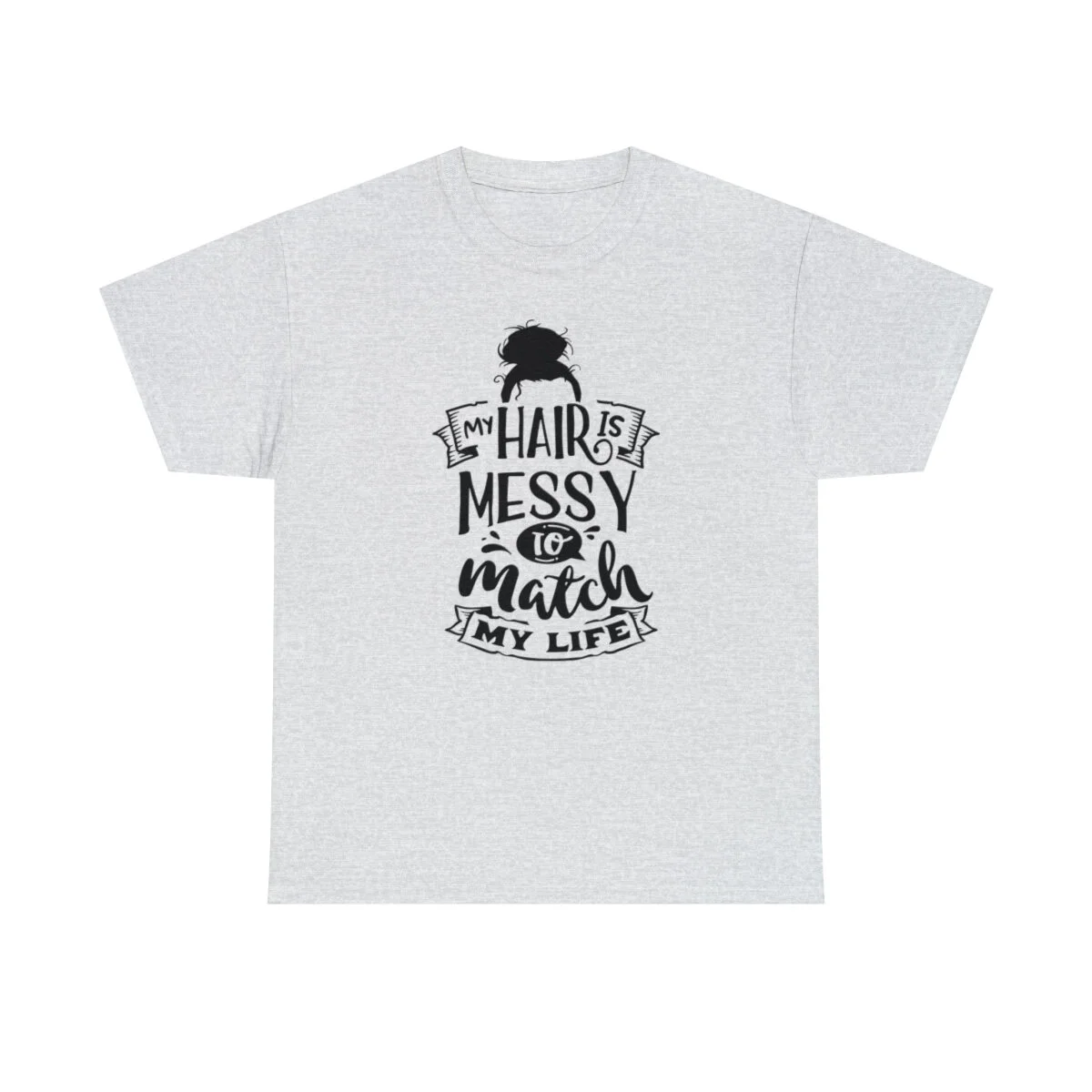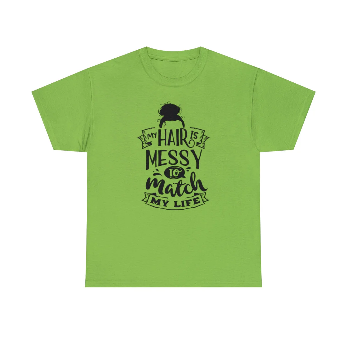 Crafted with care, this t-shirt is made from high-quality fabric to ensure exceptional comfort and durability. The design features the clever phrase, "My hair is messy, to match my life," elegantly displayed in multiple colors. Choose from a variety of vibrant options, including red, blue, yellow, or classic black and white, to find the hue that best matches your style and personality.