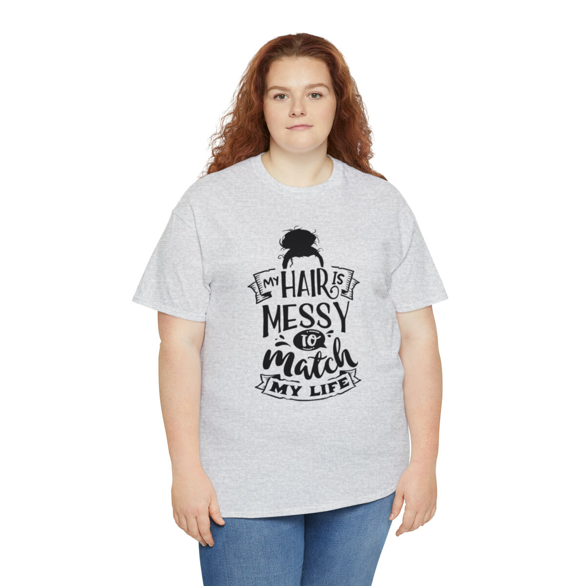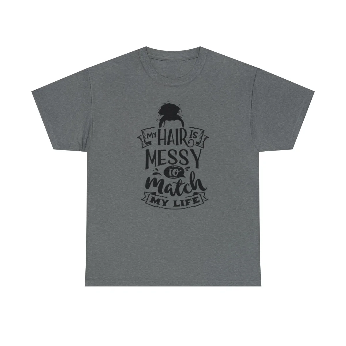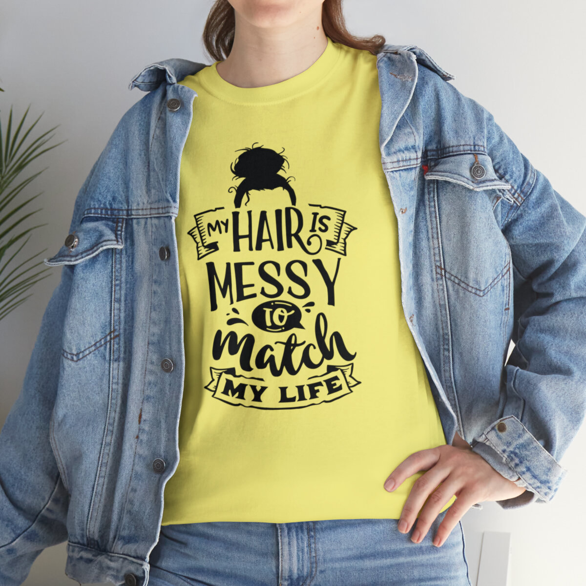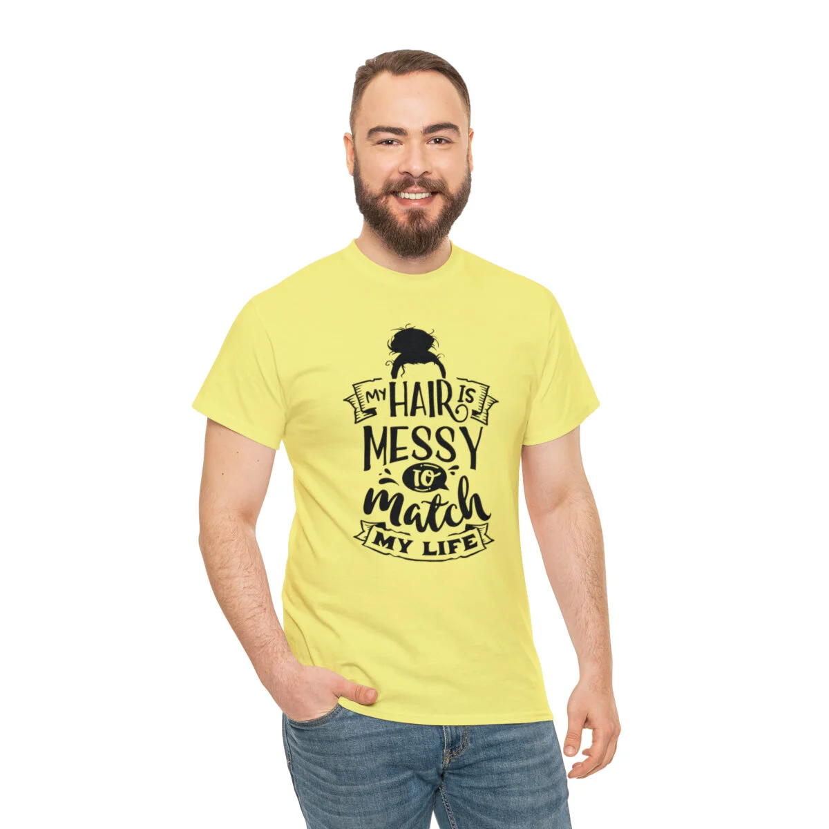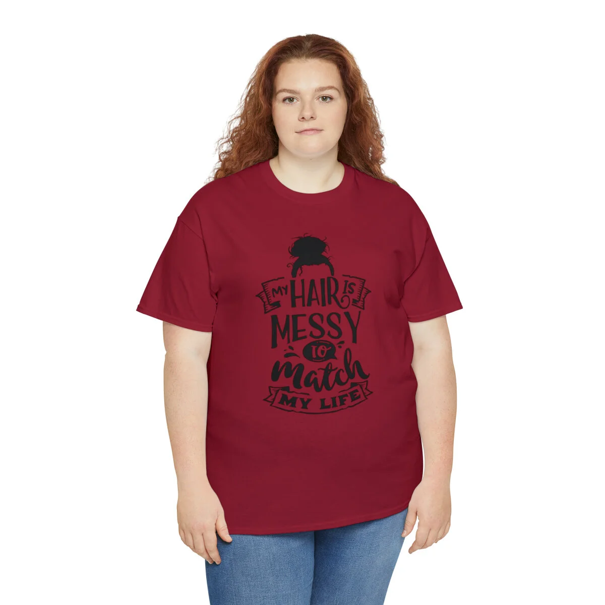Crafted with care, this t-shirt is made from high-quality fabric to ensure exceptional comfort and durability. The design features the clever phrase, "My hair is messy, to match my life," elegantly displayed in multiple colors. Choose from a variety of vibrant options, including red, blue, yellow, or classic black and white, to find the hue that best matches your style and personality.