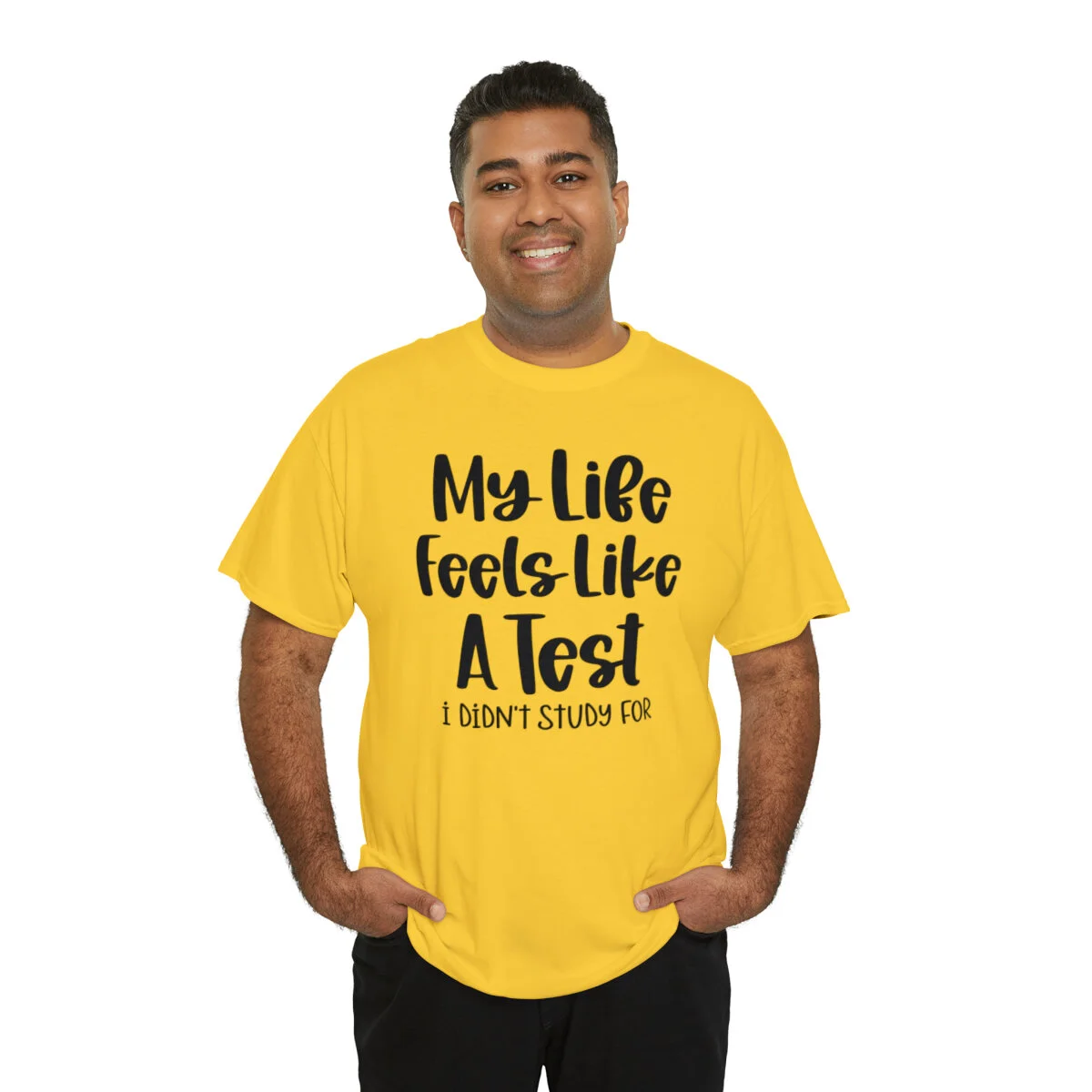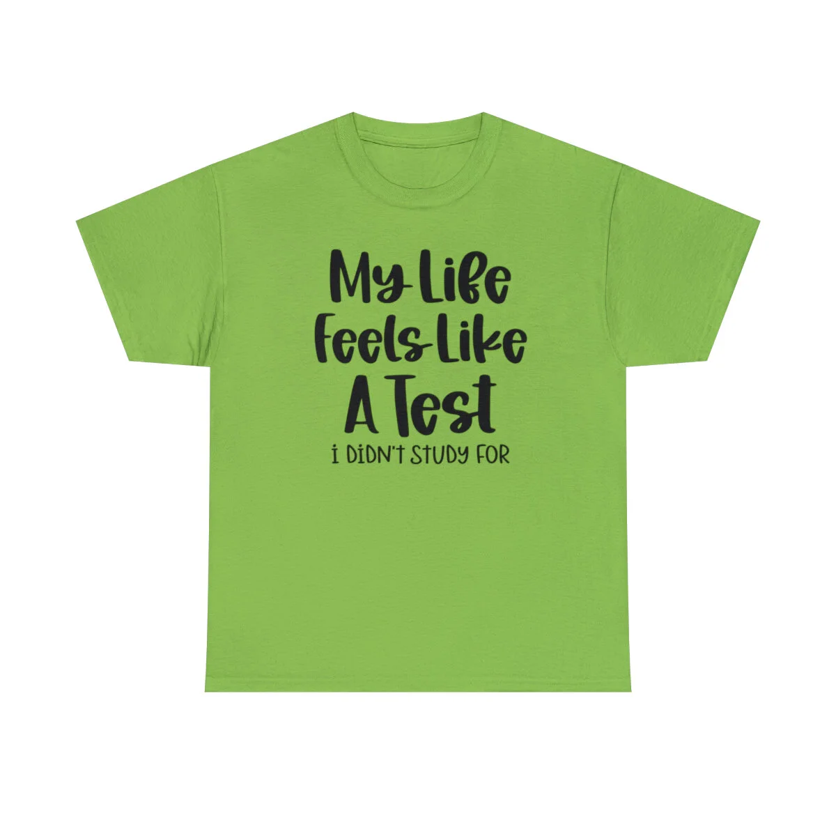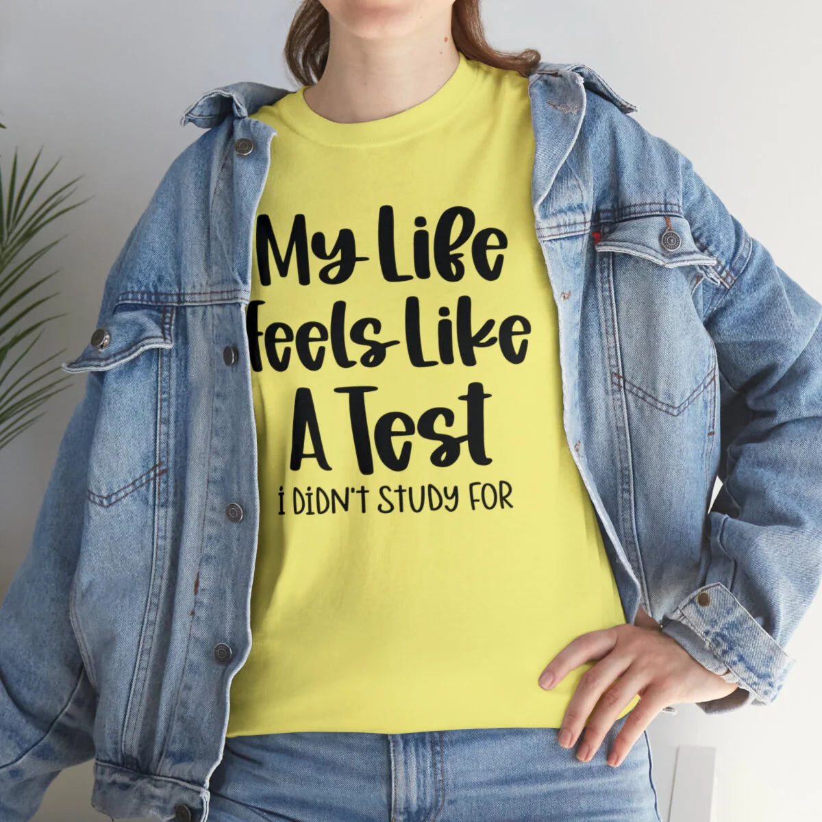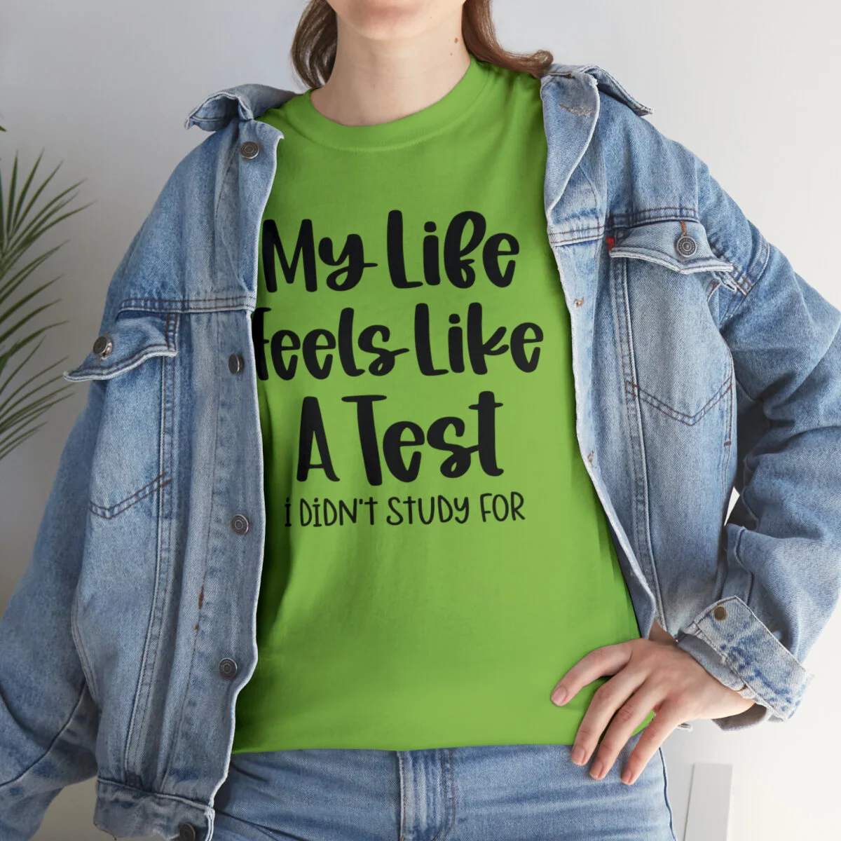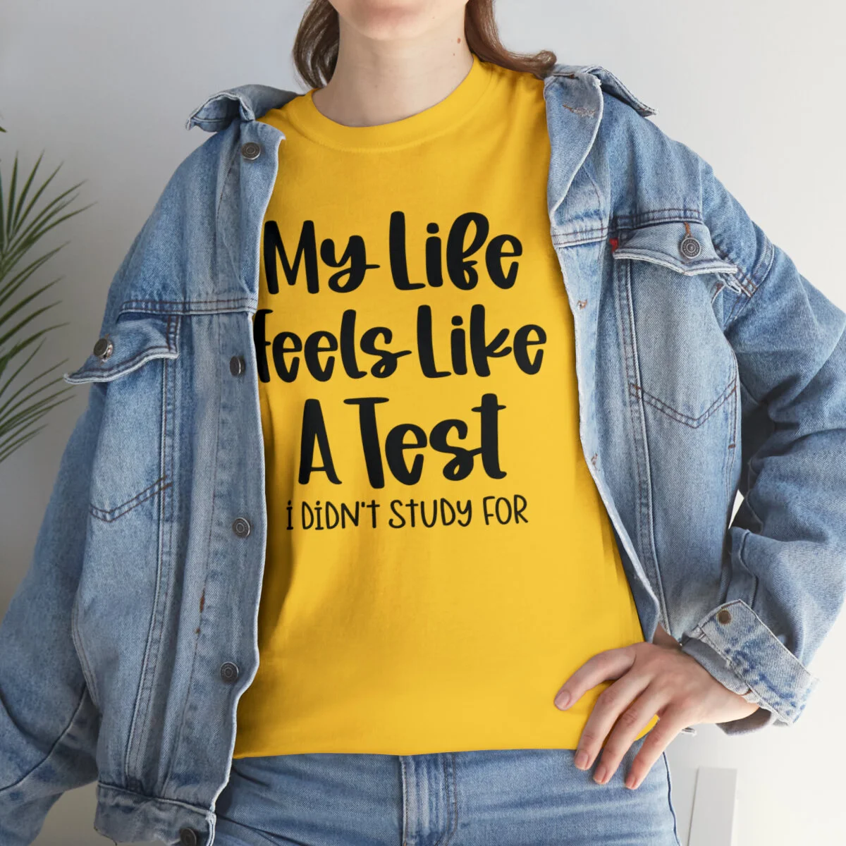 The design features a clever arrangement of text, with the phrase "My life feels like a test I didn't study for" showcased prominently on the front of the shirt. The words are arranged in a visually appealing manner, drawing attention and inviting contemplation.