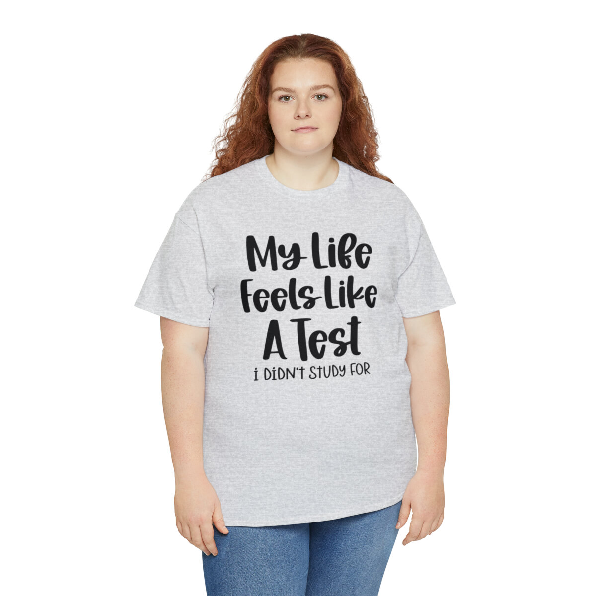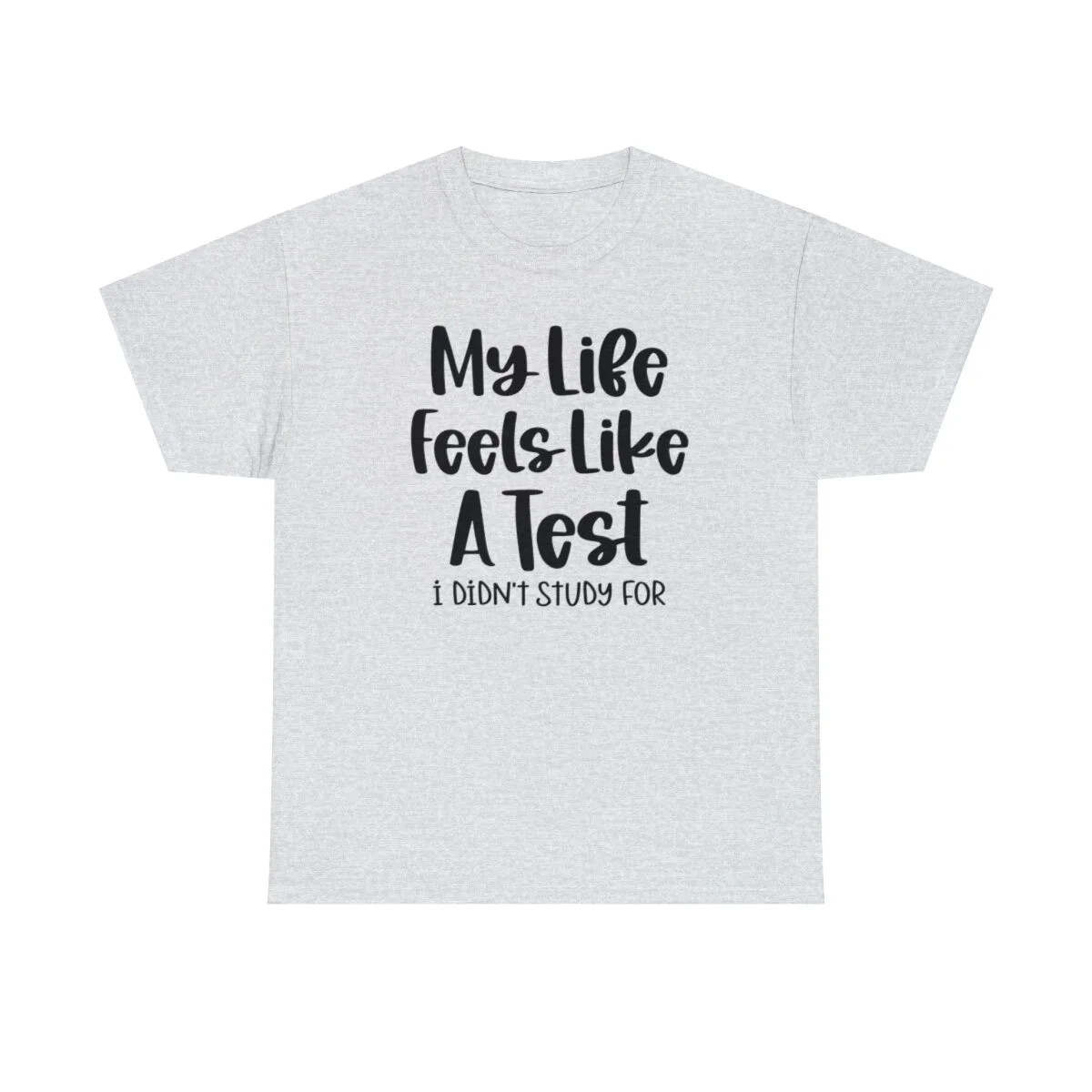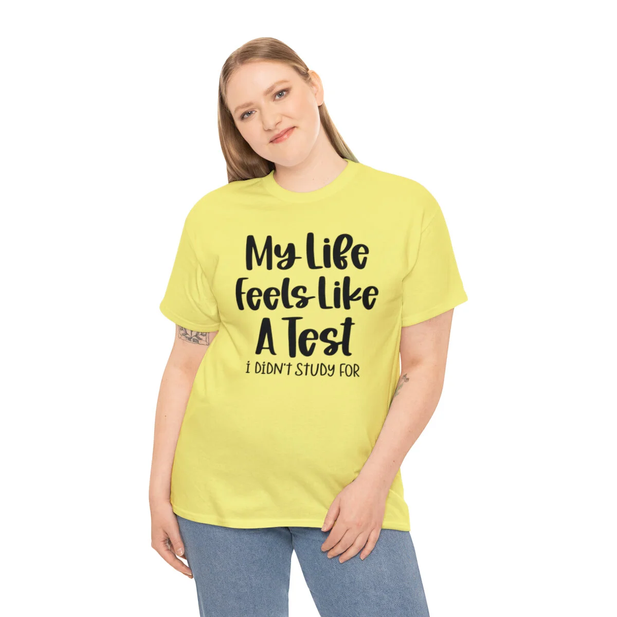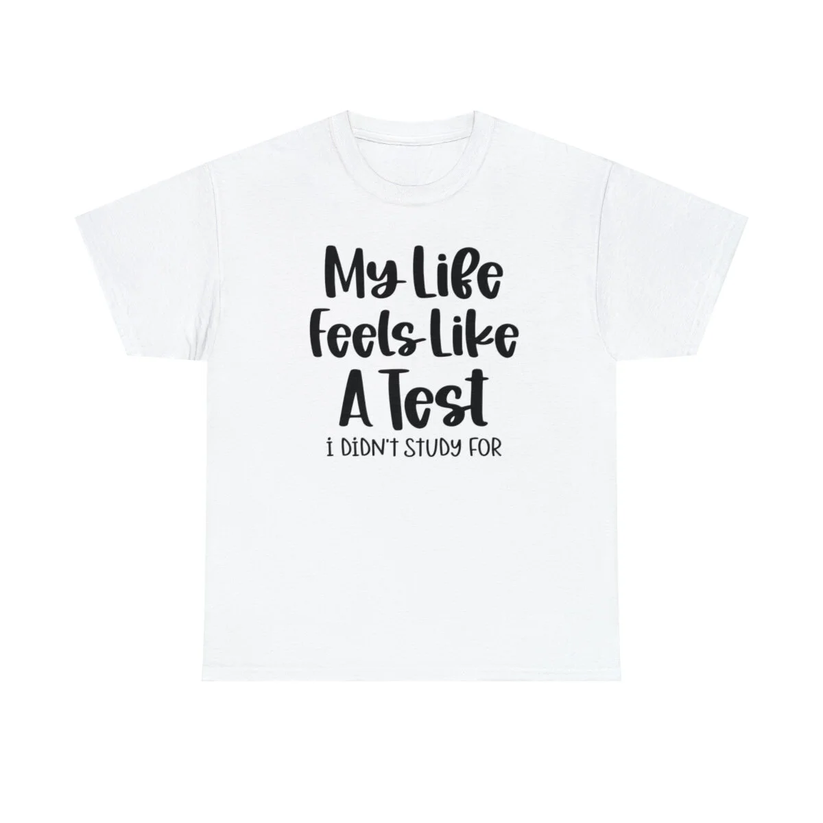 The design features a clever arrangement of text, with the phrase "My life feels like a test I didn't study for" showcased prominently on the front of the shirt. The words are arranged in a visually appealing manner, drawing attention and inviting contemplation.