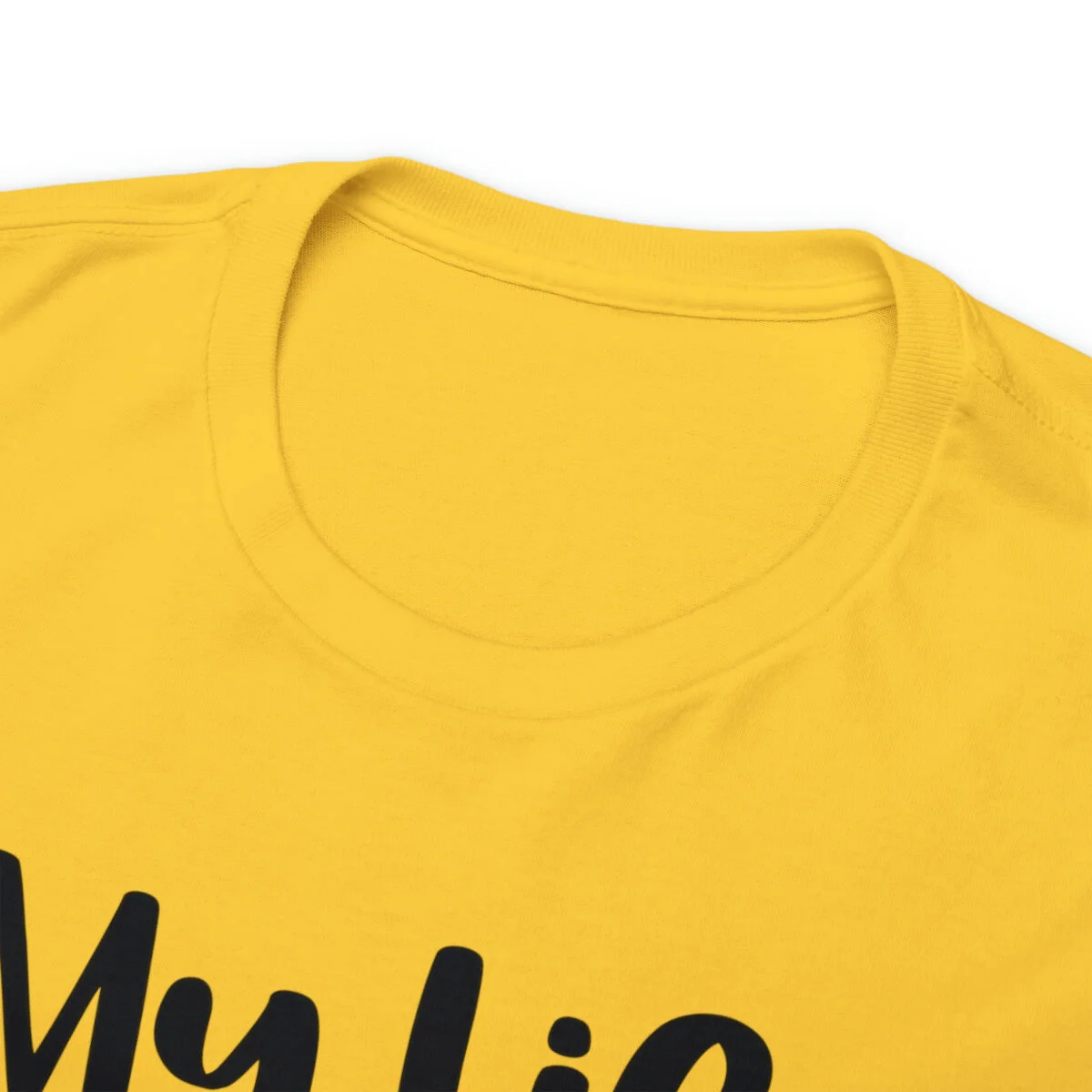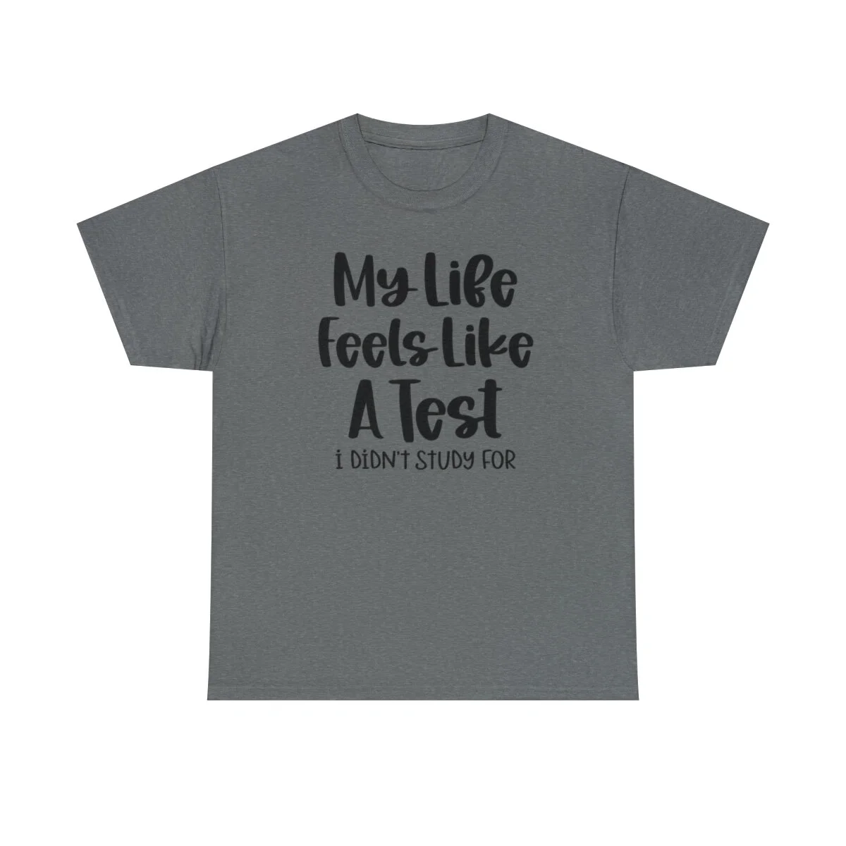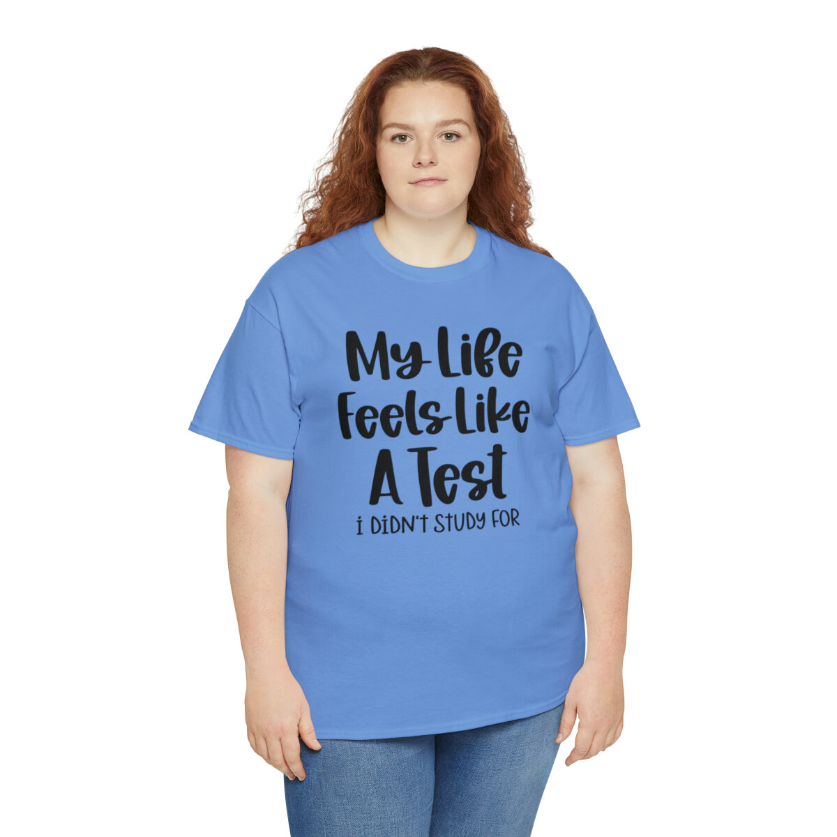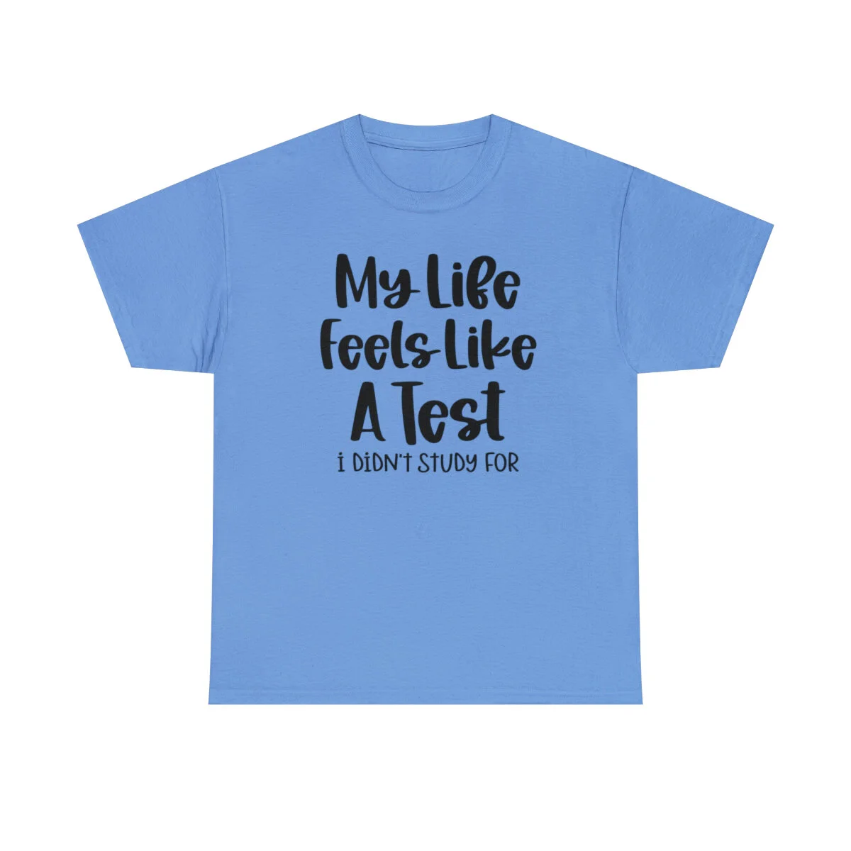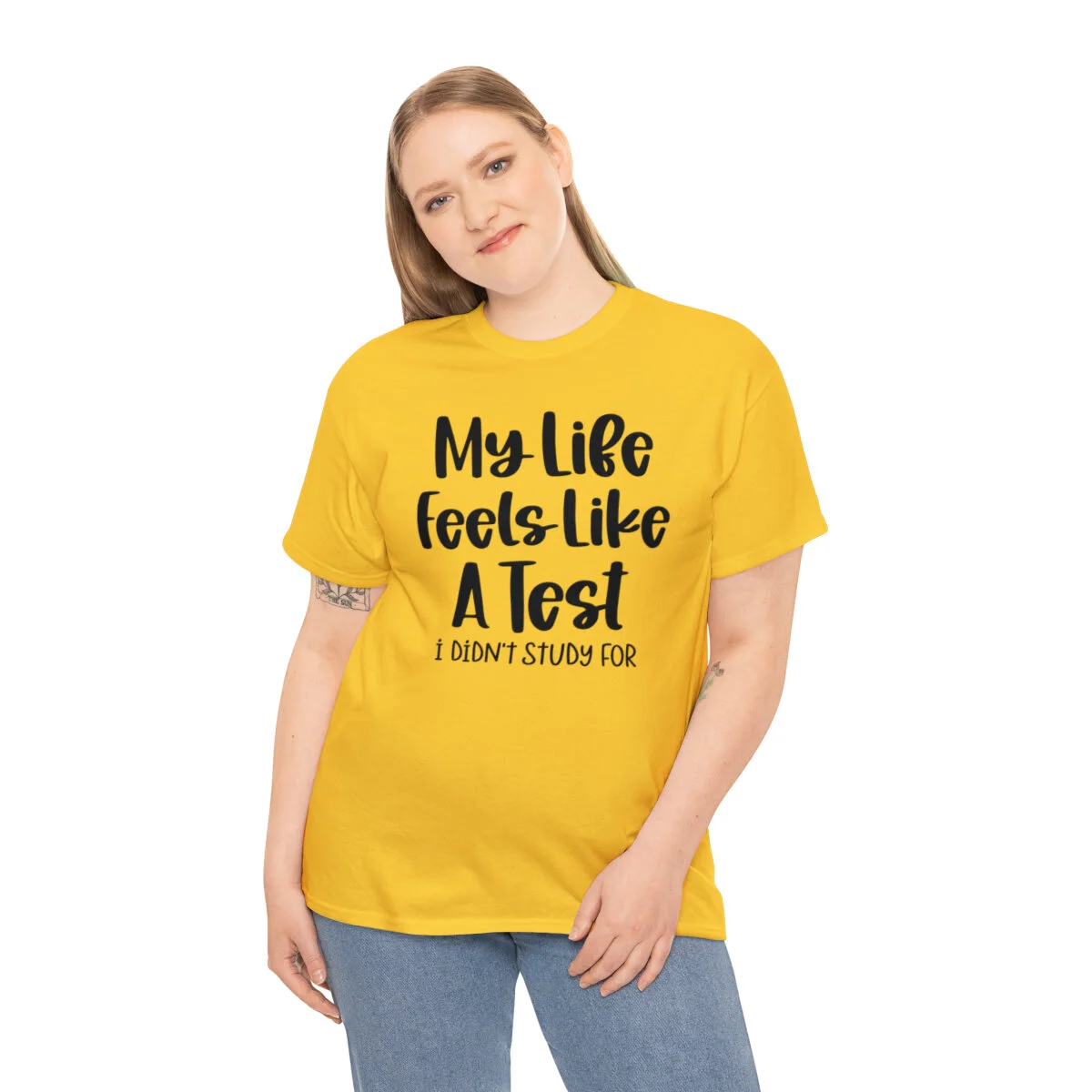 The design features a clever arrangement of text, with the phrase "My life feels like a test I didn't study for" showcased prominently on the front of the shirt. The words are arranged in a visually appealing manner, drawing attention and inviting contemplation.