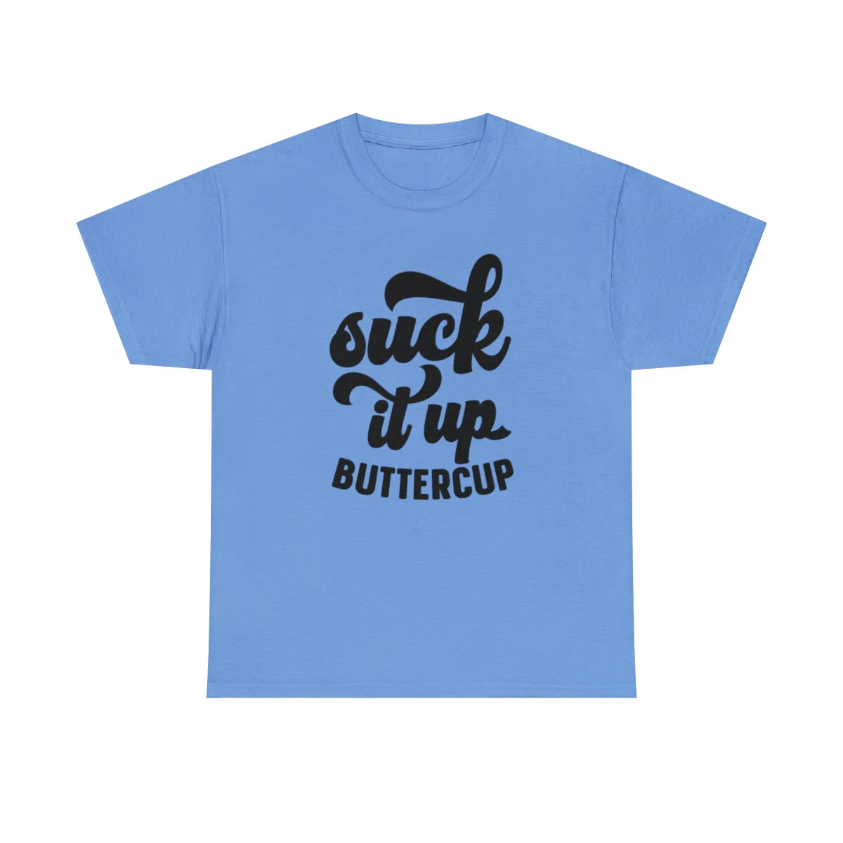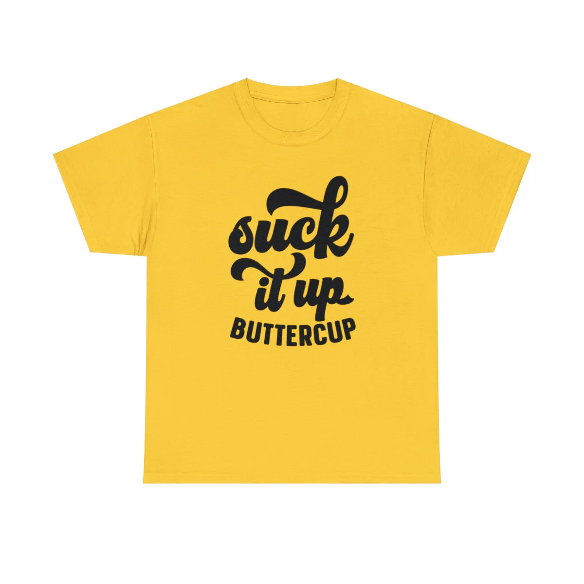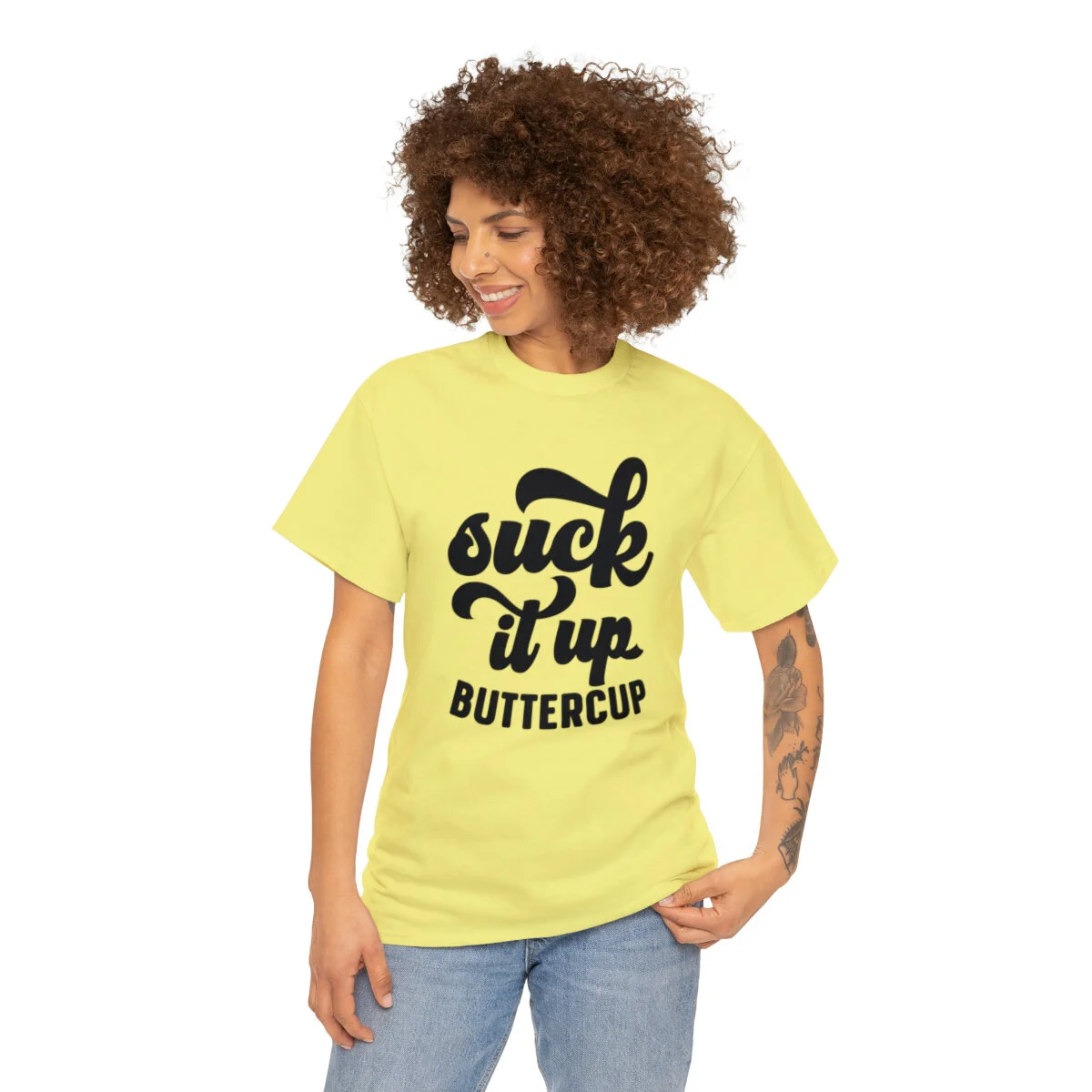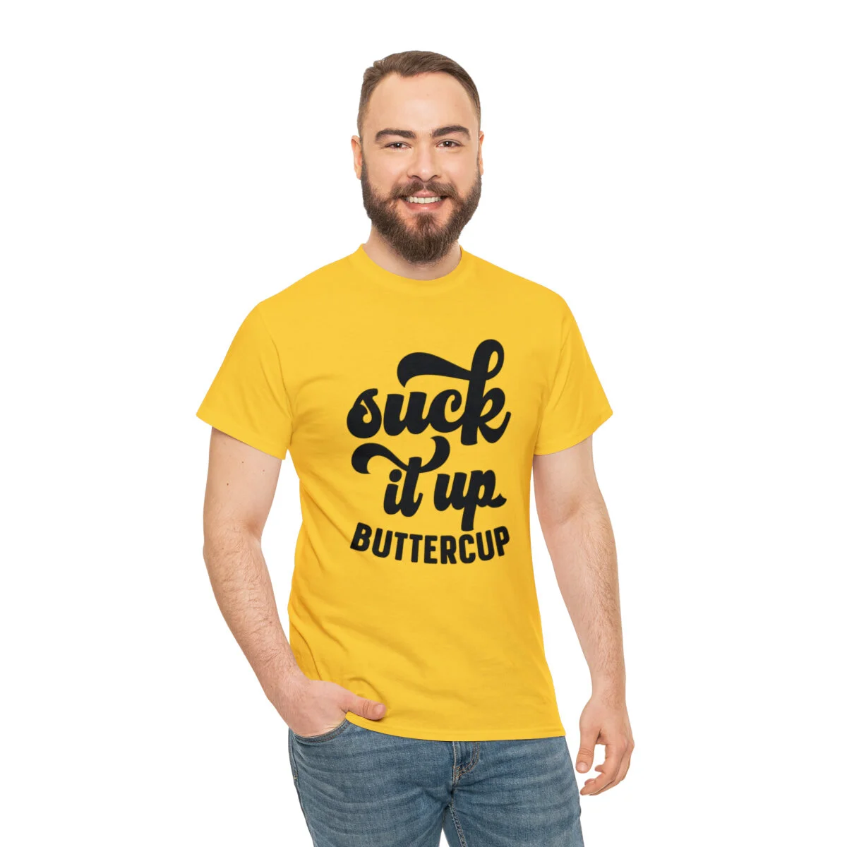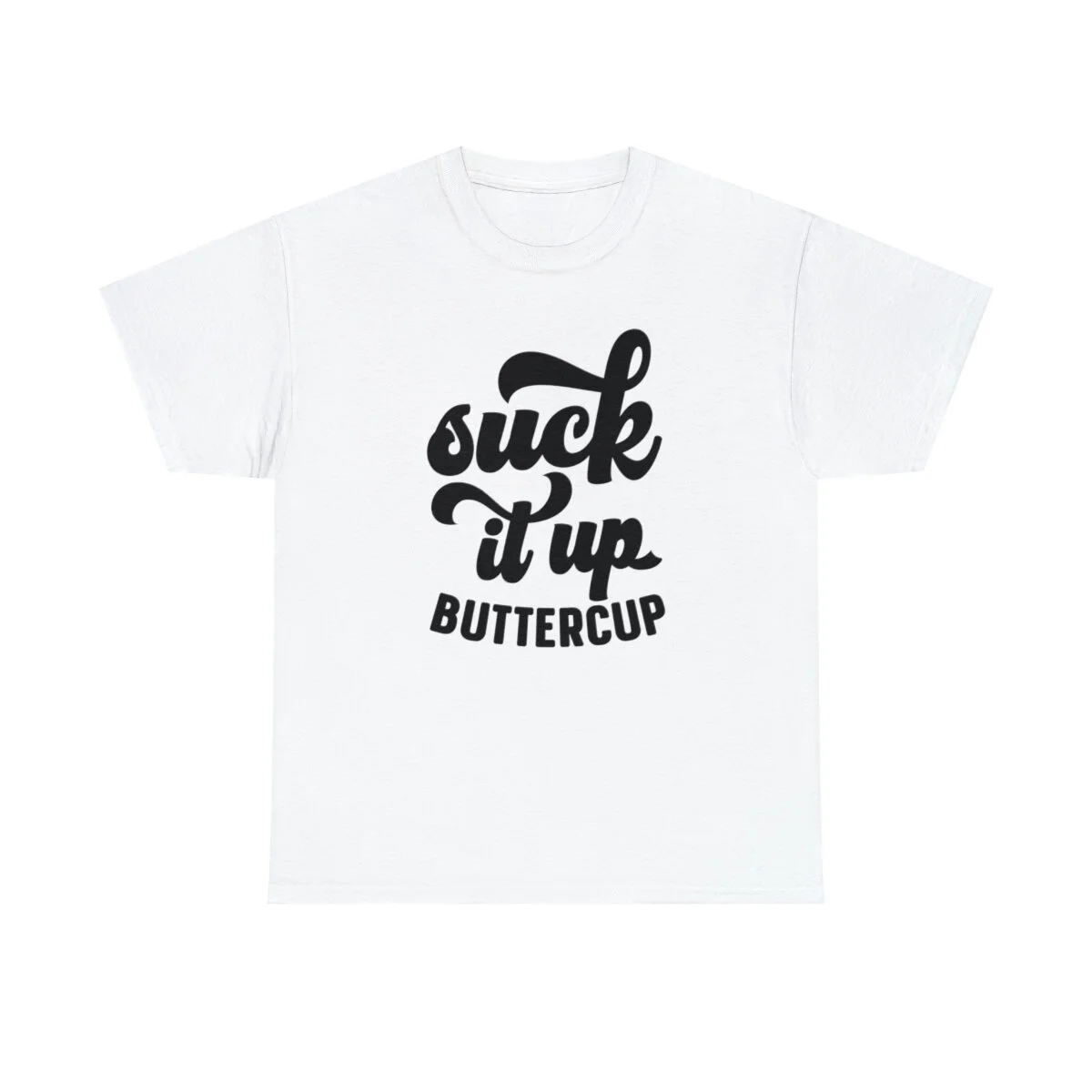Crafted with care, this t-shirt is made from high-quality fabric to ensure exceptional comfort and durability. The design features the assertive phrase, "Suck it up, buttercup," boldly displayed in multiple colors. Choose from a variety of vibrant options, including red, blue, yellow, or classic black and white, to match your personal style.
