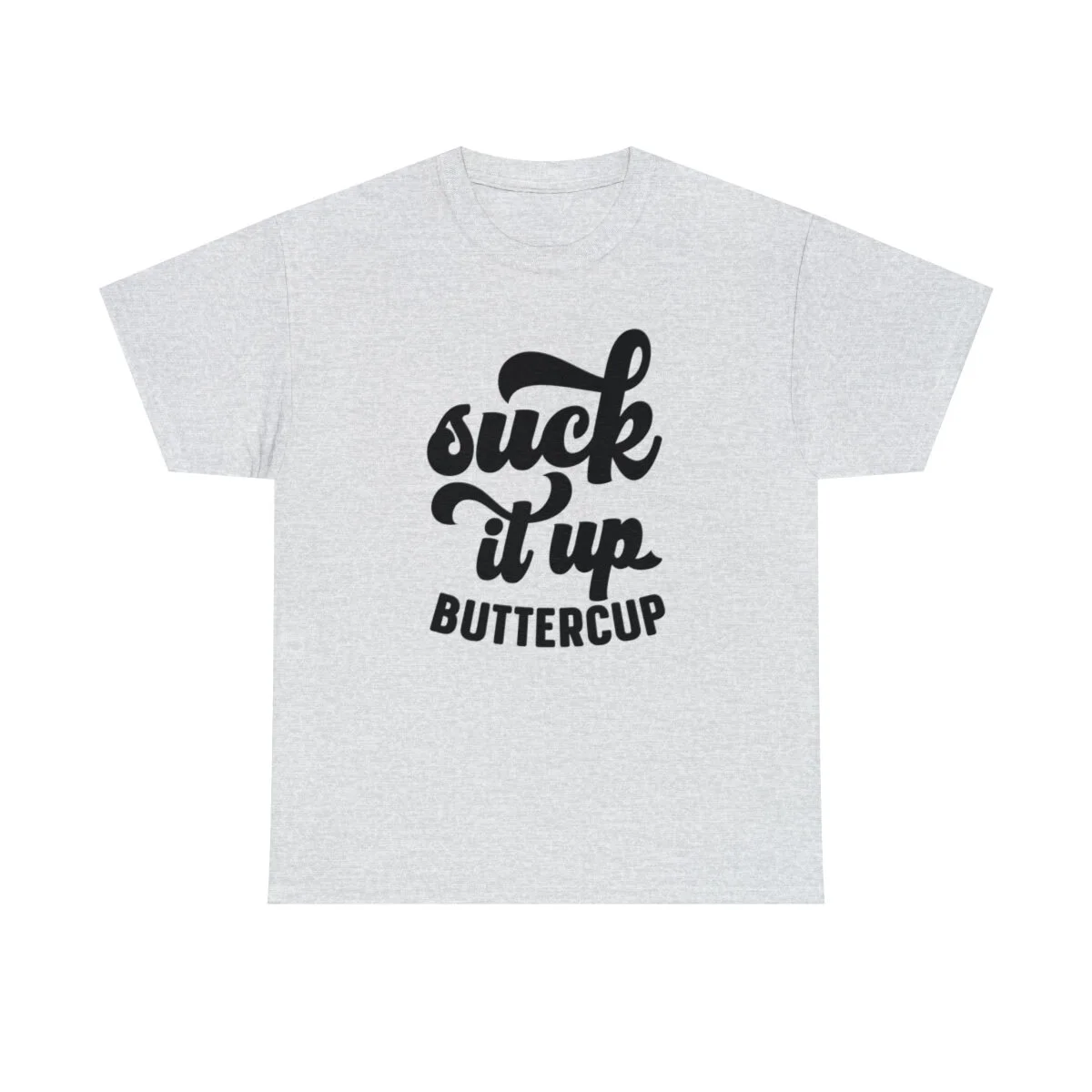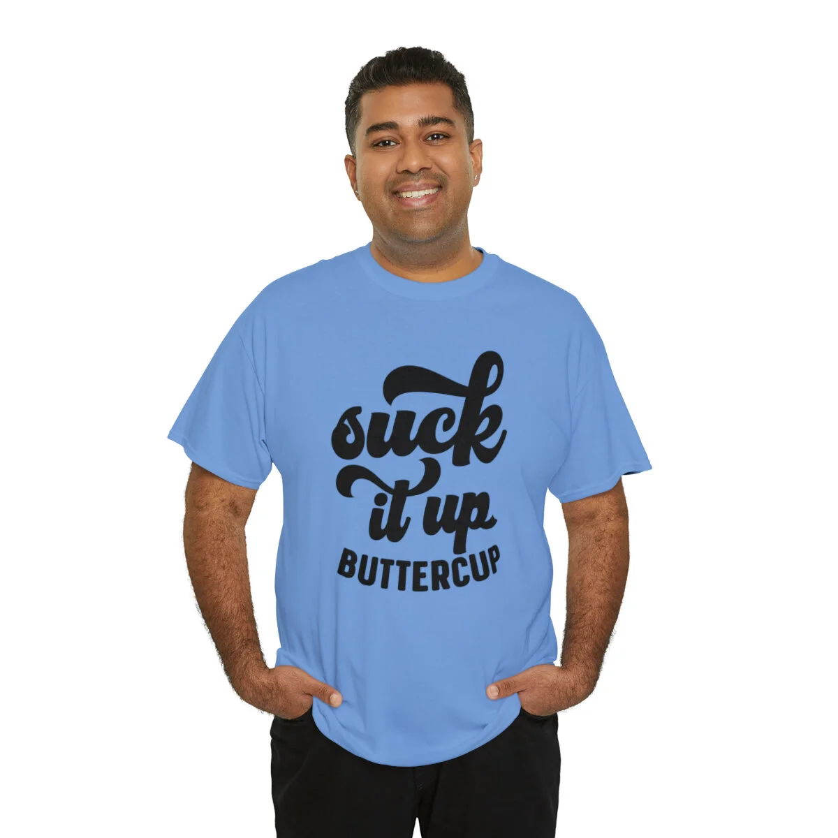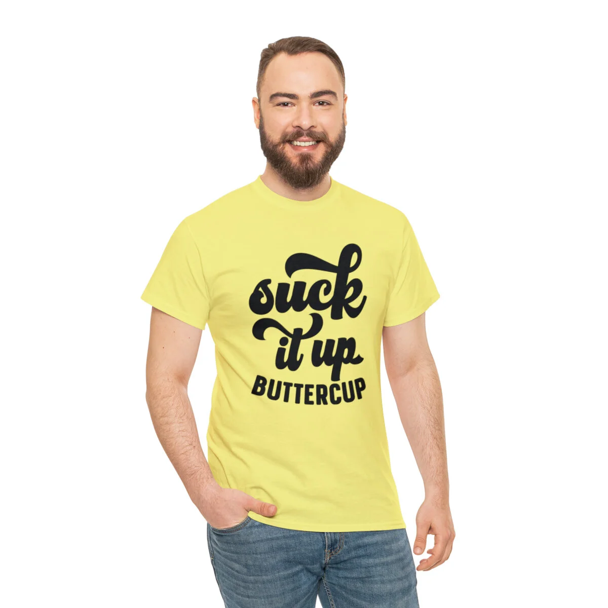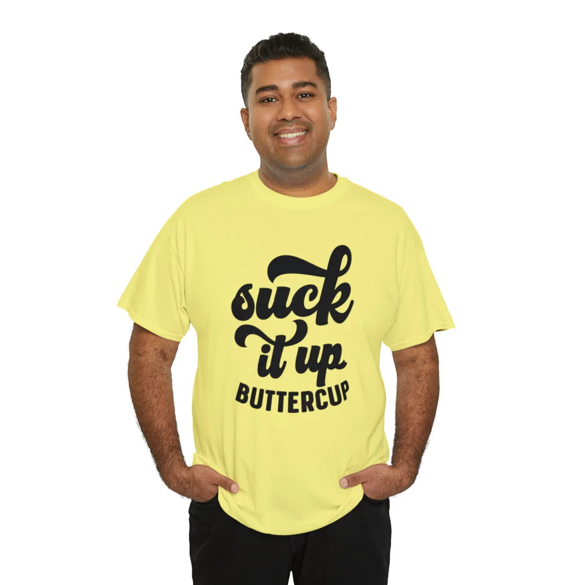 Crafted with care, this t-shirt is made from high-quality fabric to ensure exceptional comfort and durability. The design features the assertive phrase, "Suck it up, buttercup," boldly displayed in multiple colors. Choose from a variety of vibrant options, including red, blue, yellow, or classic black and white, to match your personal style.