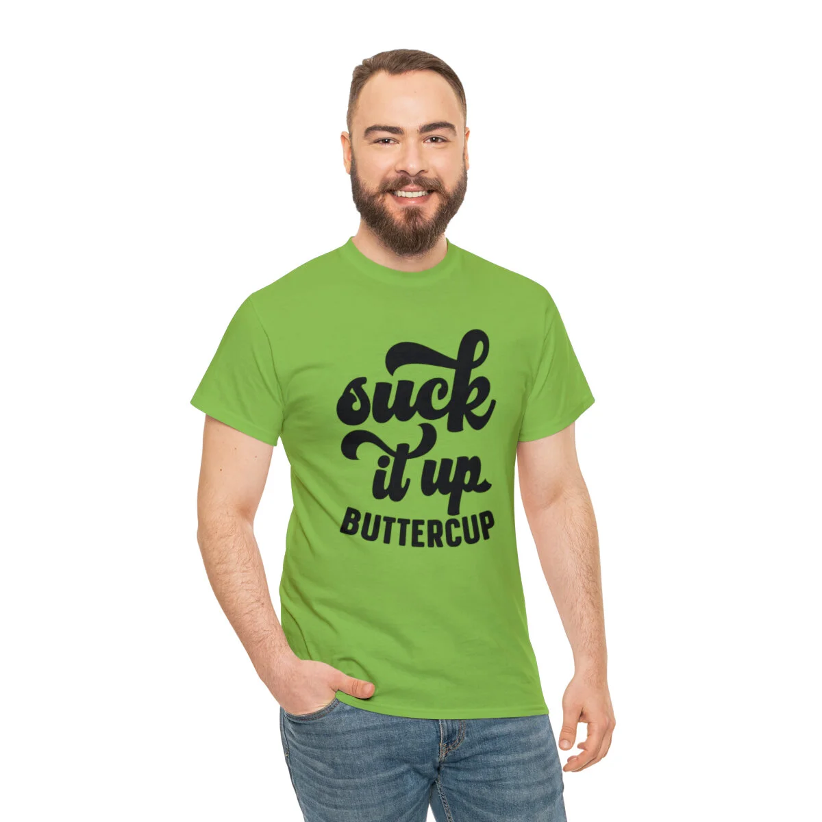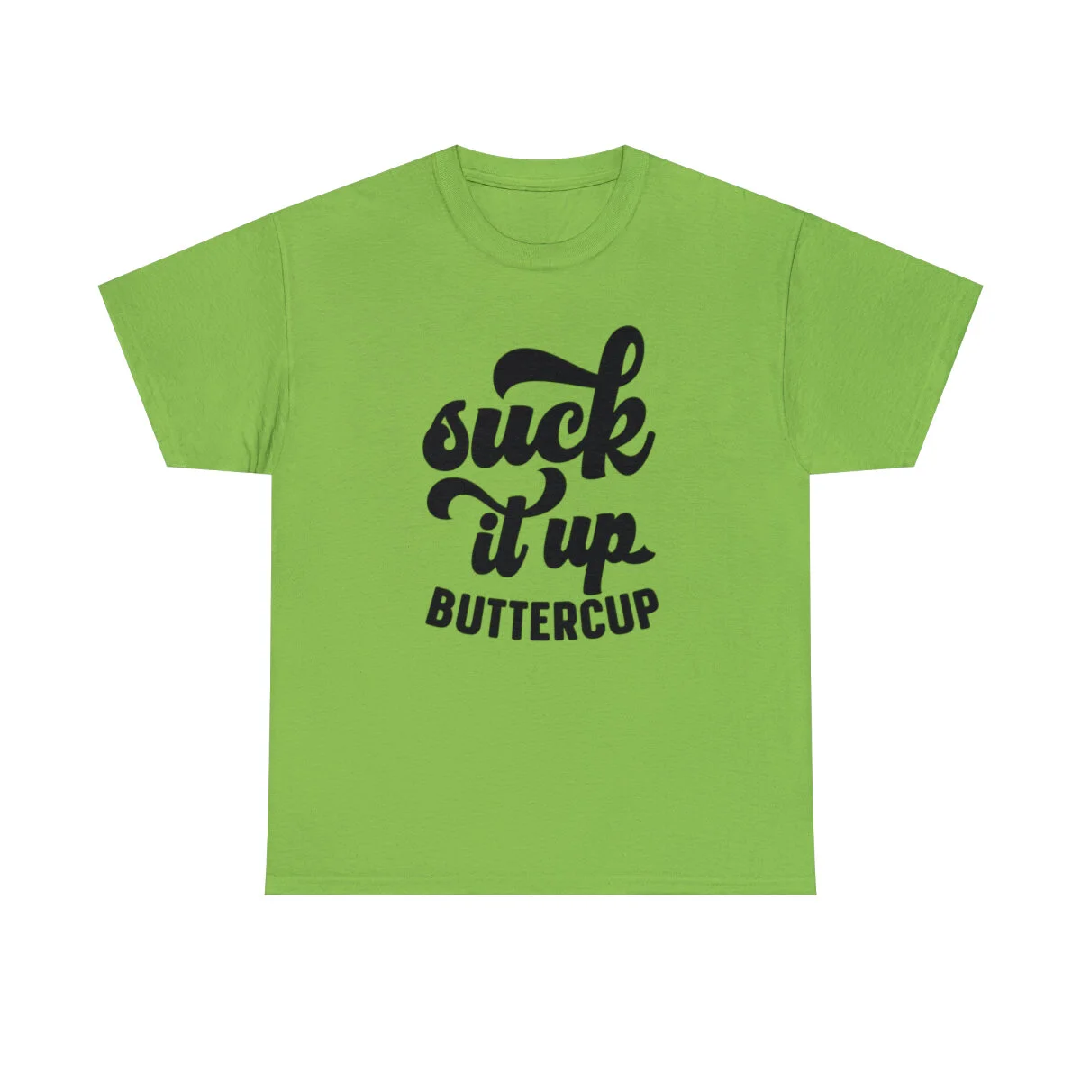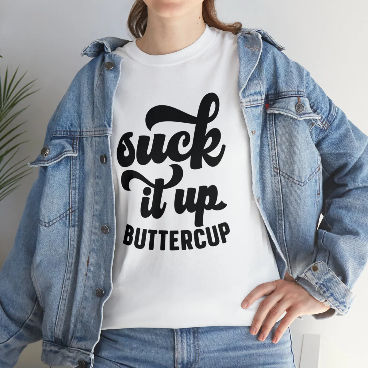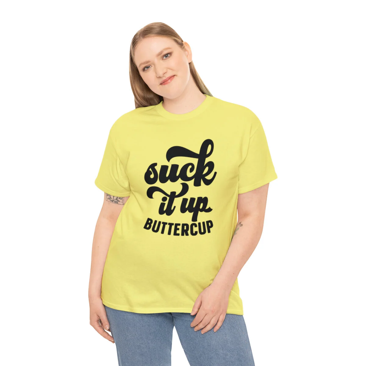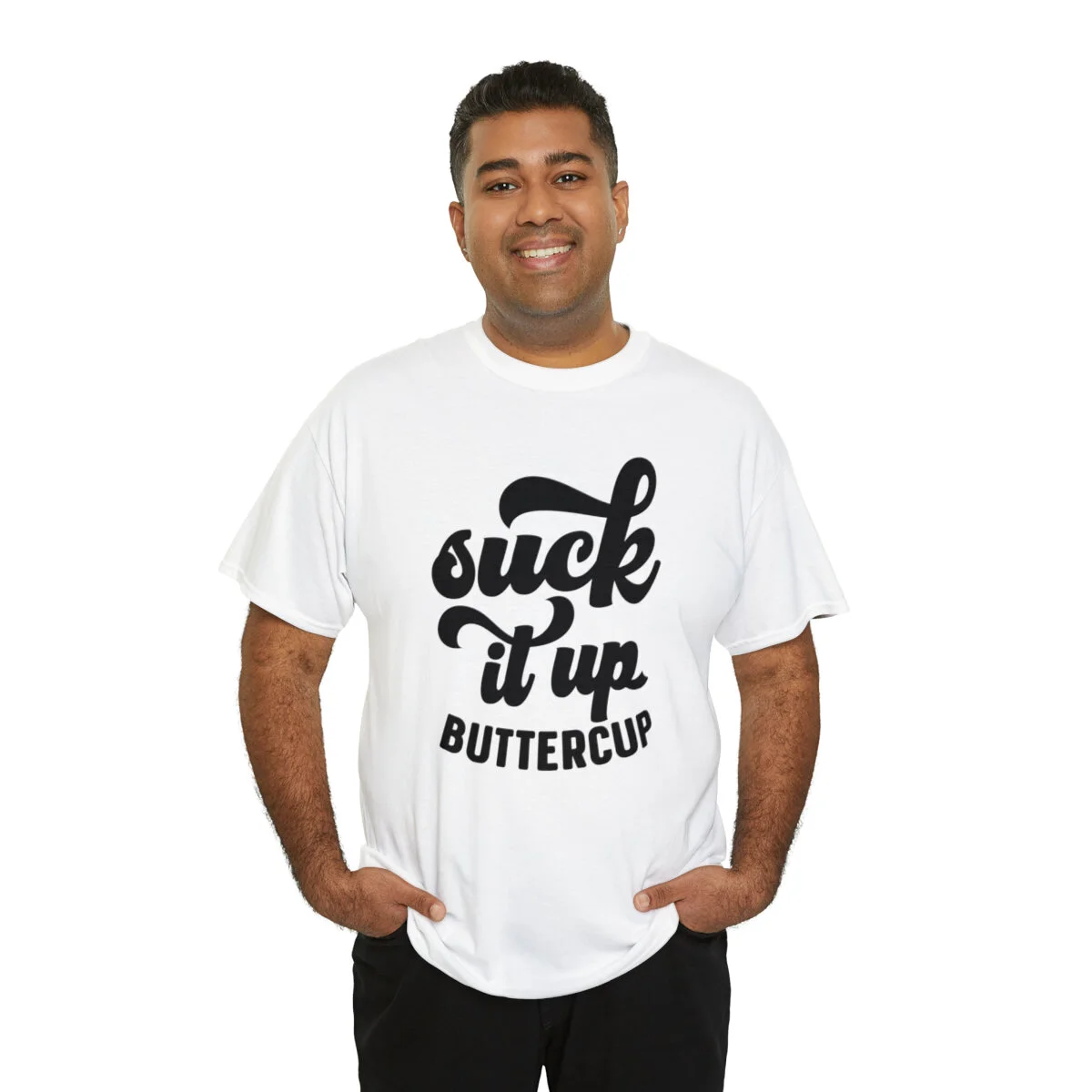 Crafted with care, this t-shirt is made from high-quality fabric to ensure exceptional comfort and durability. The design features the assertive phrase, "Suck it up, buttercup," boldly displayed in multiple colors. Choose from a variety of vibrant options, including red, blue, yellow, or classic black and white, to match your personal style.
