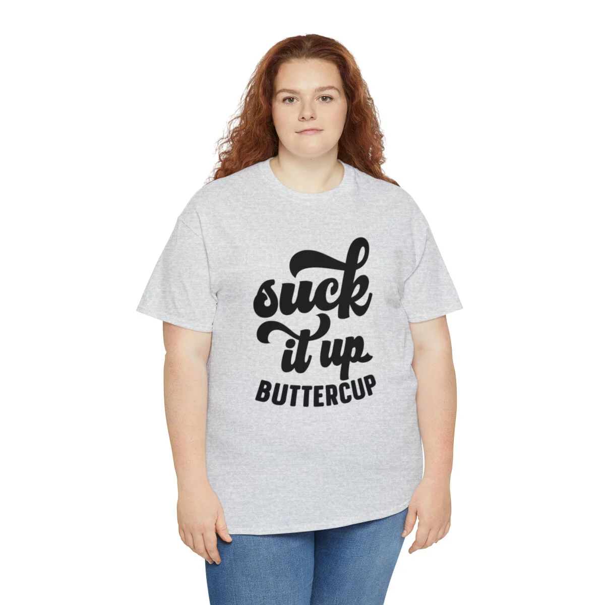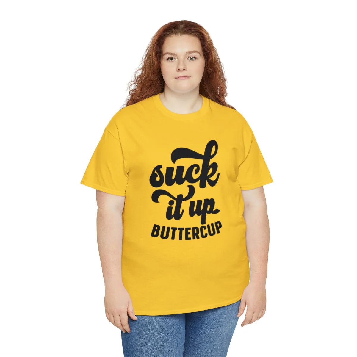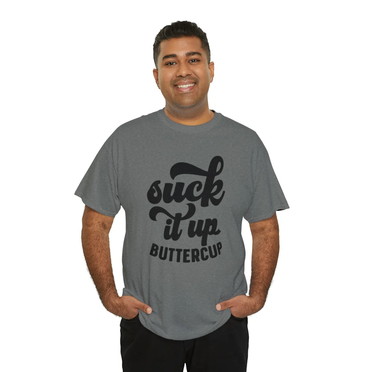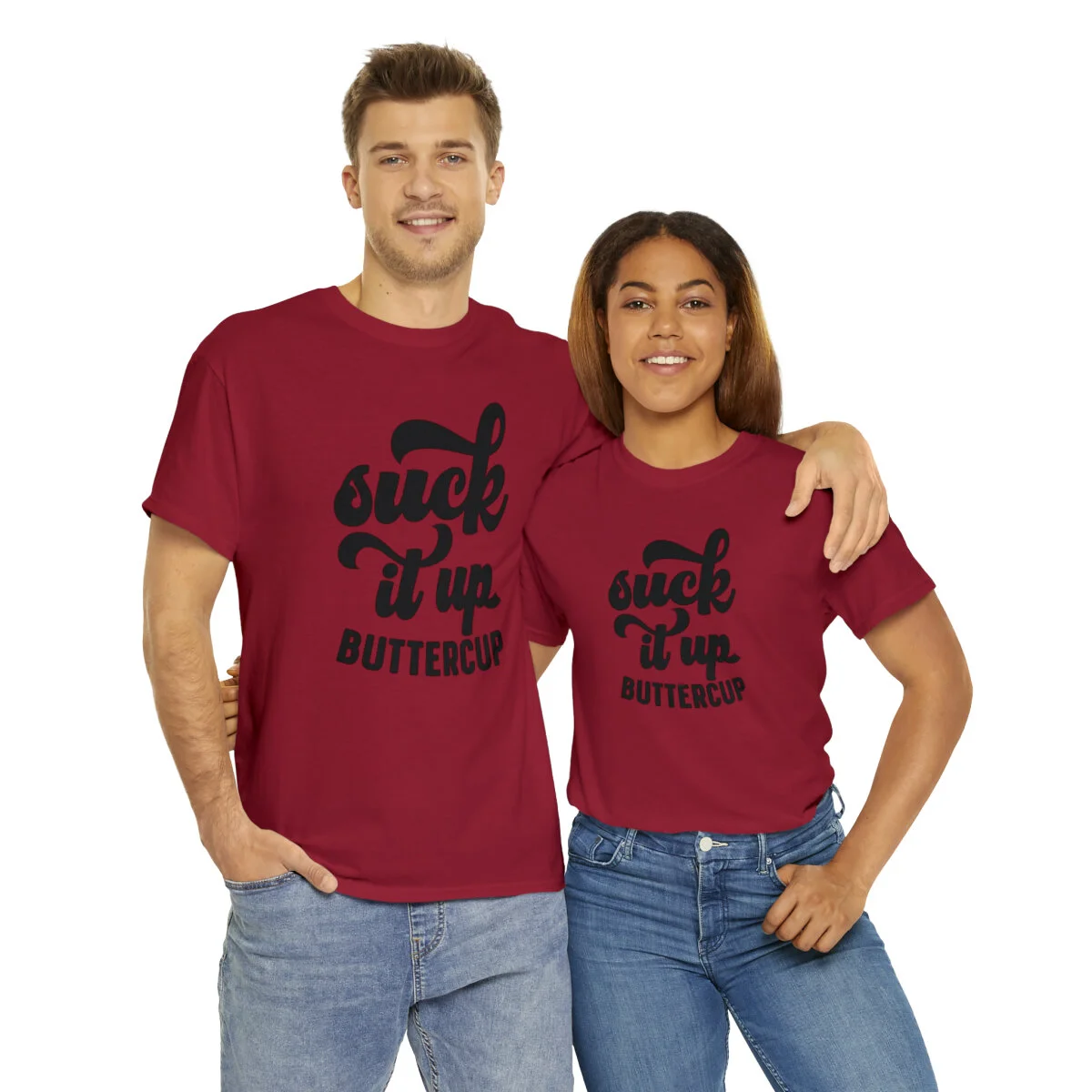 Crafted with care, this t-shirt is made from high-quality fabric to ensure exceptional comfort and durability. The design features the assertive phrase, "Suck it up, buttercup," boldly displayed in multiple colors. Choose from a variety of vibrant options, including red, blue, yellow, or classic black and white, to match your personal style.