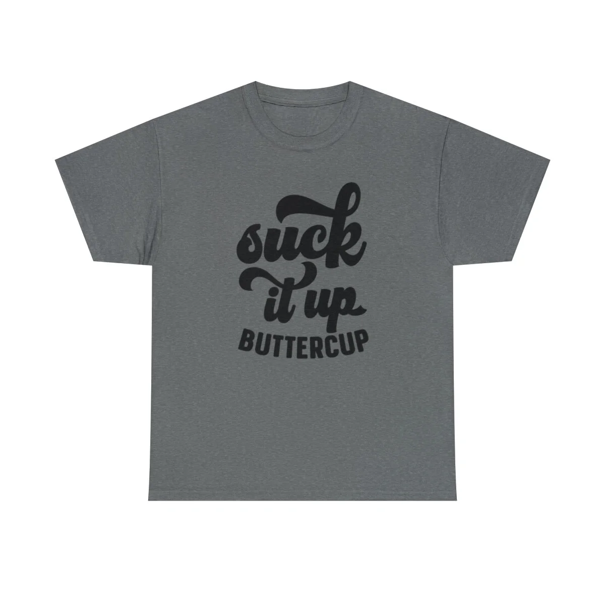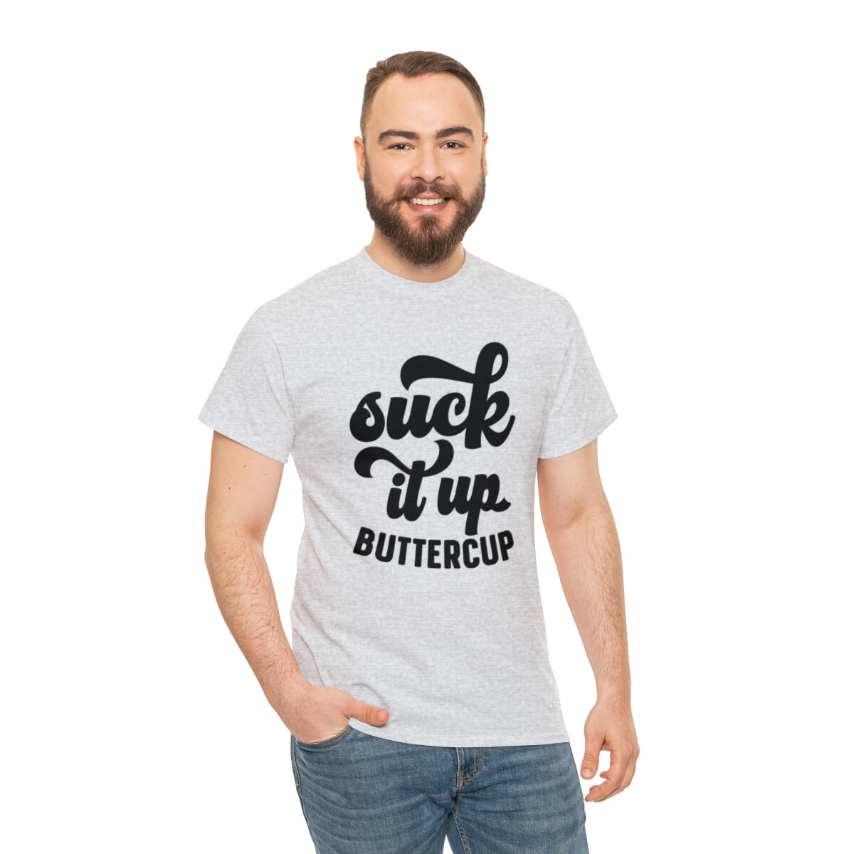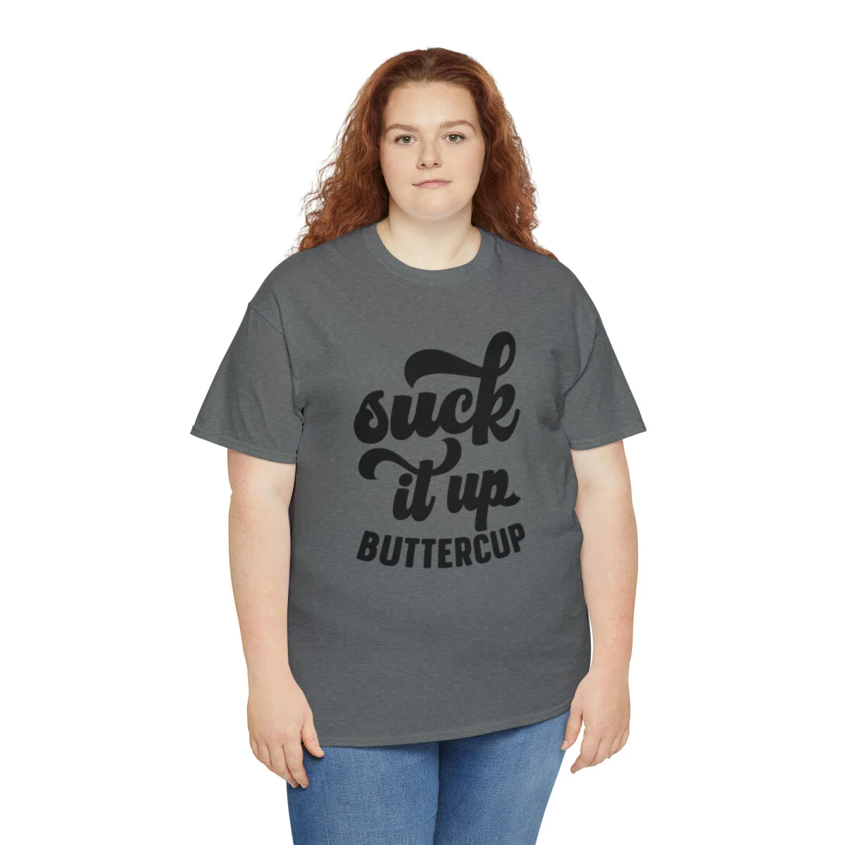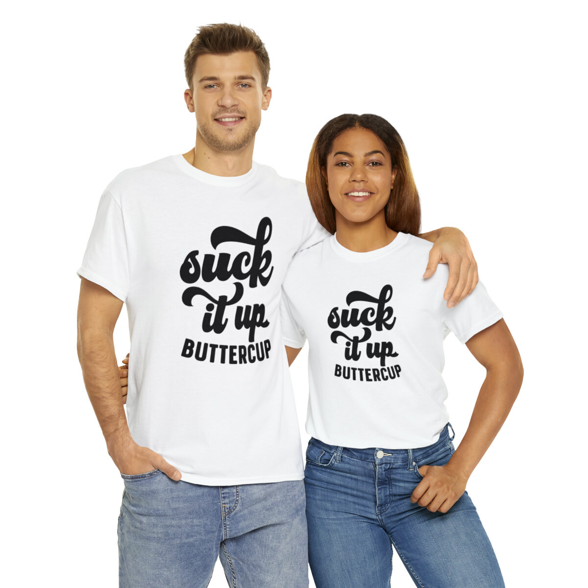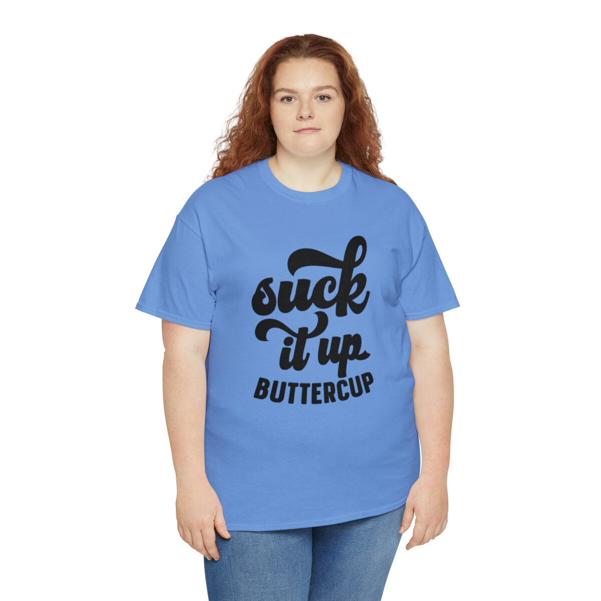 Crafted with care, this t-shirt is made from high-quality fabric to ensure exceptional comfort and durability. The design features the assertive phrase, "Suck it up, buttercup," boldly displayed in multiple colors. Choose from a variety of vibrant options, including red, blue, yellow, or classic black and white, to match your personal style.