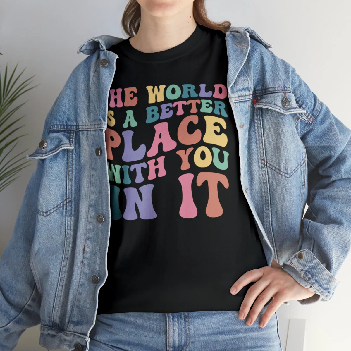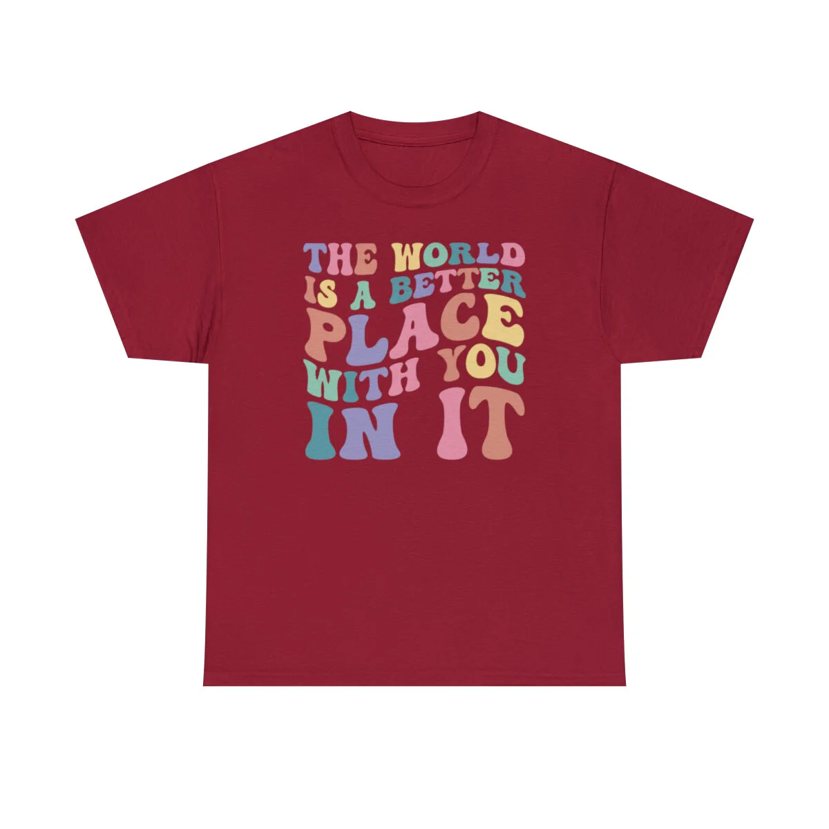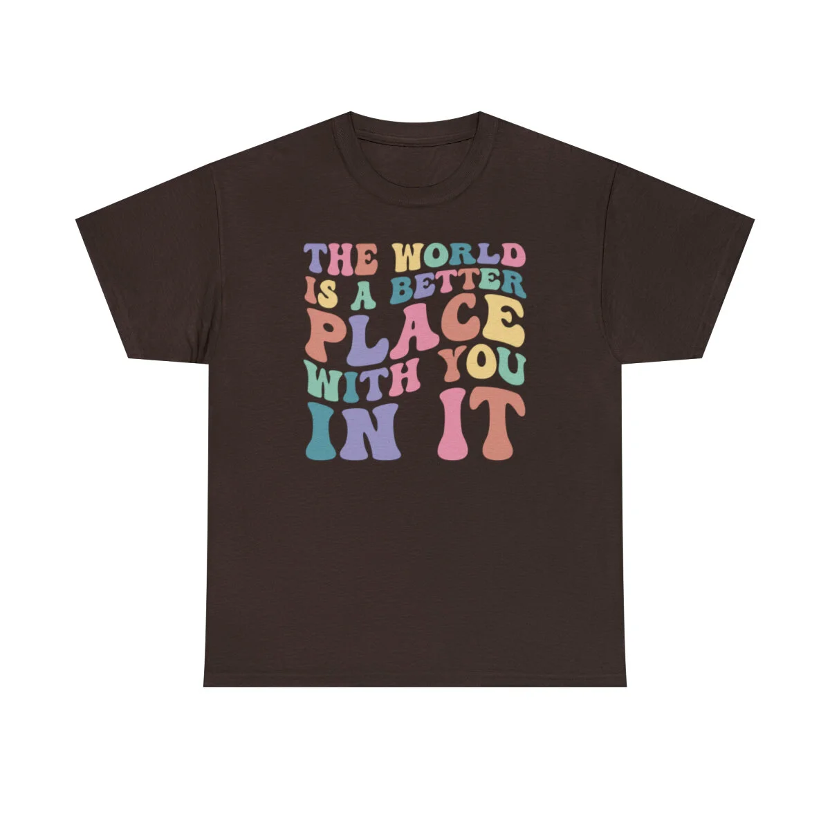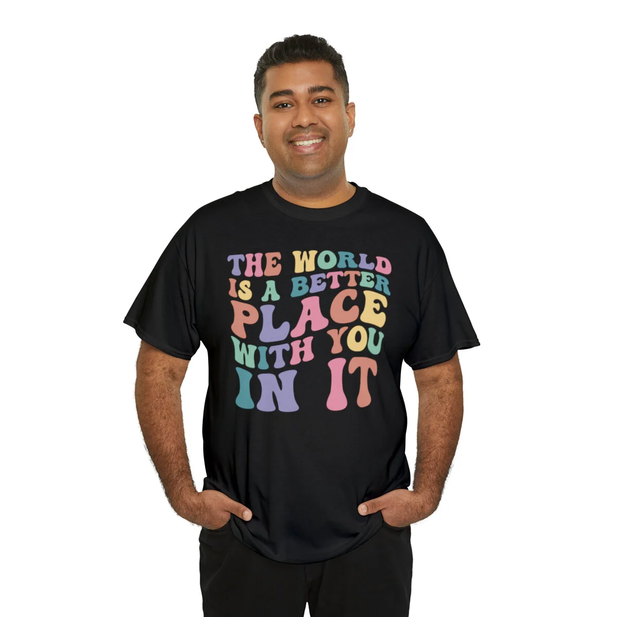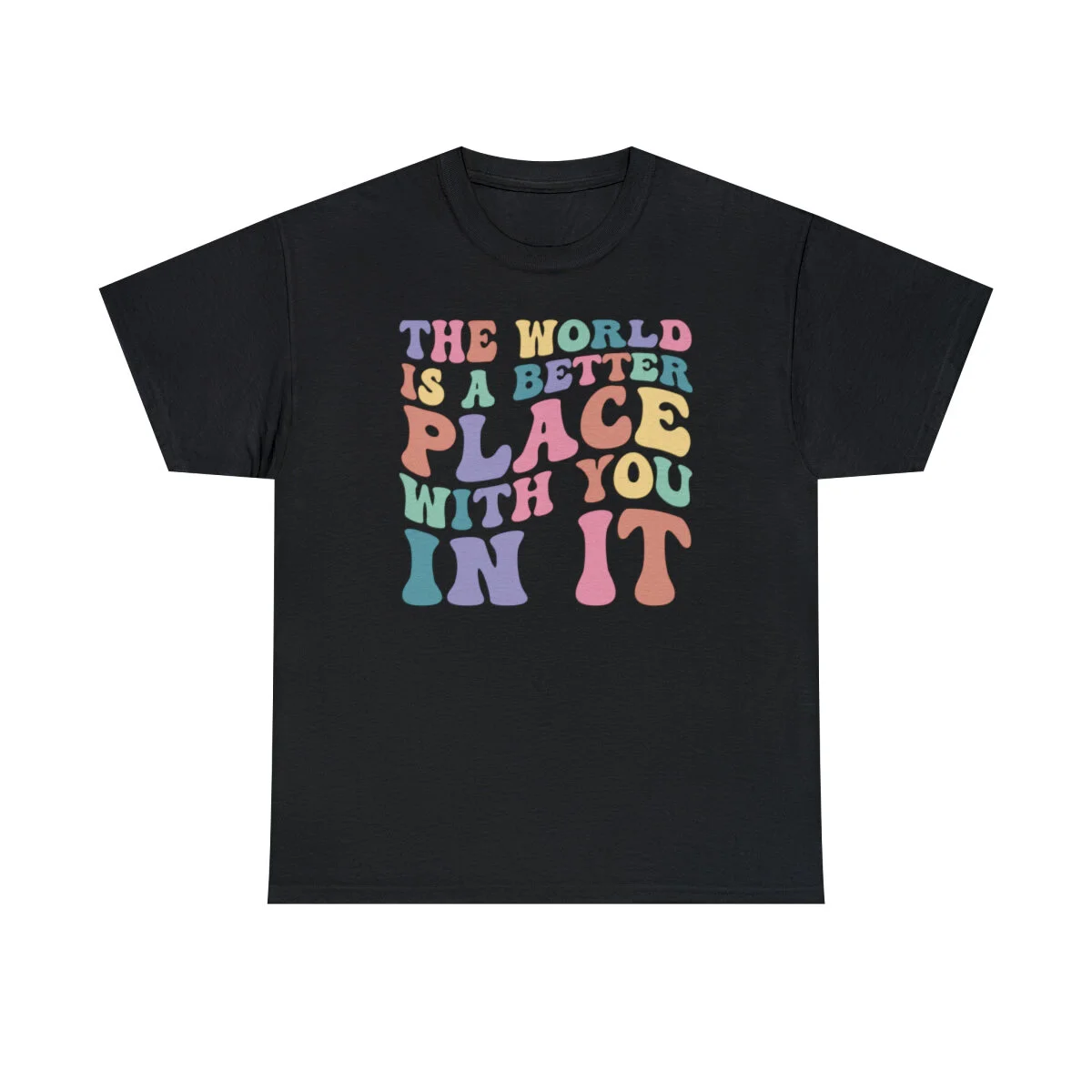Crafted with care, this t-shirt is made from high-quality fabric to ensure exceptional comfort and durability. The design features the empowering phrase, "The world is better with you in it," elegantly displayed in multiple colors. Choose from a variety of vibrant options, including red, blue, yellow, or classic black and white, to express your personal style.