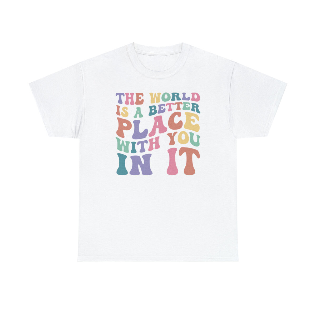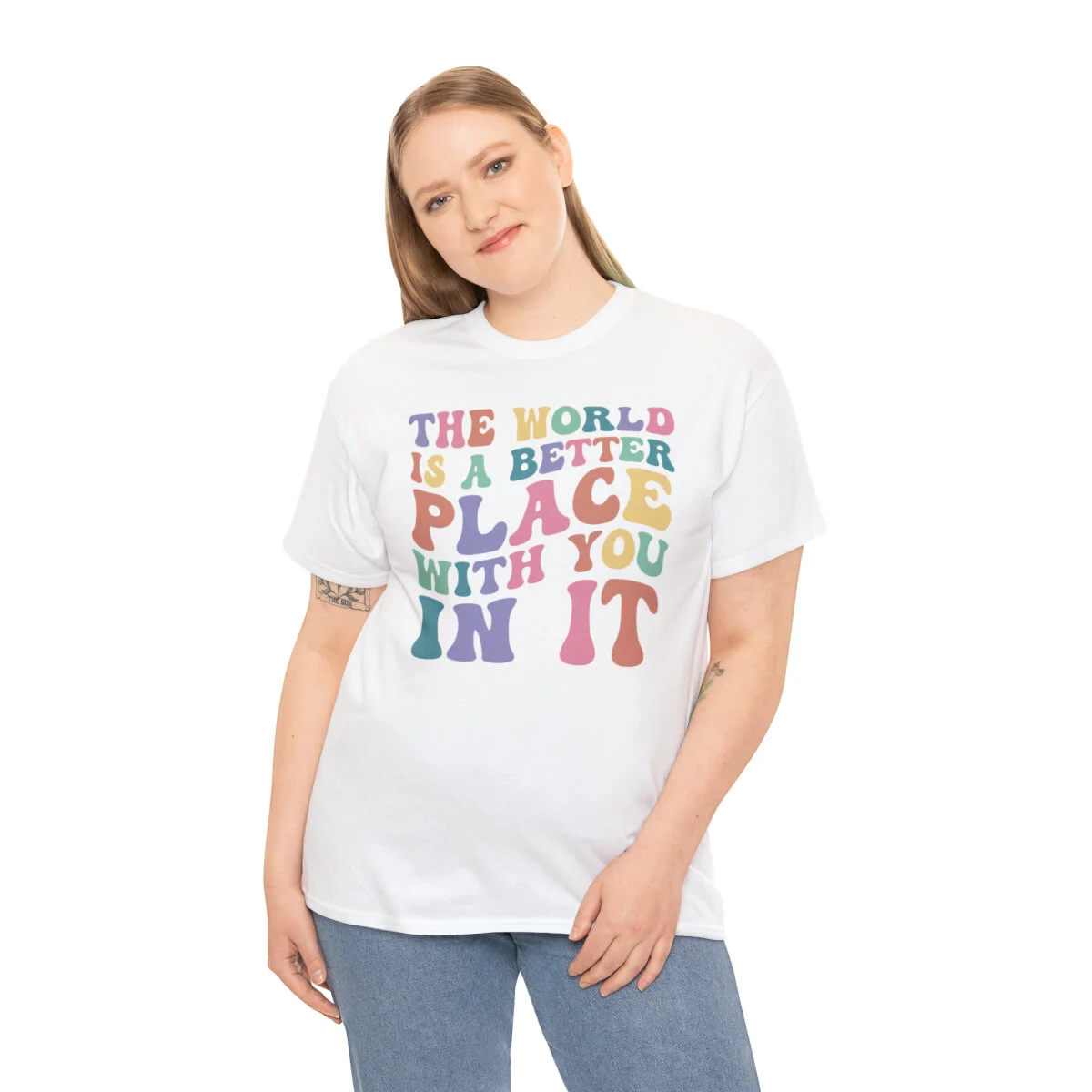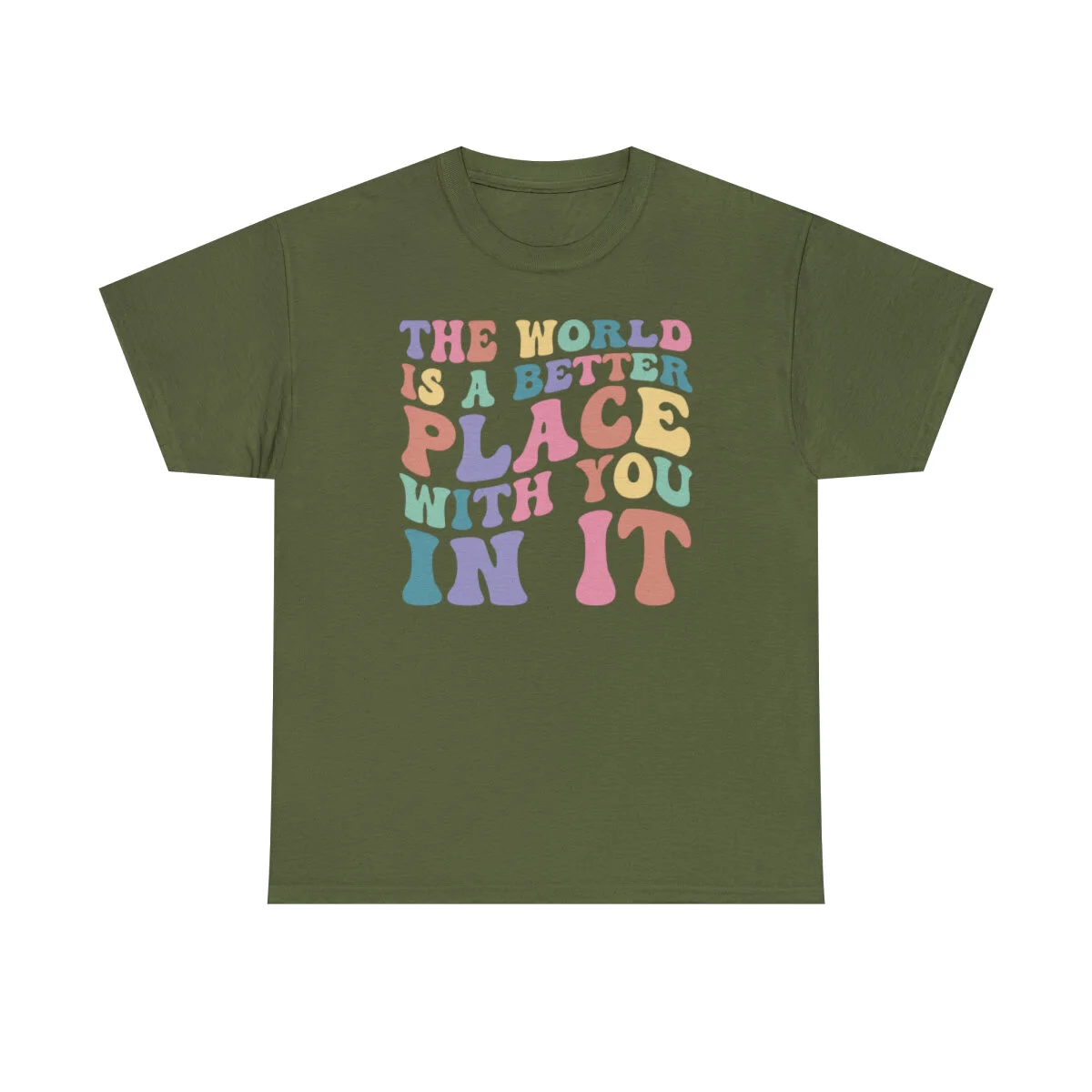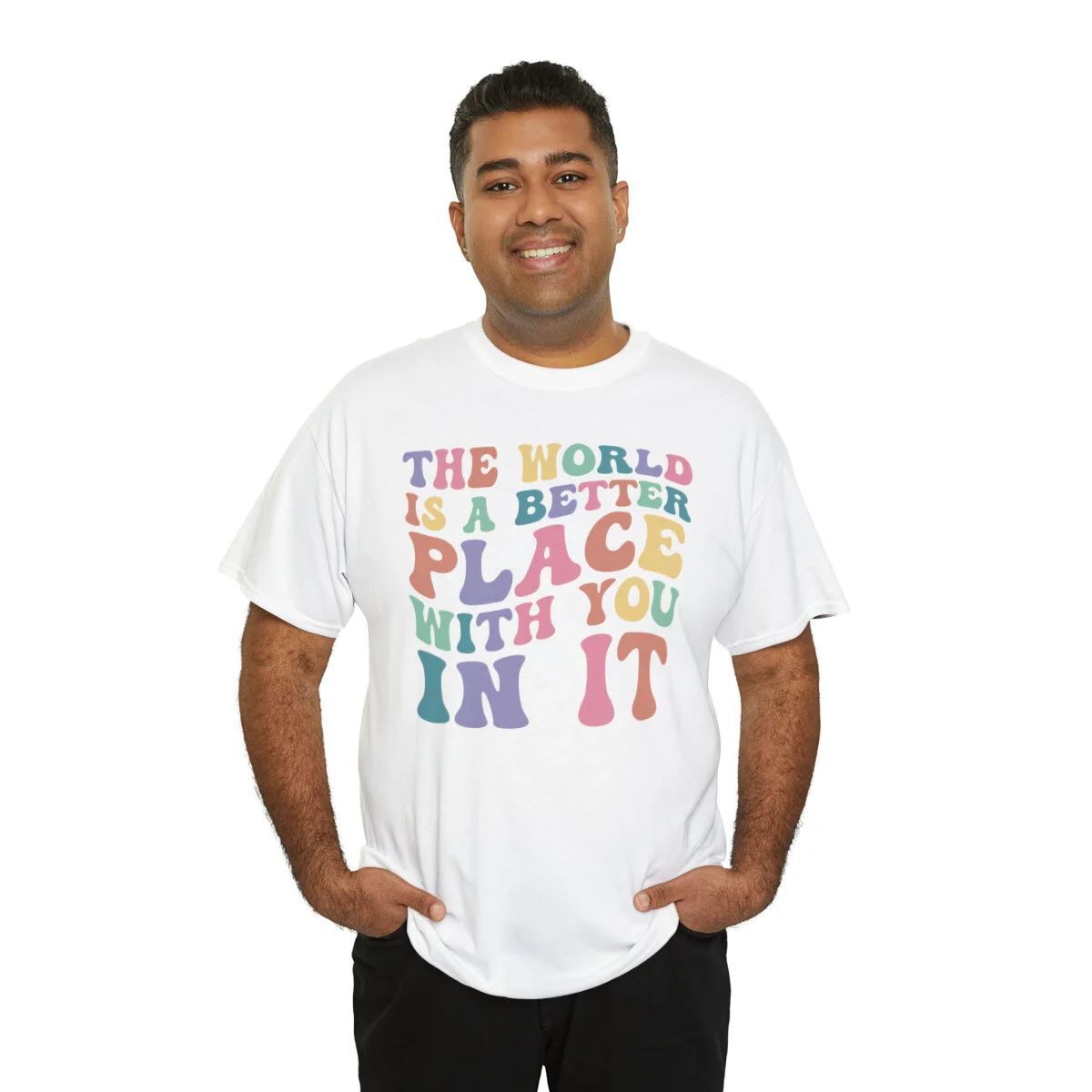 Crafted with care, this t-shirt is made from high-quality fabric to ensure exceptional comfort and durability. The design features the empowering phrase, "The world is better with you in it," elegantly displayed in multiple colors. Choose from a variety of vibrant options, including red, blue, yellow, or classic black and white, to express your personal style.
