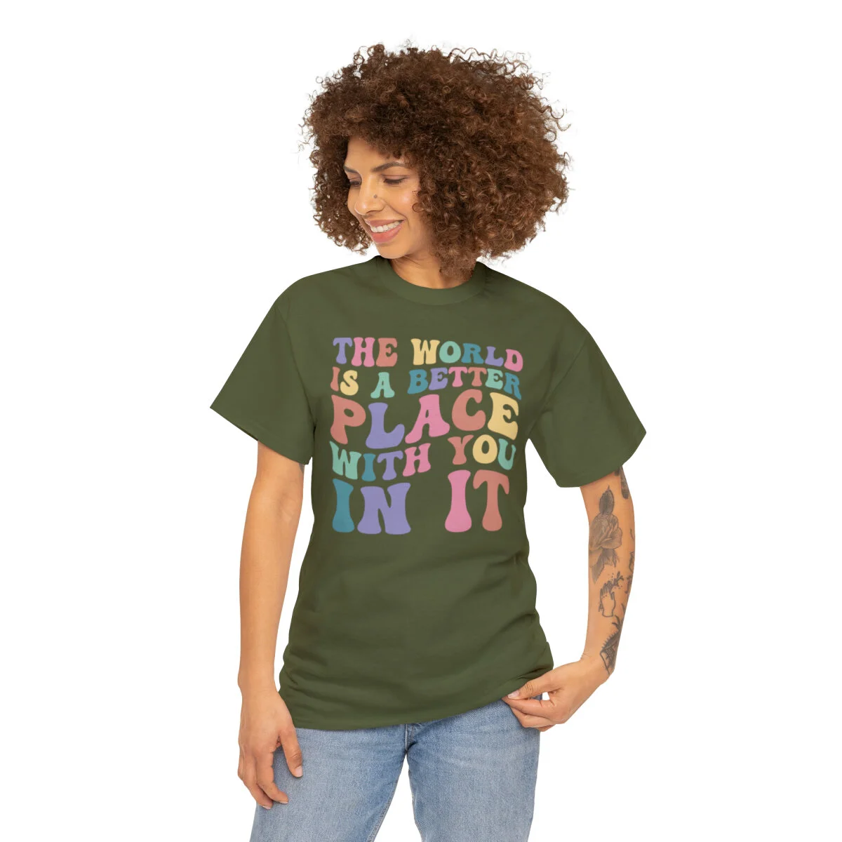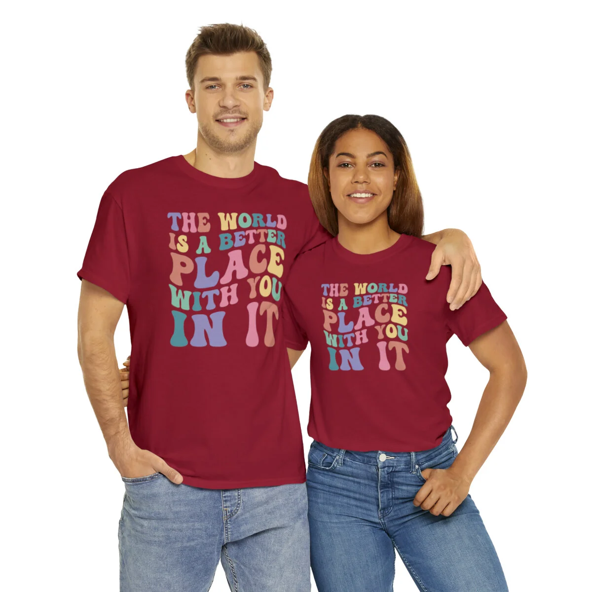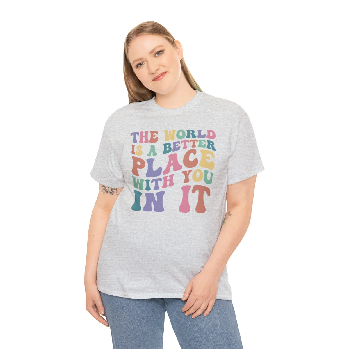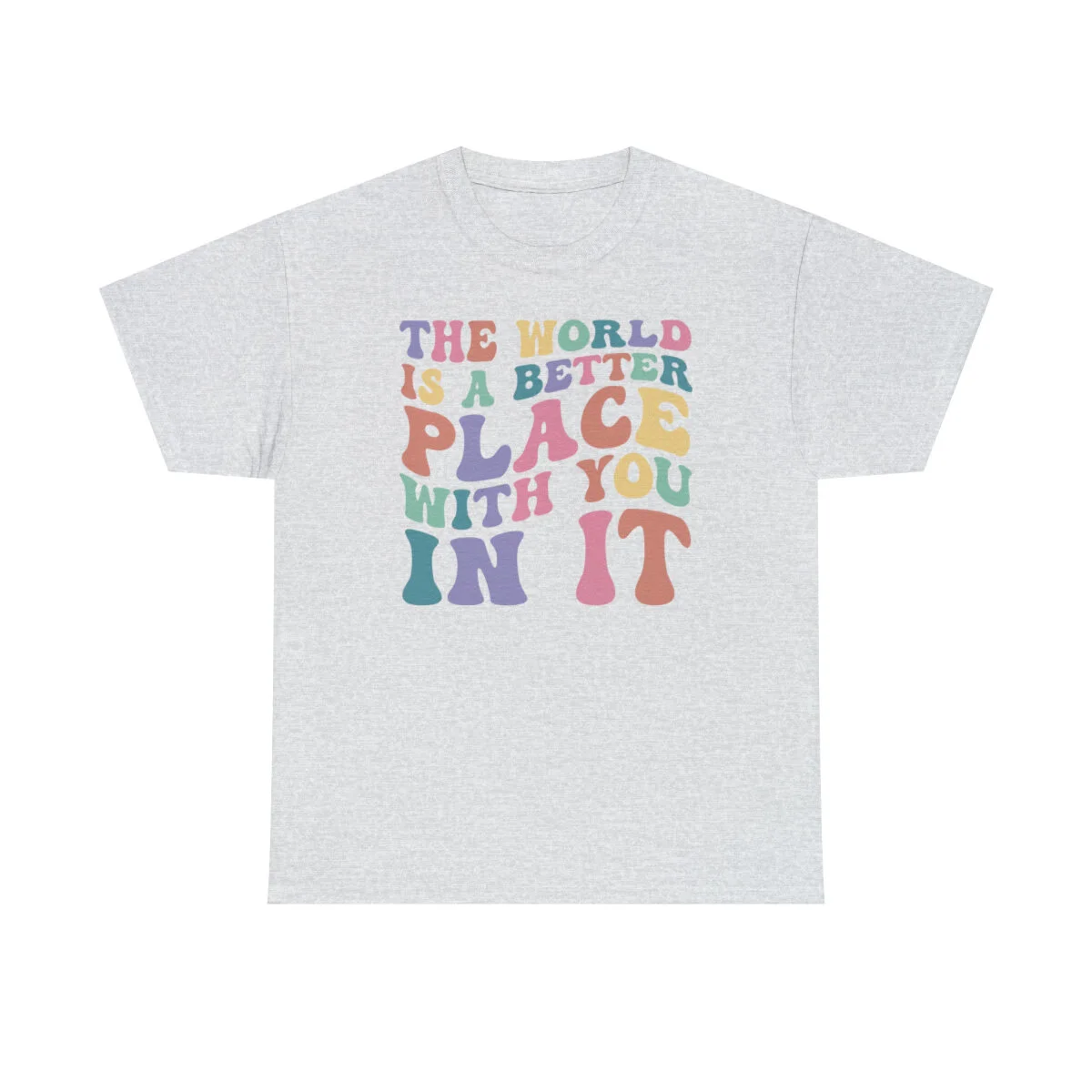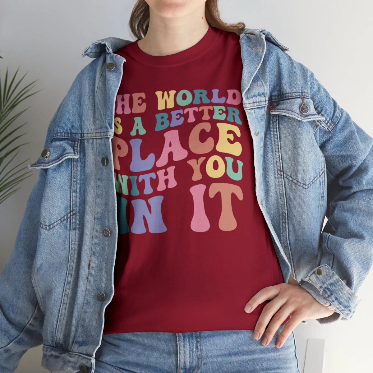Crafted with care, this t-shirt is made from high-quality fabric to ensure exceptional comfort and durability. The design features the empowering phrase, "The world is better with you in it," elegantly displayed in multiple colors. Choose from a variety of vibrant options, including red, blue, yellow, or classic black and white, to express your personal style.