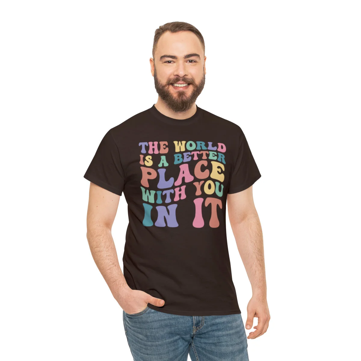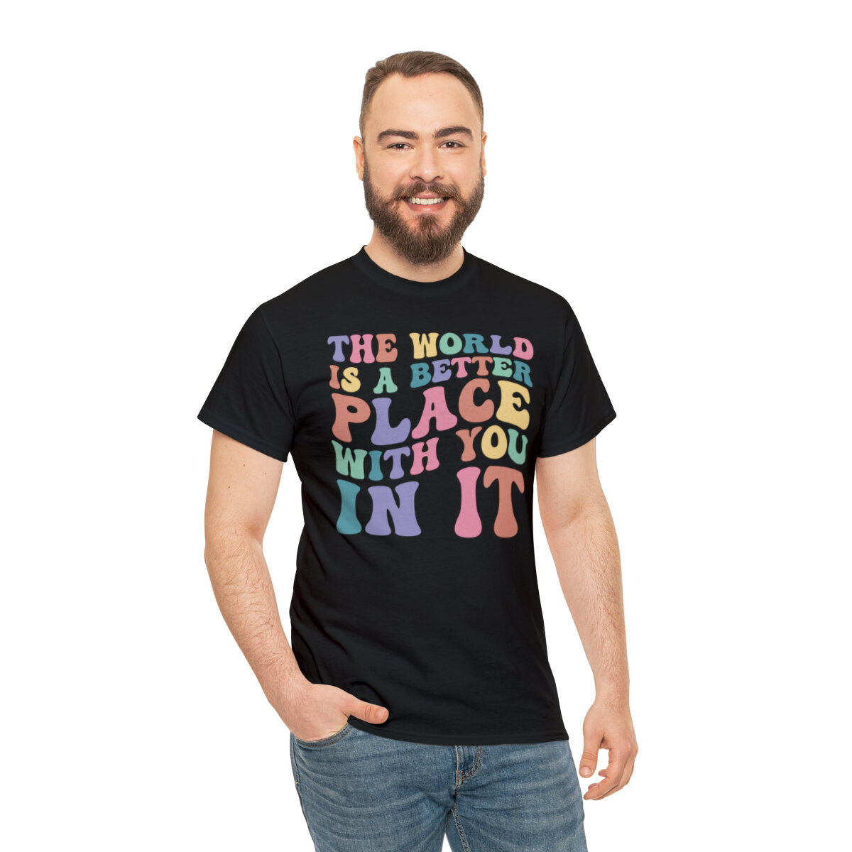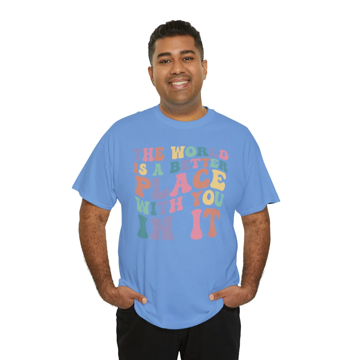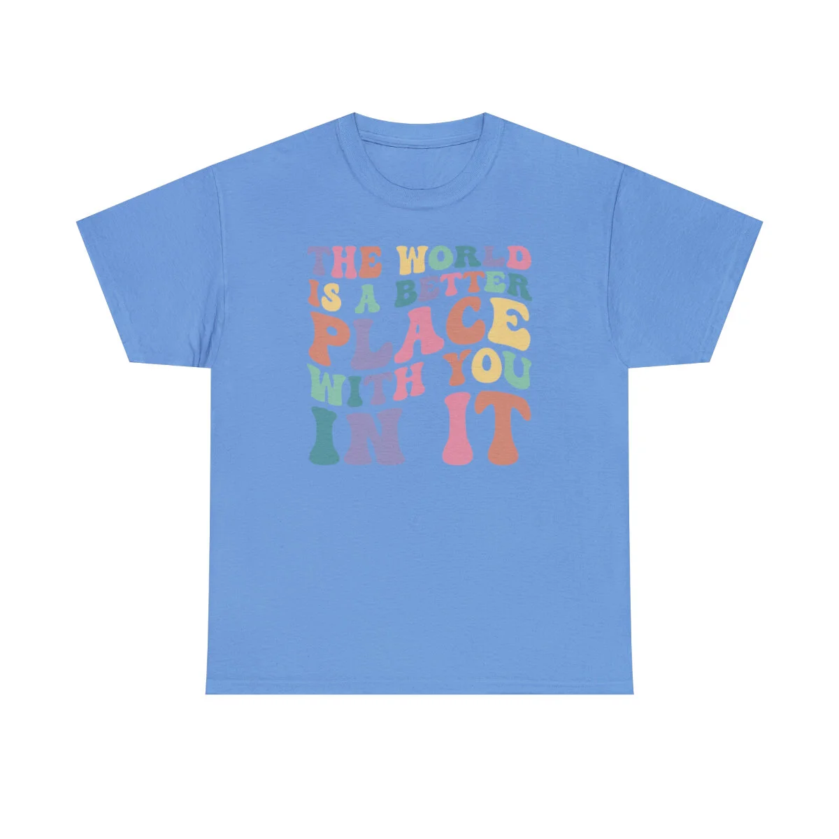 Crafted with care, this t-shirt is made from high-quality fabric to ensure exceptional comfort and durability. The design features the empowering phrase, "The world is better with you in it," elegantly displayed in multiple colors. Choose from a variety of vibrant options, including red, blue, yellow, or classic black and white, to express your personal style.