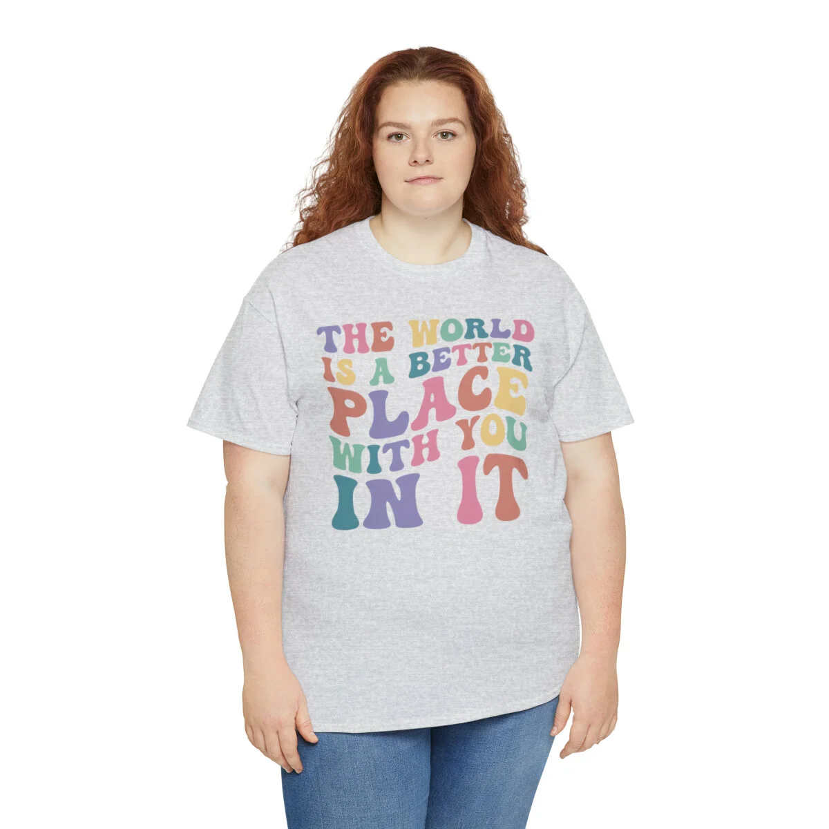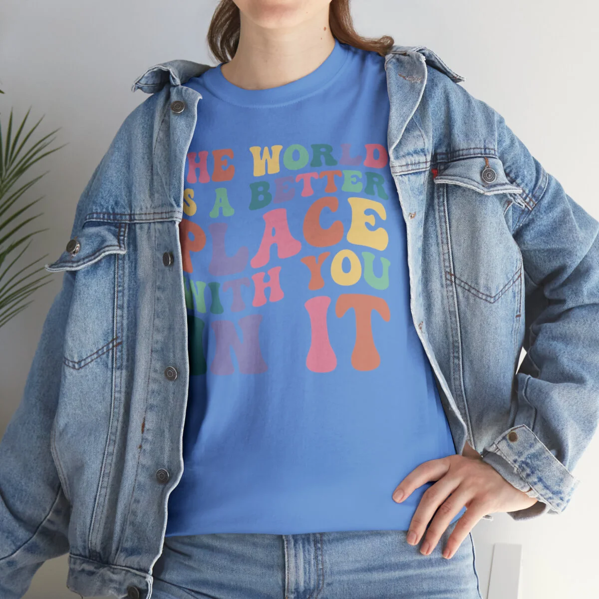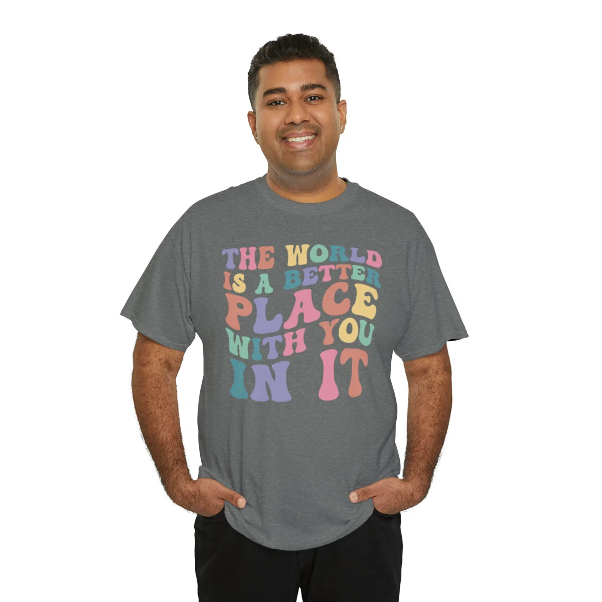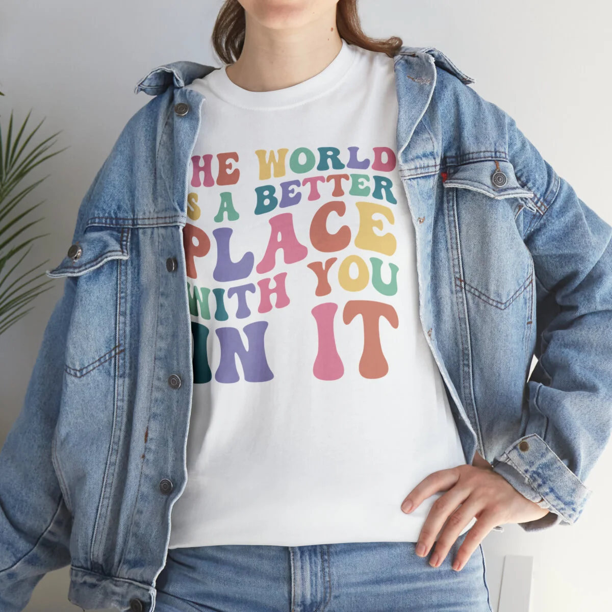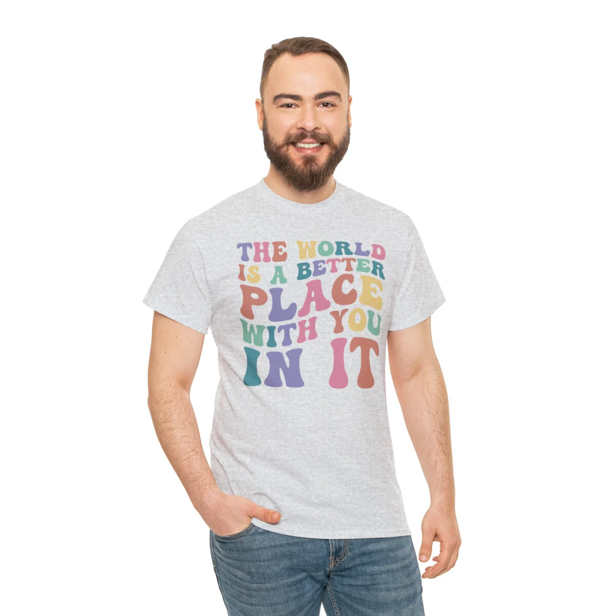 Crafted with care, this t-shirt is made from high-quality fabric to ensure exceptional comfort and durability. The design features the empowering phrase, "The world is better with you in it," elegantly displayed in multiple colors. Choose from a variety of vibrant options, including red, blue, yellow, or classic black and white, to express your personal style.