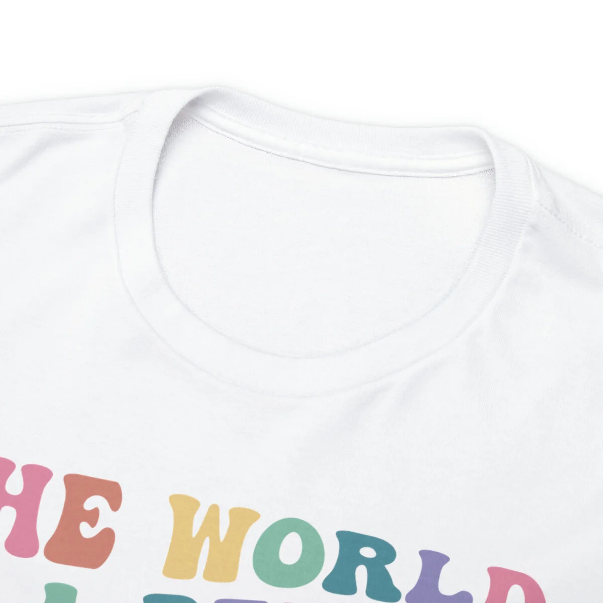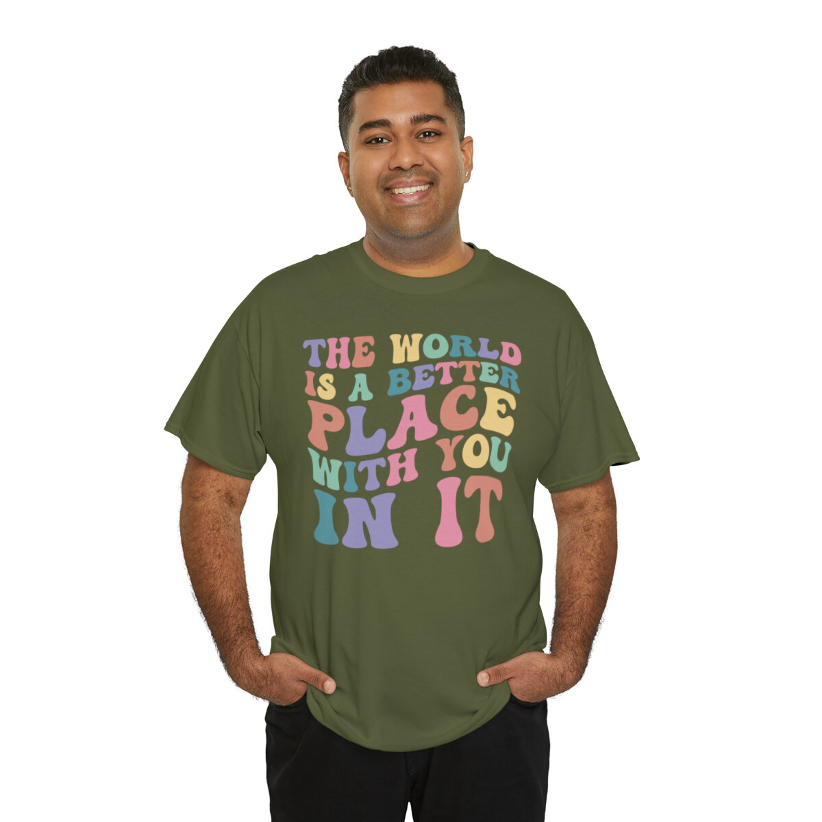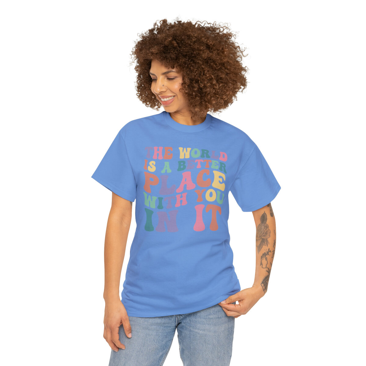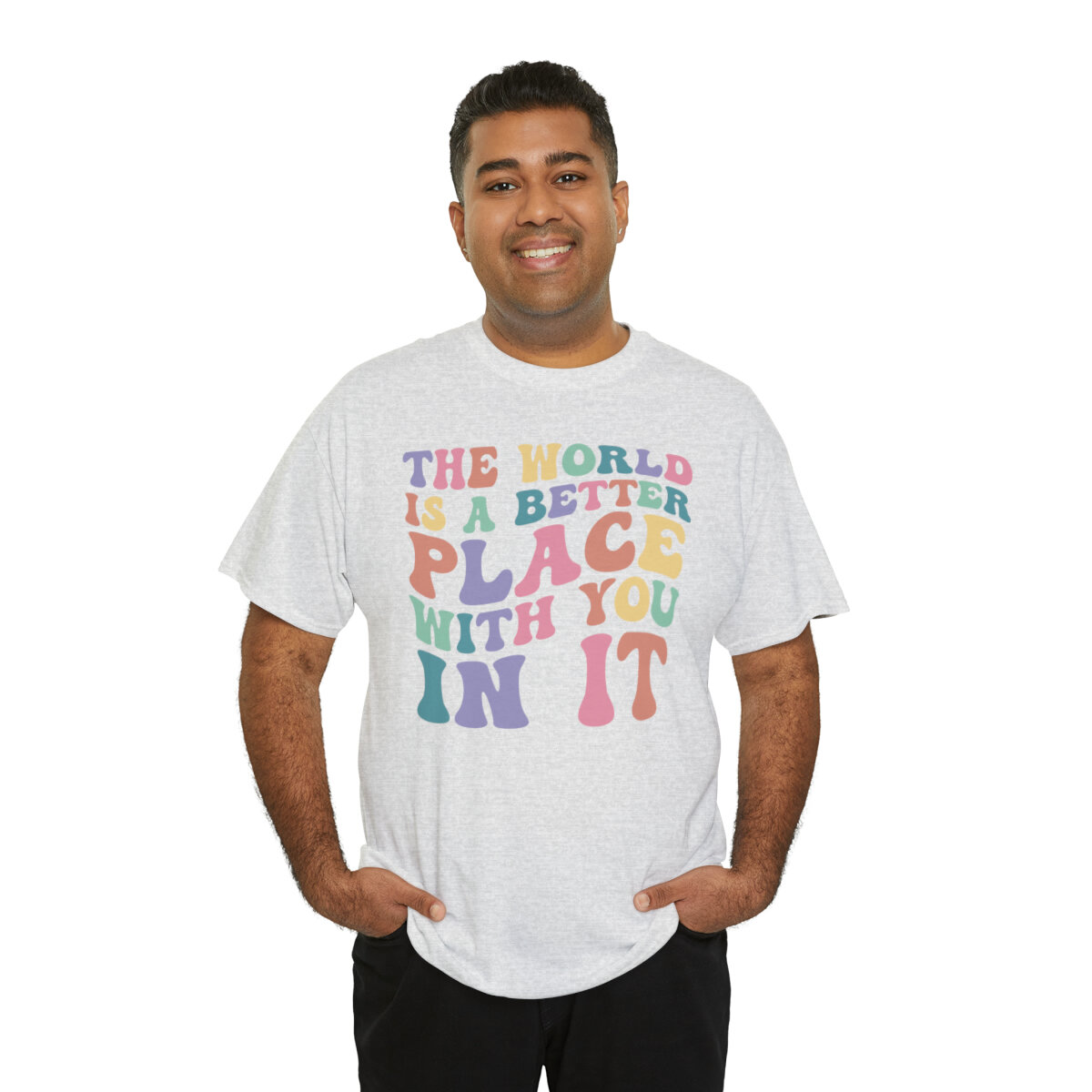 Crafted with care, this t-shirt is made from high-quality fabric to ensure exceptional comfort and durability. The design features the empowering phrase, "The world is better with you in it," elegantly displayed in multiple colors. Choose from a variety of vibrant options, including red, blue, yellow, or classic black and white, to express your personal style.