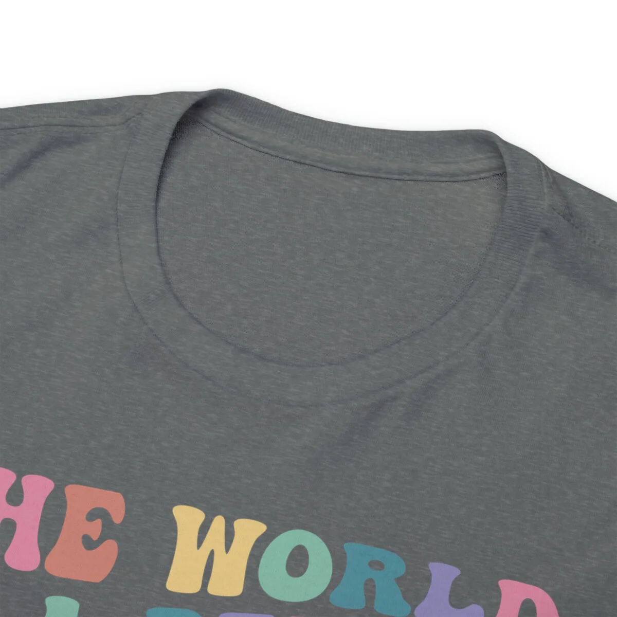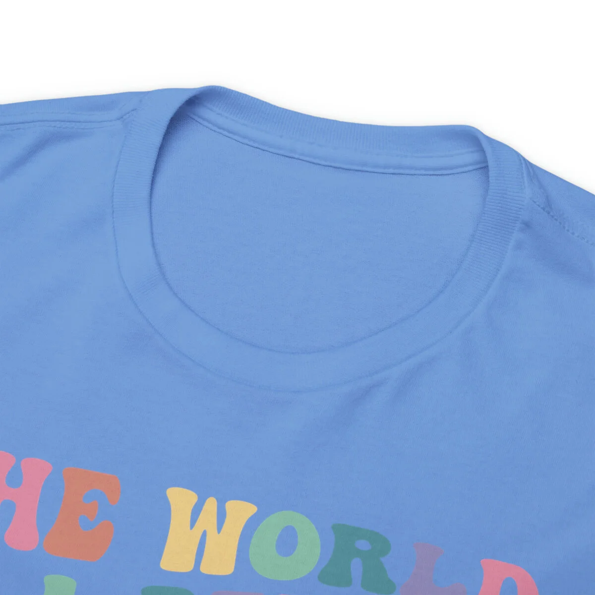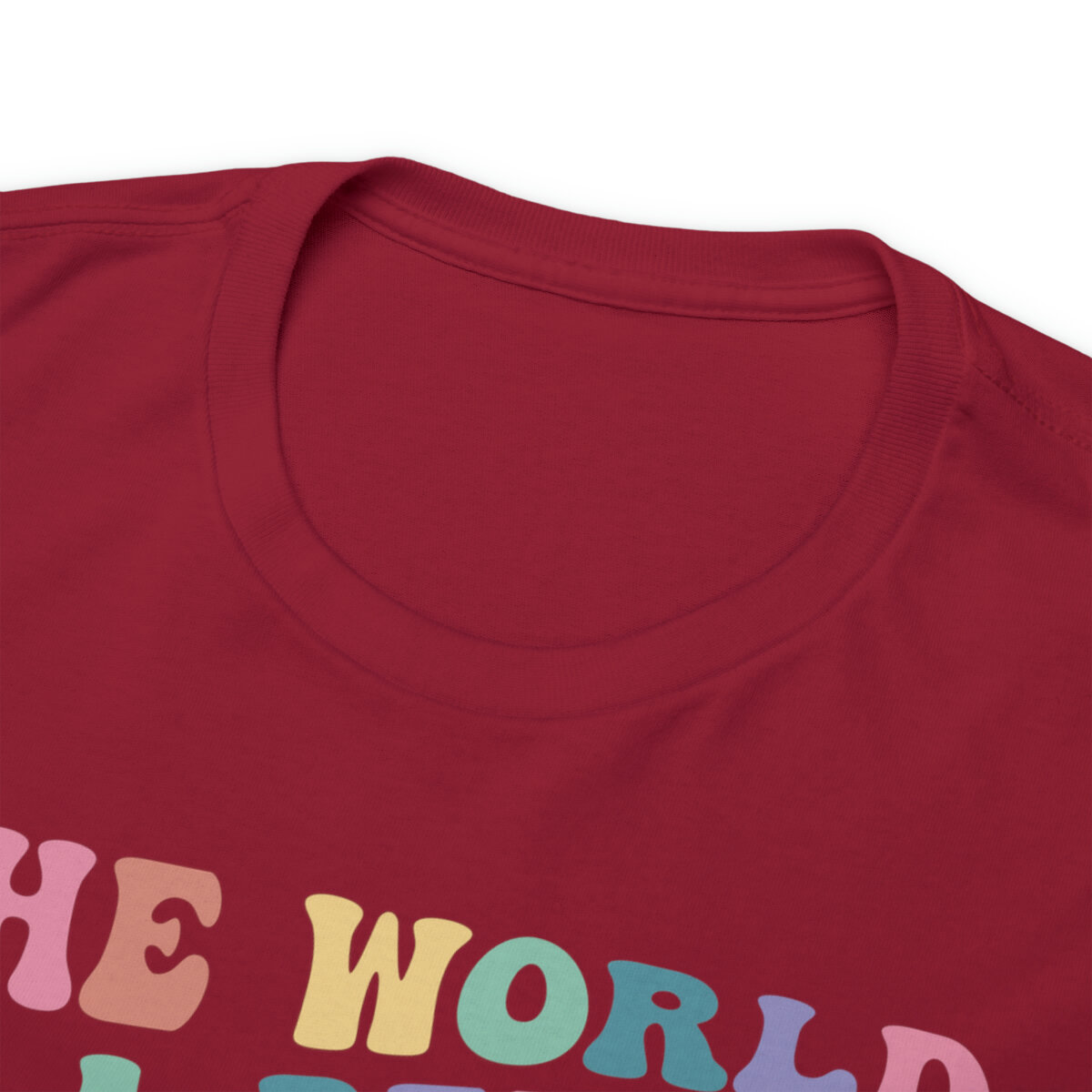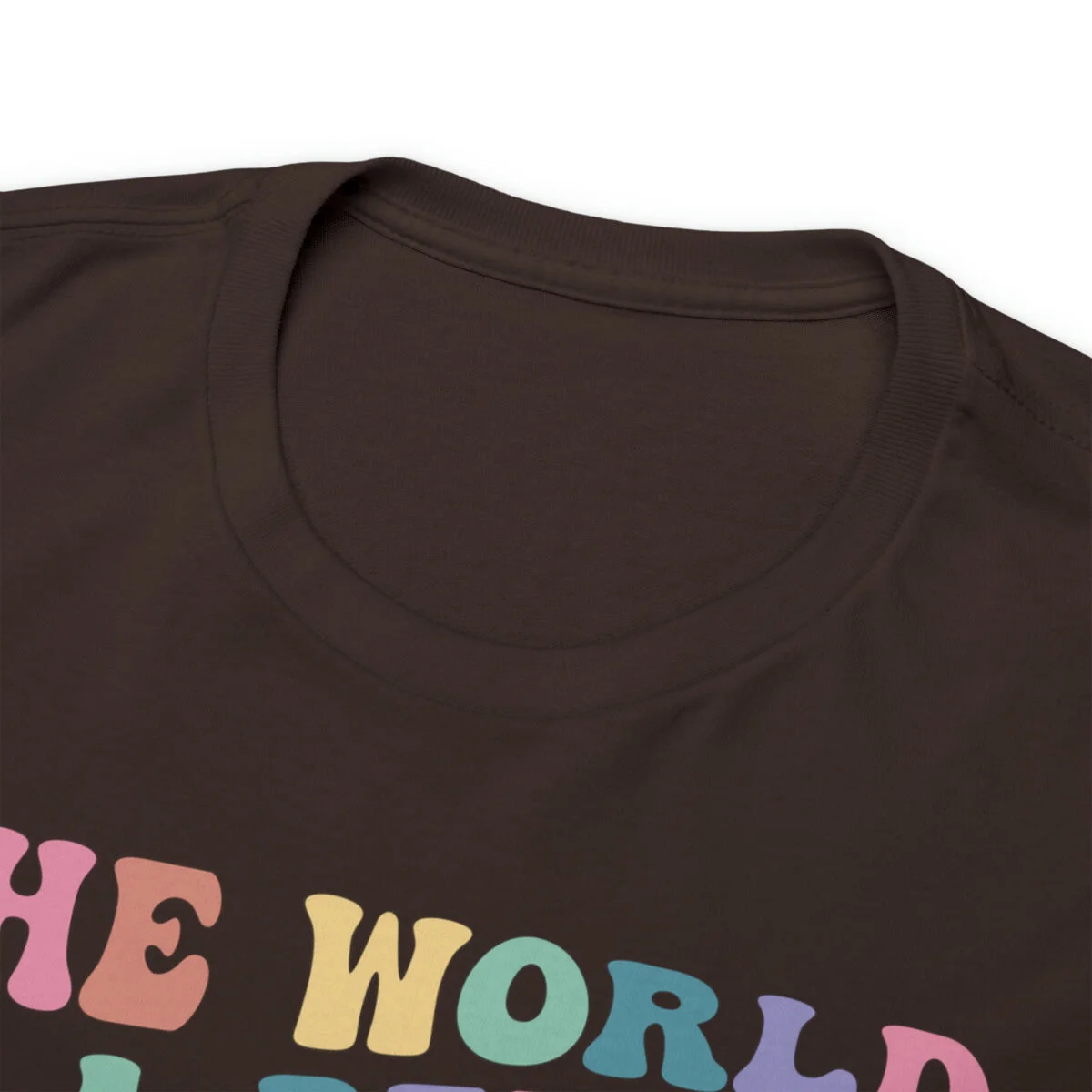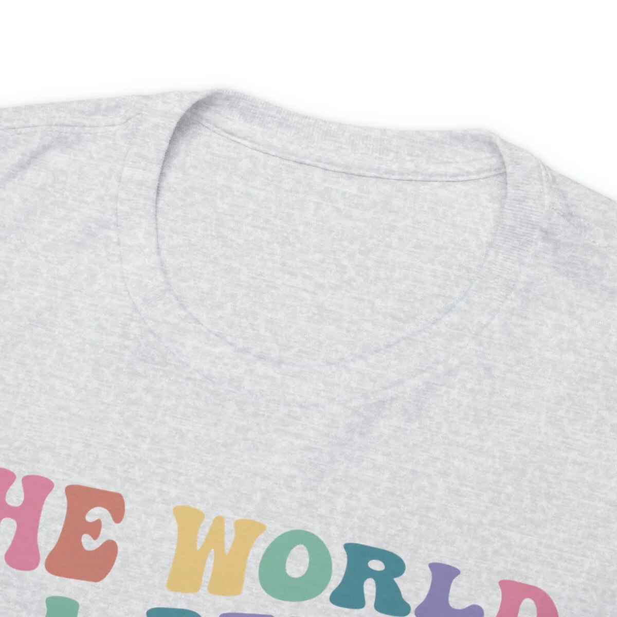 Crafted with care, this t-shirt is made from high-quality fabric to ensure exceptional comfort and durability. The design features the empowering phrase, "The world is better with you in it," elegantly displayed in multiple colors. Choose from a variety of vibrant options, including red, blue, yellow, or classic black and white, to express your personal style.