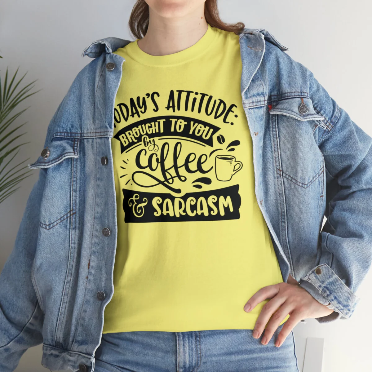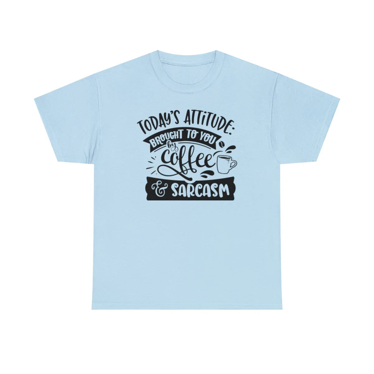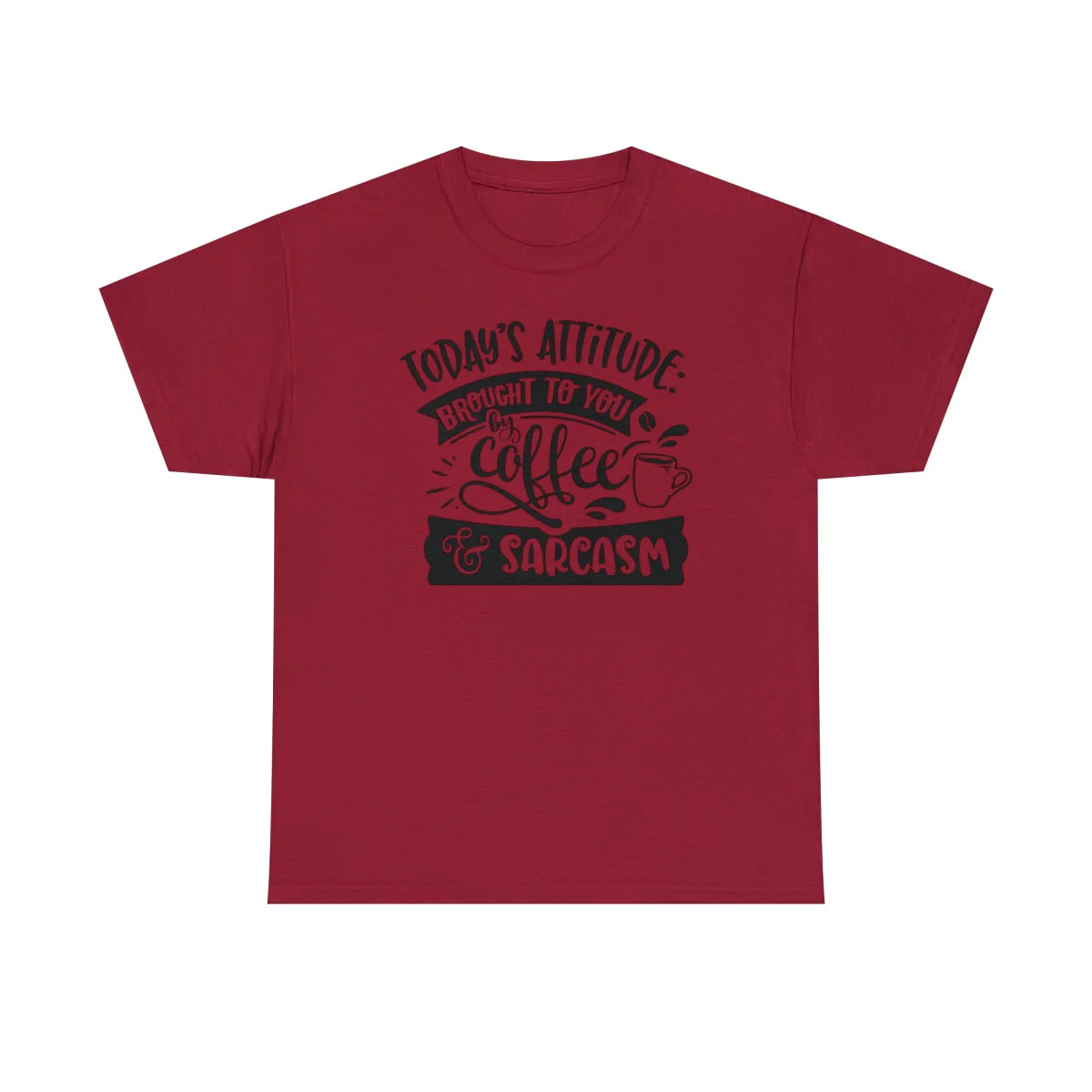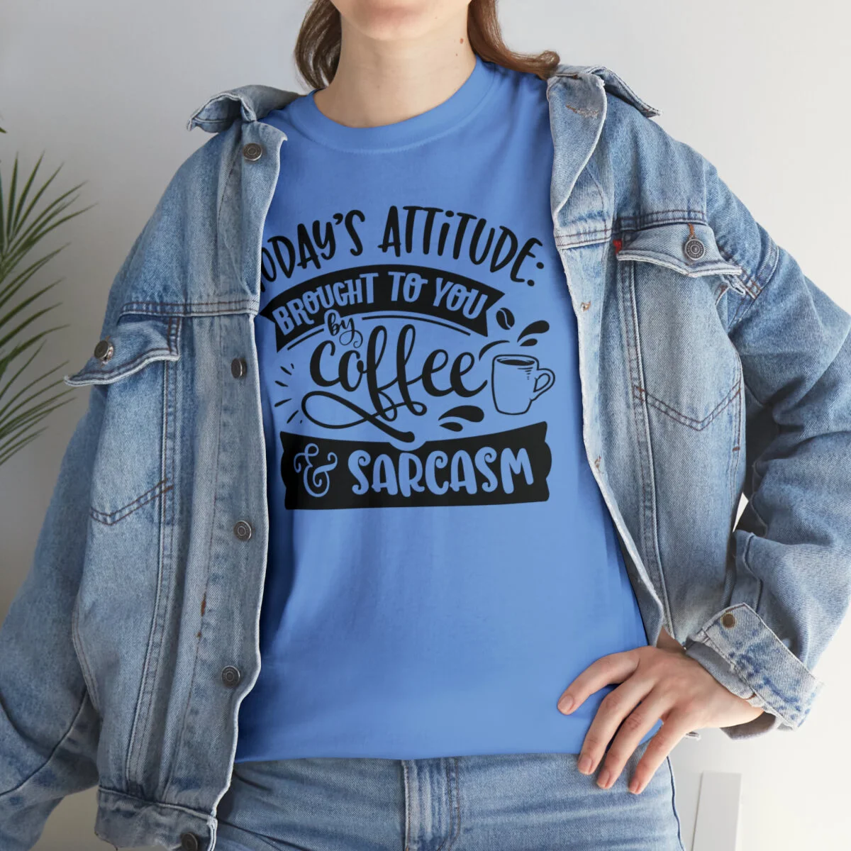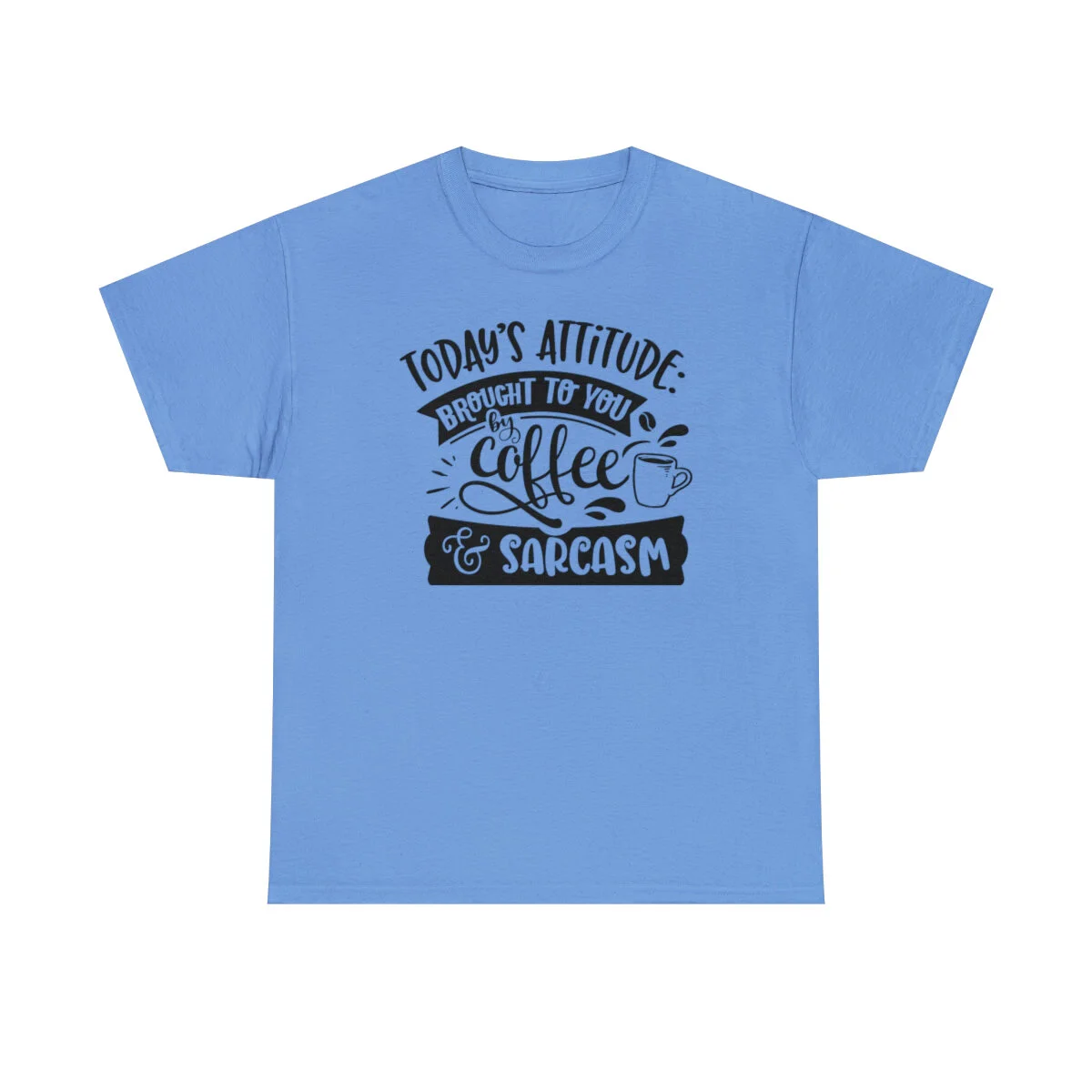 Crafted with care, this t-shirt is made from high-quality fabric to ensure exceptional comfort and durability. The design features the sassy phrase, "Today's attitude brought to you by coffee and sarcasm," elegantly displayed in multiple colors. Choose from a variety of vibrant options, including red, blue, yellow, or classic black and white, to find the hue that best matches your style and personality.