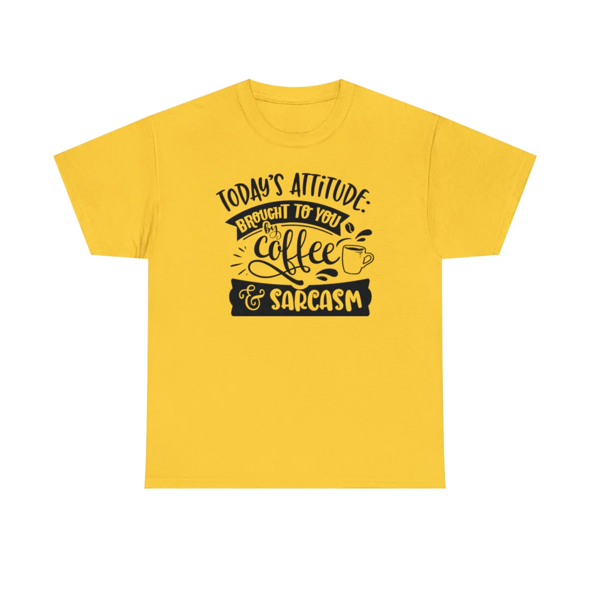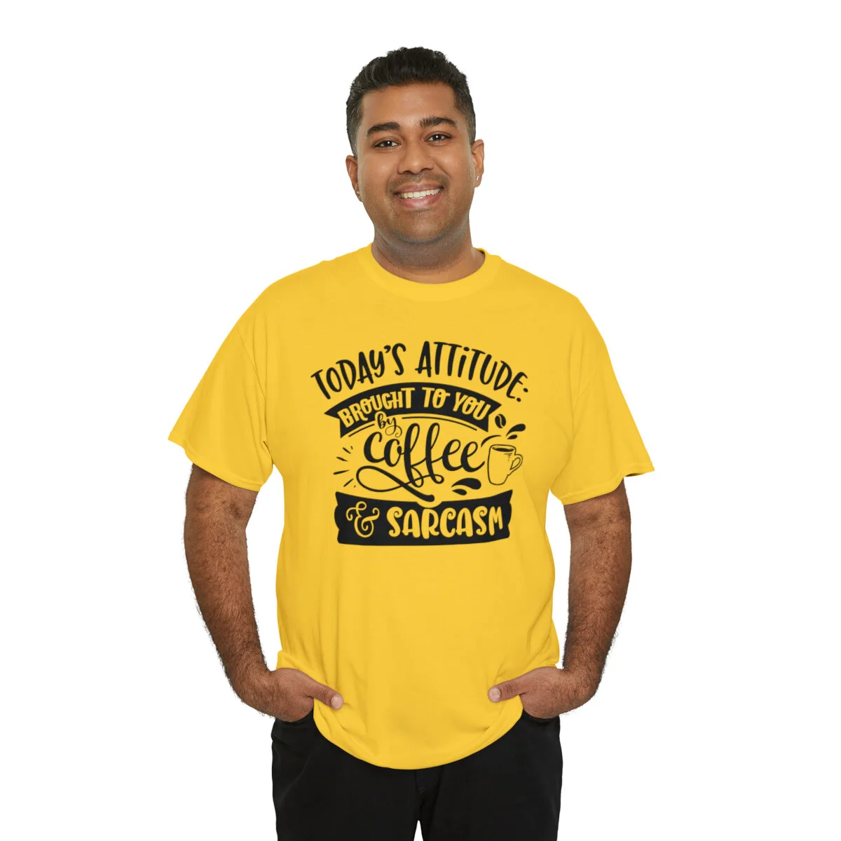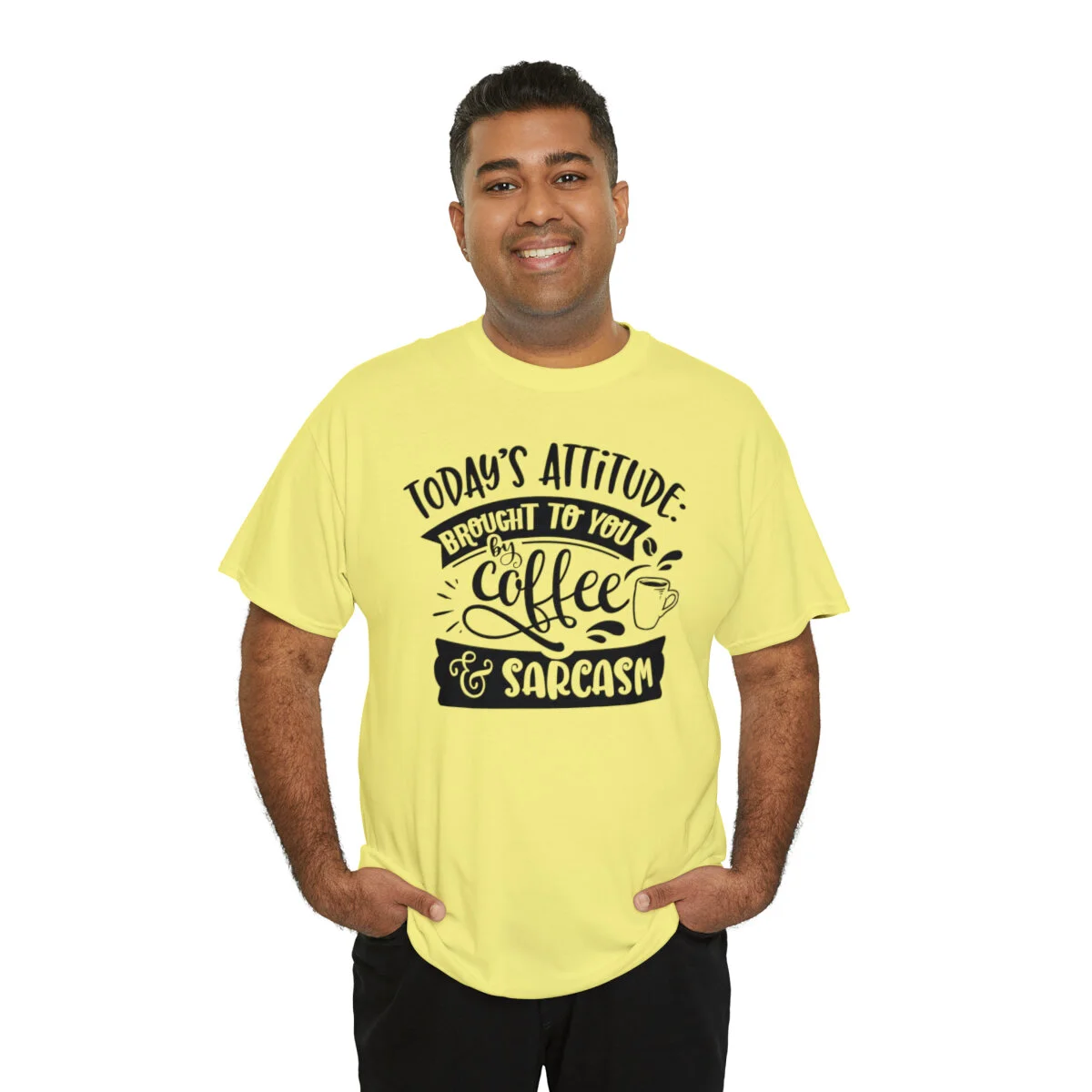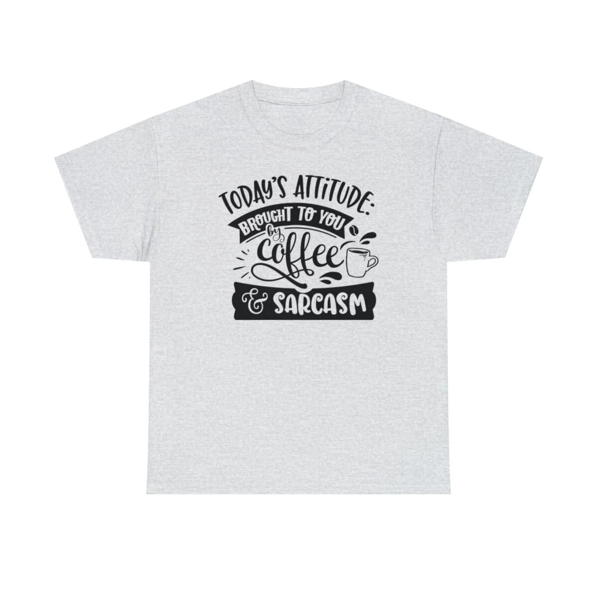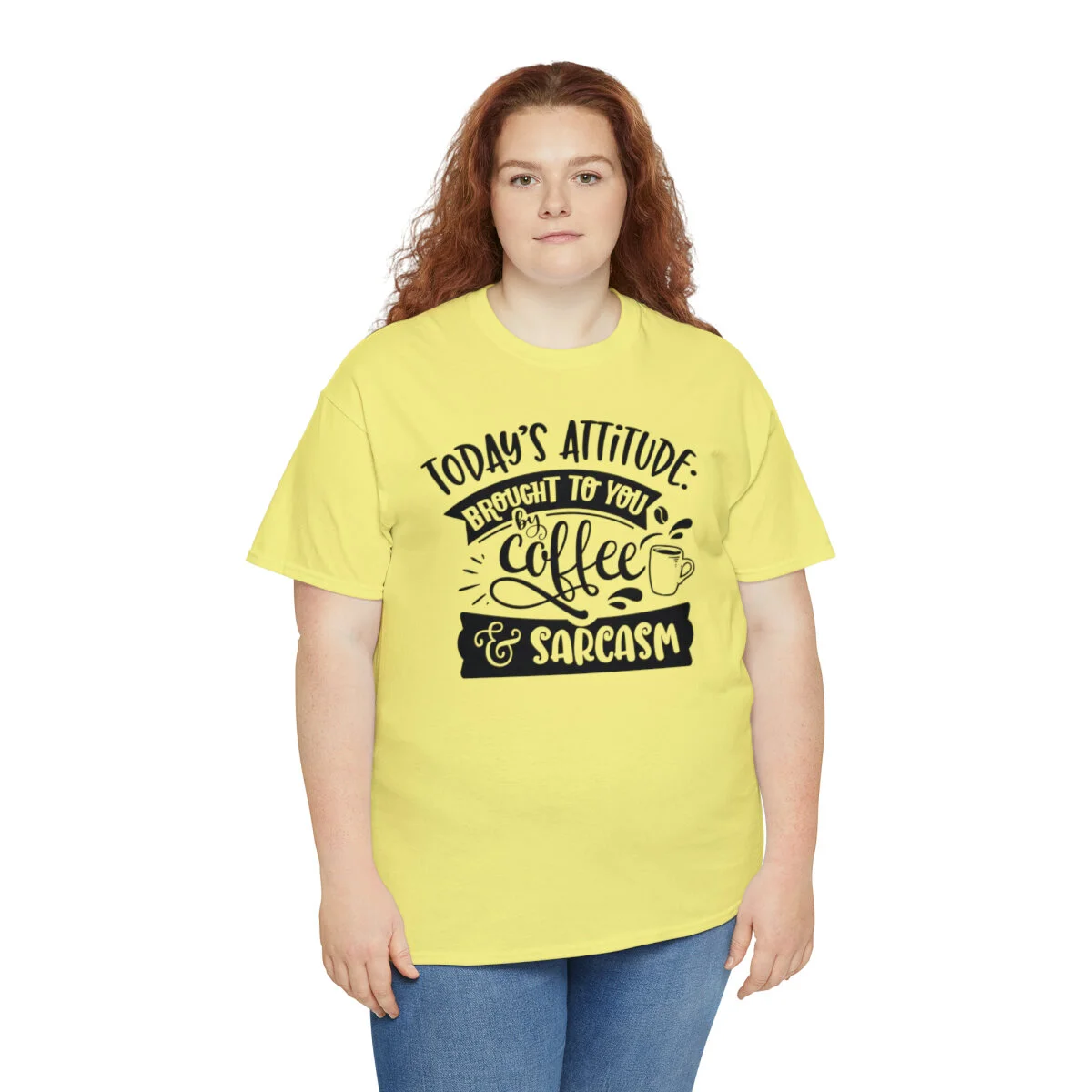 Crafted with care, this t-shirt is made from high-quality fabric to ensure exceptional comfort and durability. The design features the sassy phrase, "Today's attitude brought to you by coffee and sarcasm," elegantly displayed in multiple colors. Choose from a variety of vibrant options, including red, blue, yellow, or classic black and white, to find the hue that best matches your style and personality.