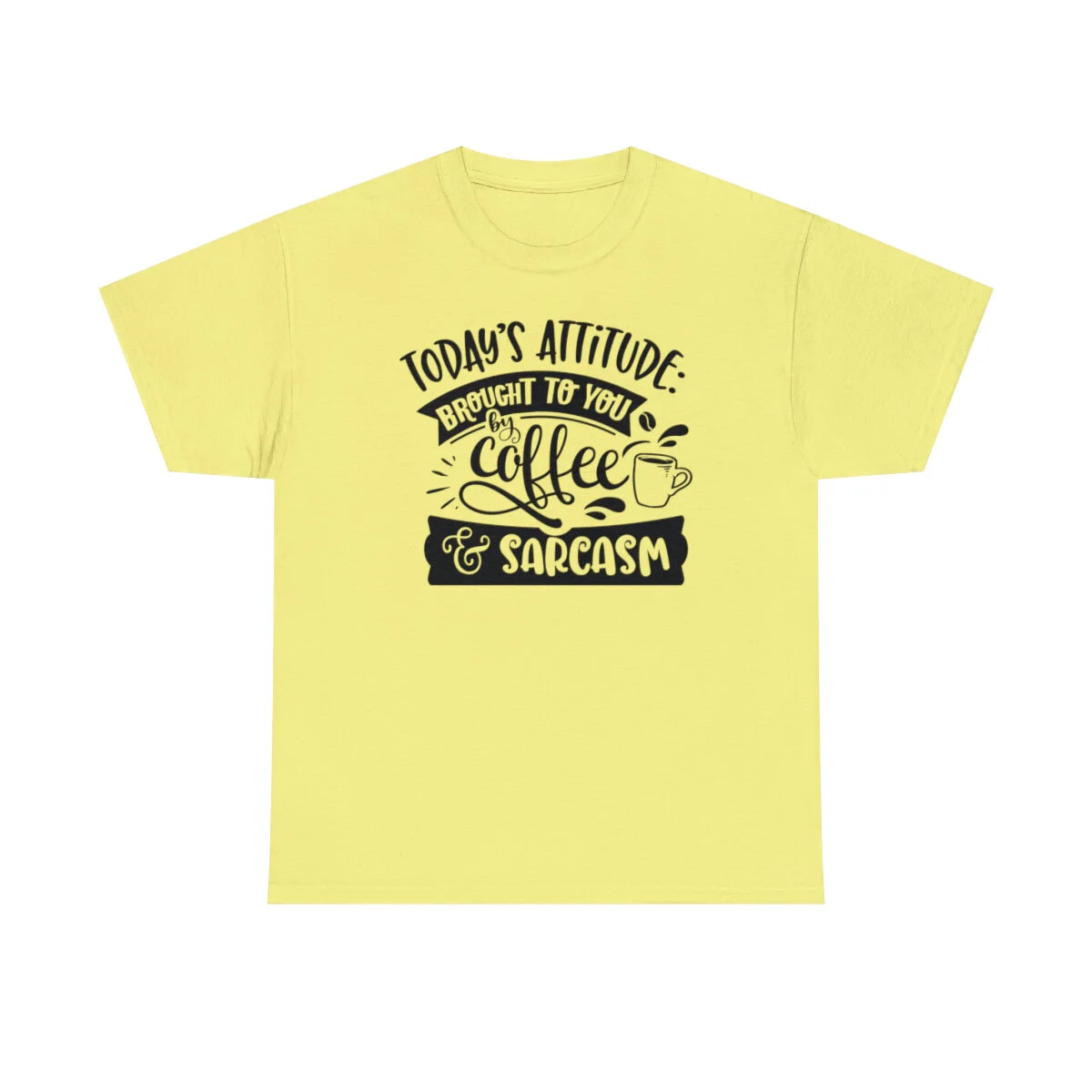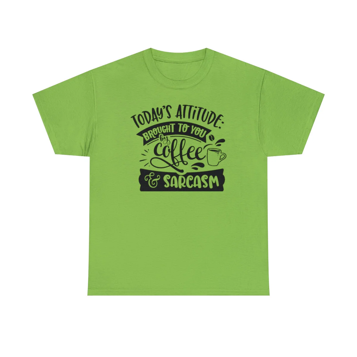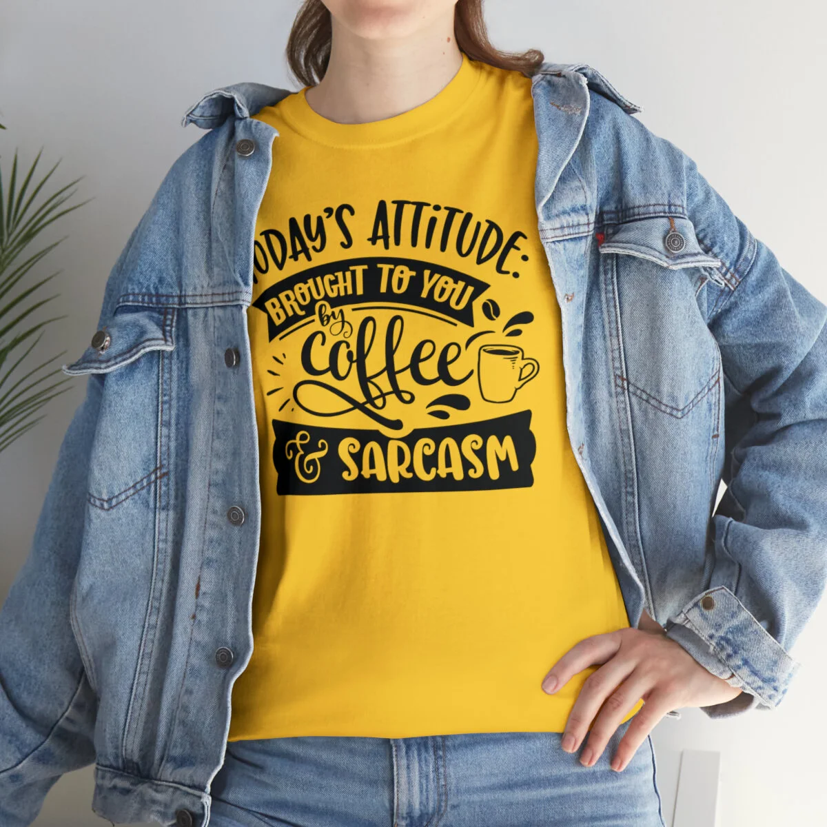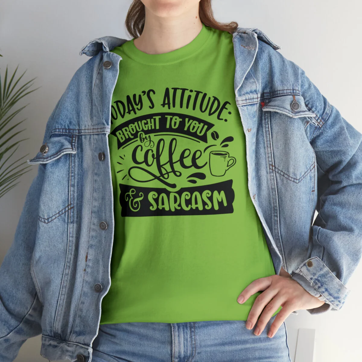 Crafted with care, this t-shirt is made from high-quality fabric to ensure exceptional comfort and durability. The design features the sassy phrase, "Today's attitude brought to you by coffee and sarcasm," elegantly displayed in multiple colors. Choose from a variety of vibrant options, including red, blue, yellow, or classic black and white, to find the hue that best matches your style and personality.