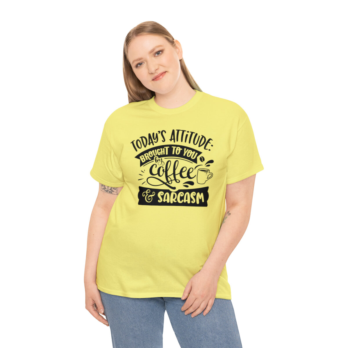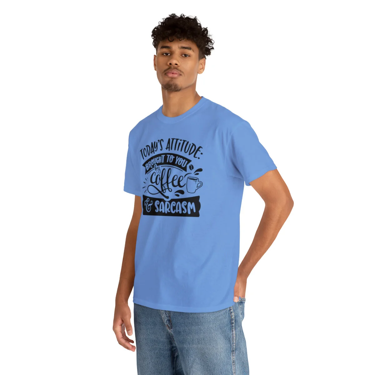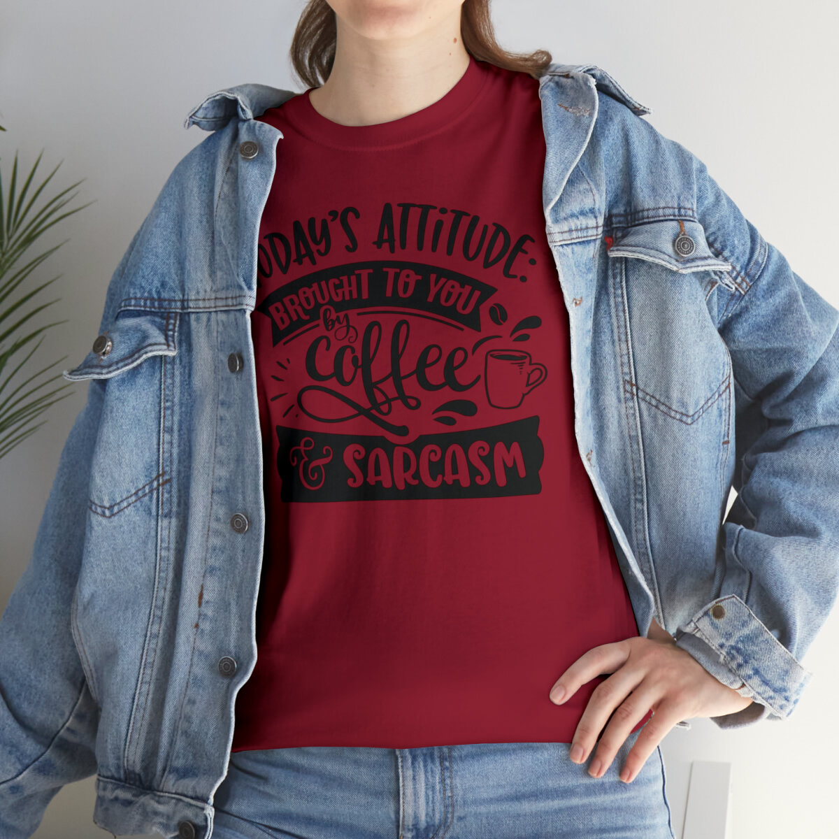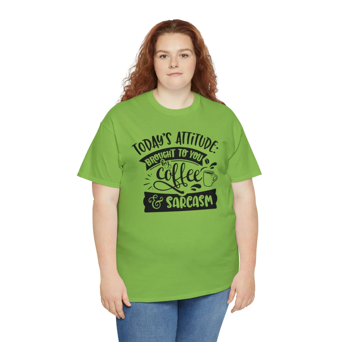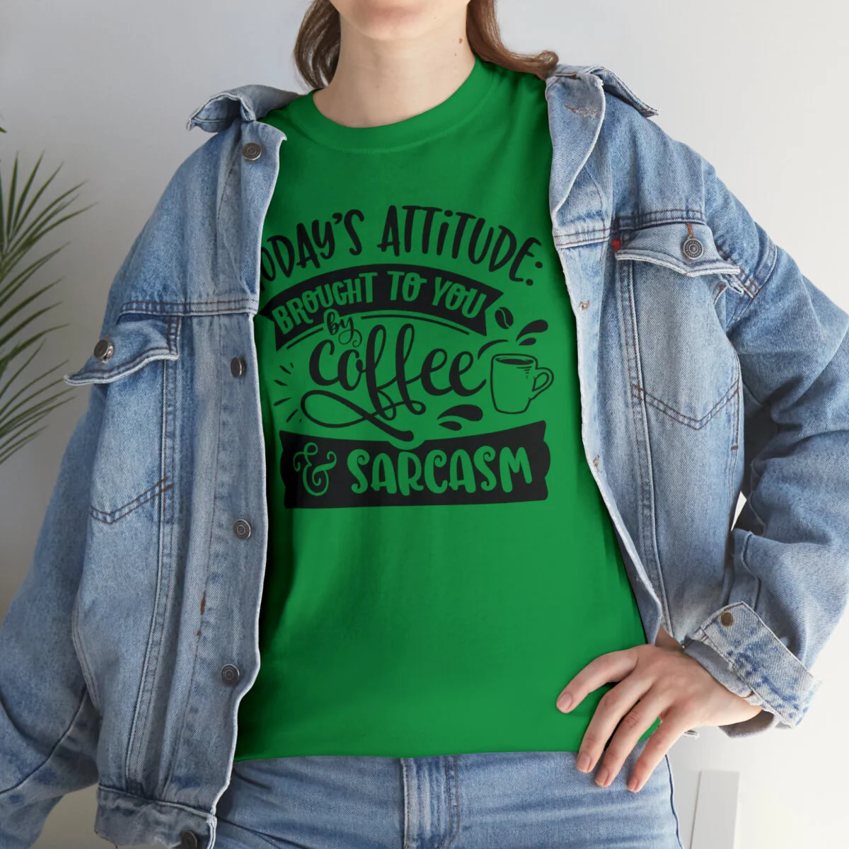 Crafted with care, this t-shirt is made from high-quality fabric to ensure exceptional comfort and durability. The design features the sassy phrase, "Today's attitude brought to you by coffee and sarcasm," elegantly displayed in multiple colors. Choose from a variety of vibrant options, including red, blue, yellow, or classic black and white, to find the hue that best matches your style and personality.