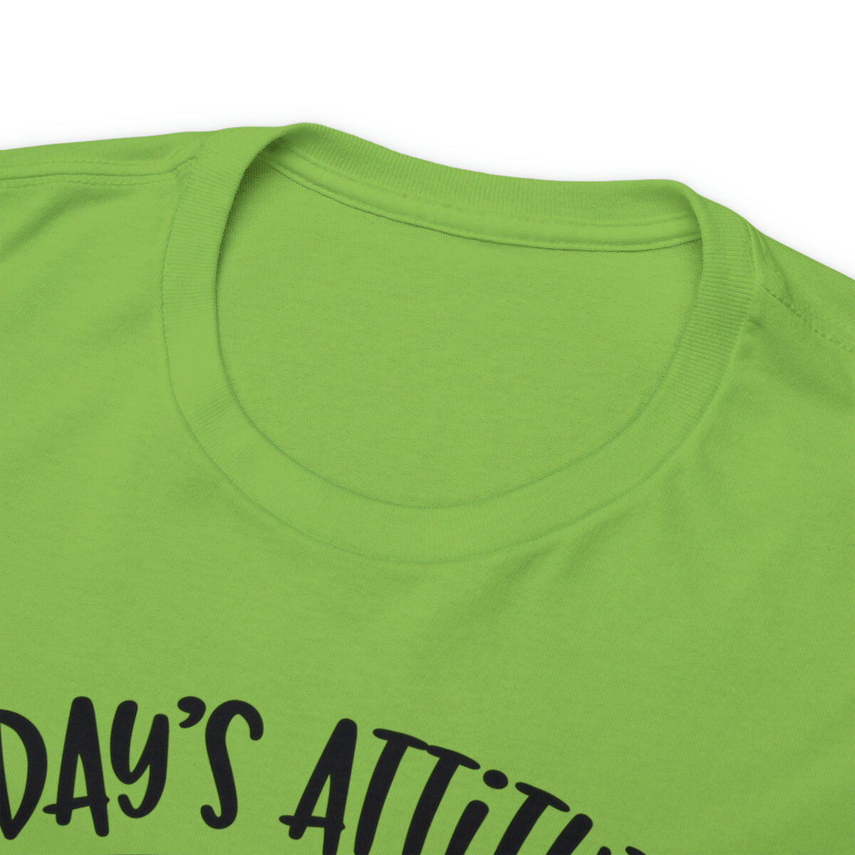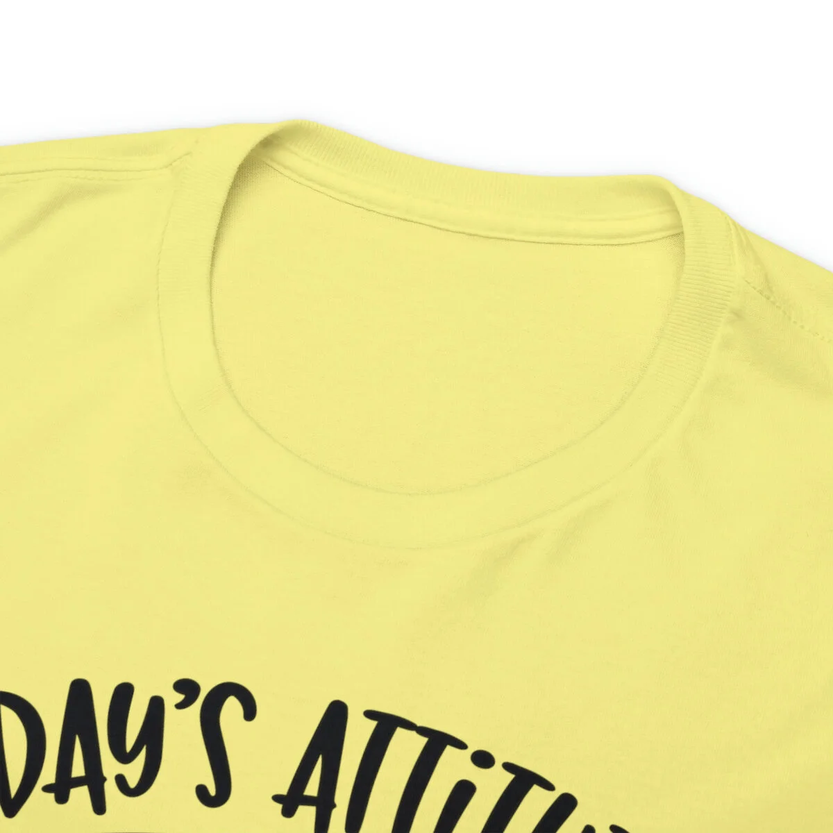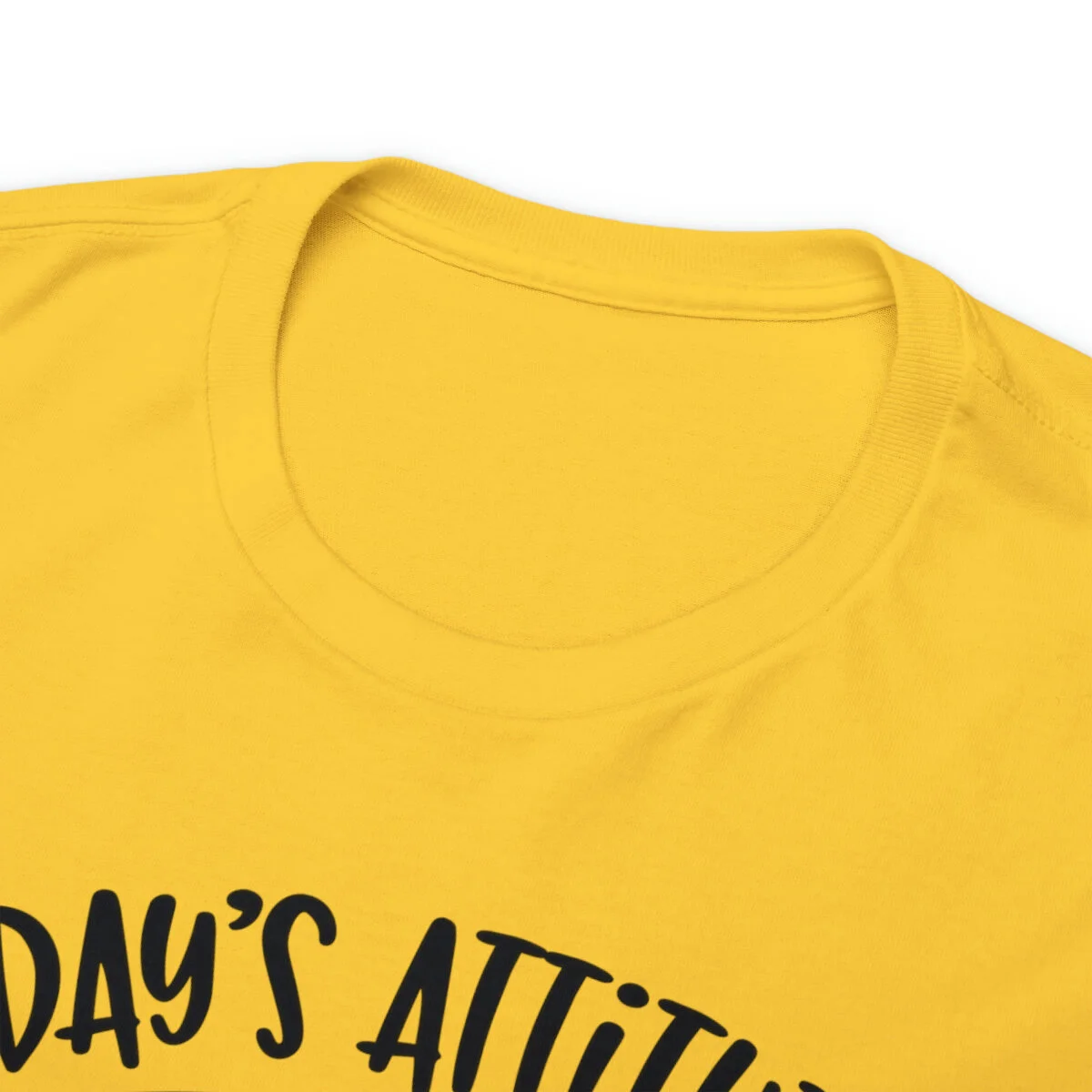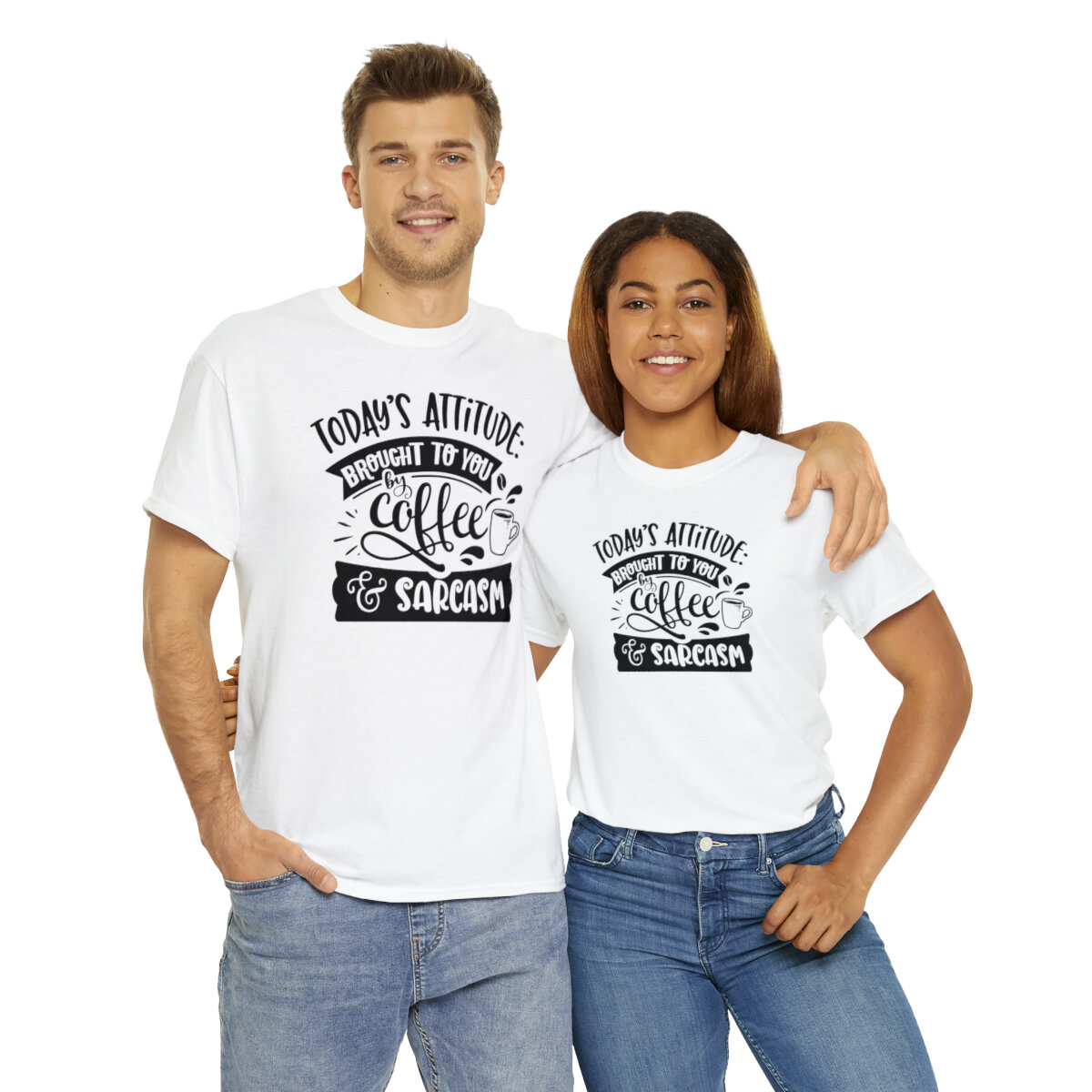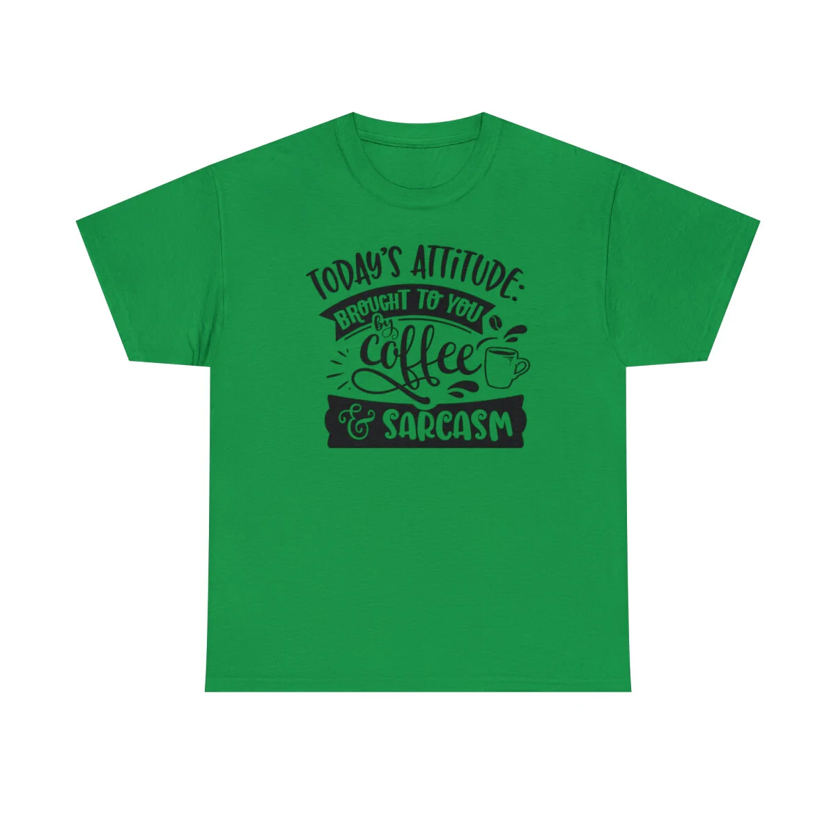 Crafted with care, this t-shirt is made from high-quality fabric to ensure exceptional comfort and durability. The design features the sassy phrase, "Today's attitude brought to you by coffee and sarcasm," elegantly displayed in multiple colors. Choose from a variety of vibrant options, including red, blue, yellow, or classic black and white, to find the hue that best matches your style and personality.