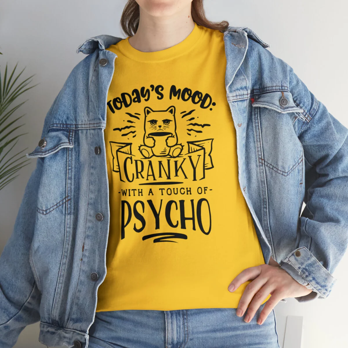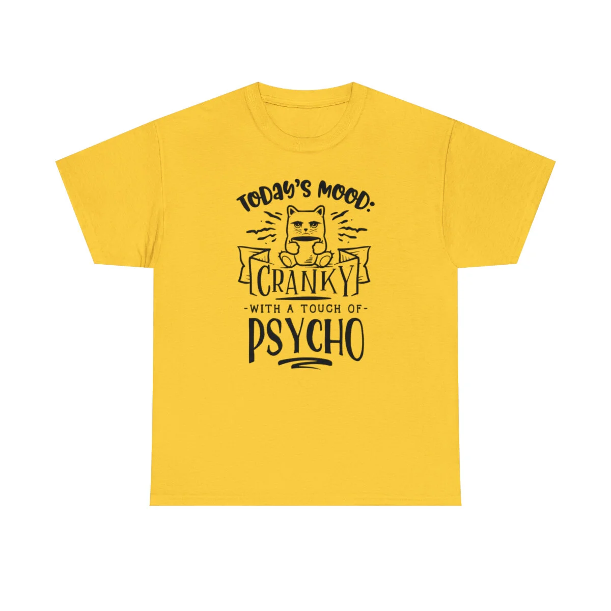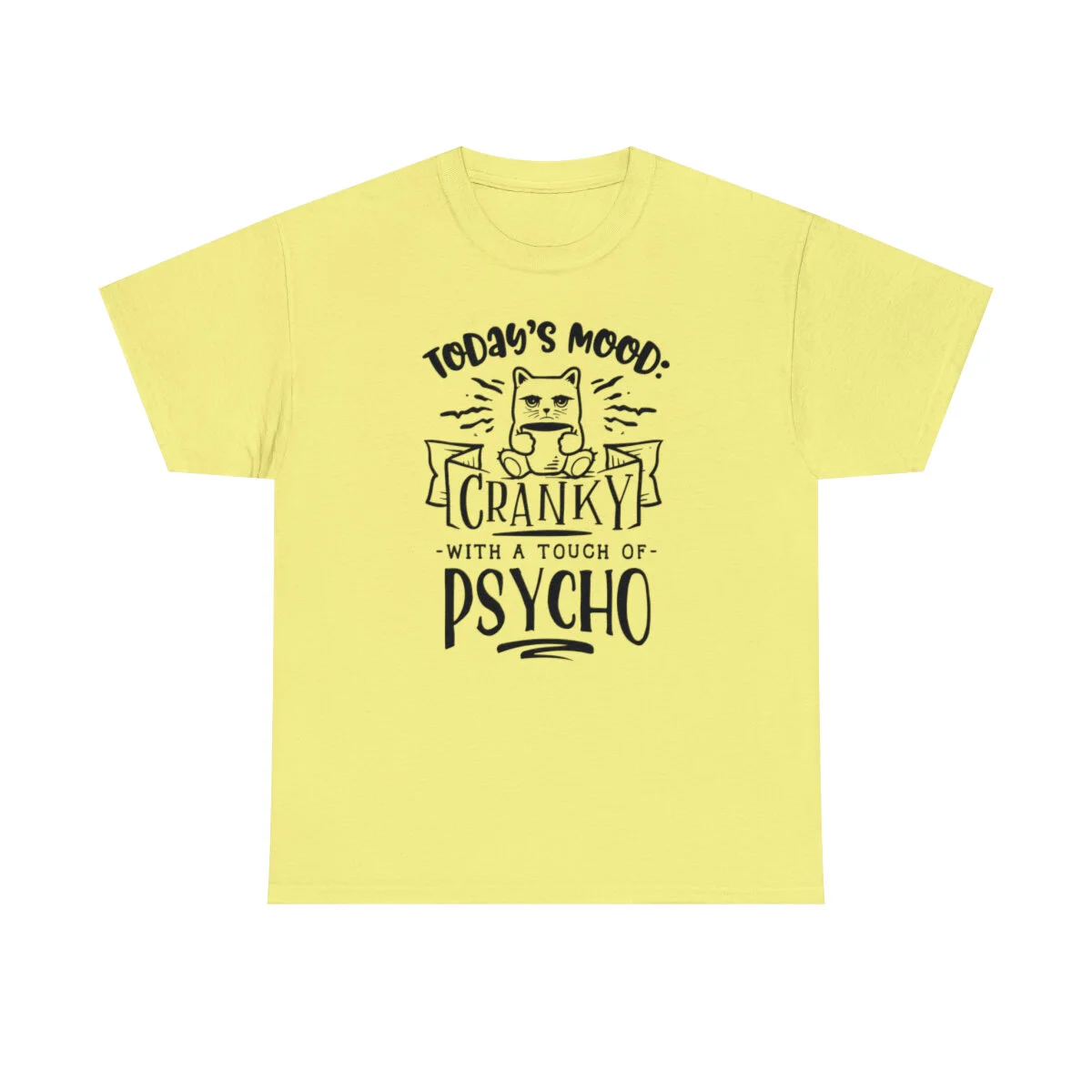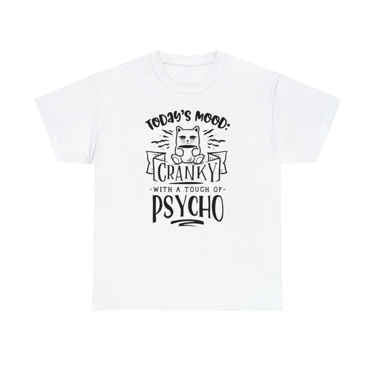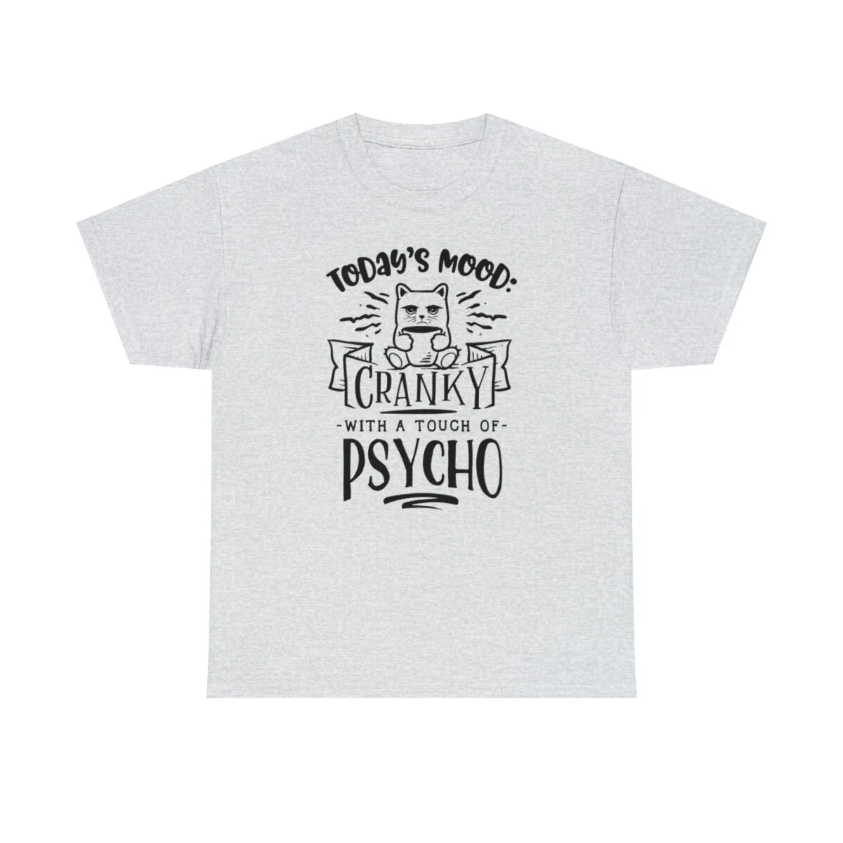 Crafted with care, this t-shirt is made from high-quality fabric to ensure exceptional comfort and durability. The design features the sassy phrase, "Today's Mood: Cranky with a touch of psycho," elegantly displayed in multiple colors. Choose from a variety of vibrant options, including red, blue, yellow, or classic black and white, to find the hue that best matches your style and personality.
