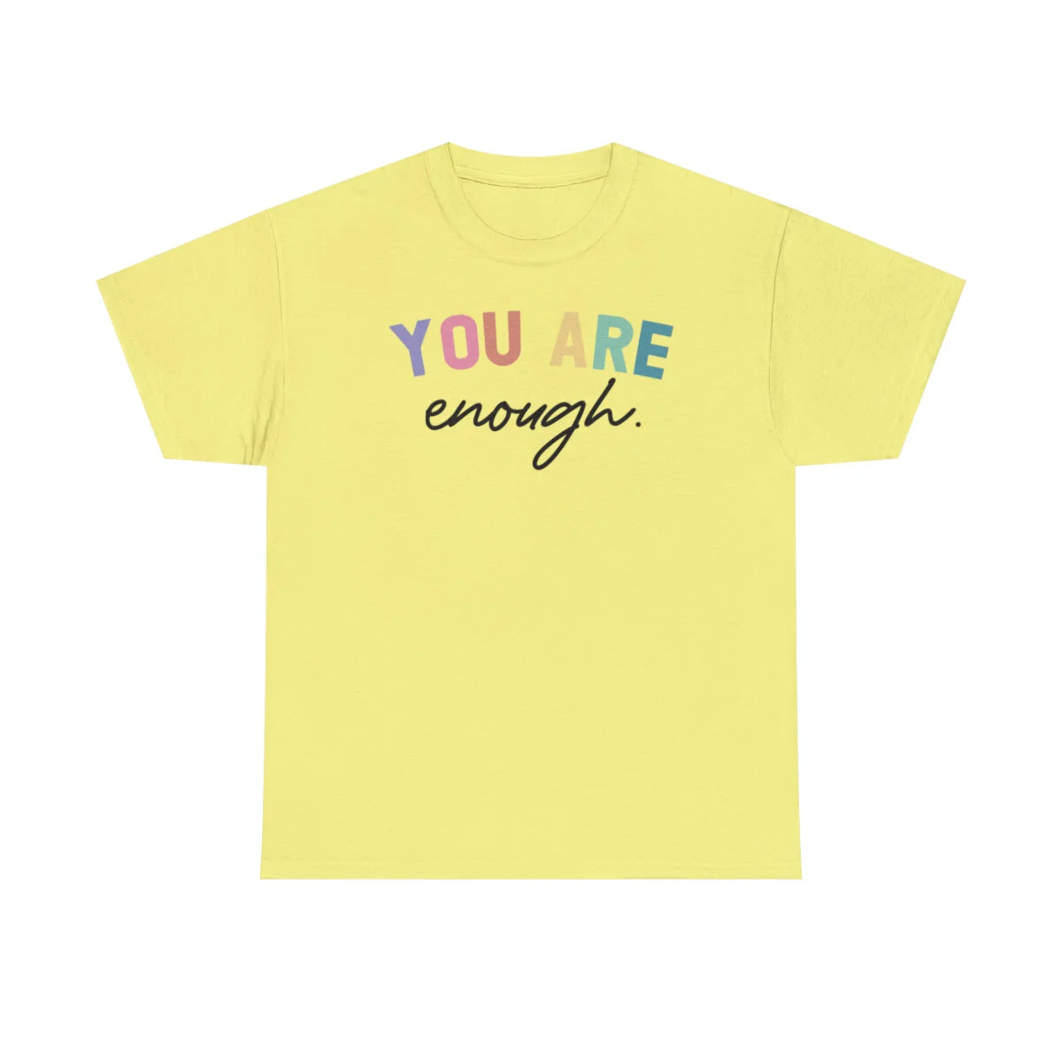 Crafted with care, this t-shirt is made from high-quality fabric to ensure exceptional comfort and durability. The design features the uplifting phrase, "You are enough," elegantly displayed in multiple colors. Choose from a variety of vibrant options, including red, blue, yellow, or classic black and white, to express your personal style.