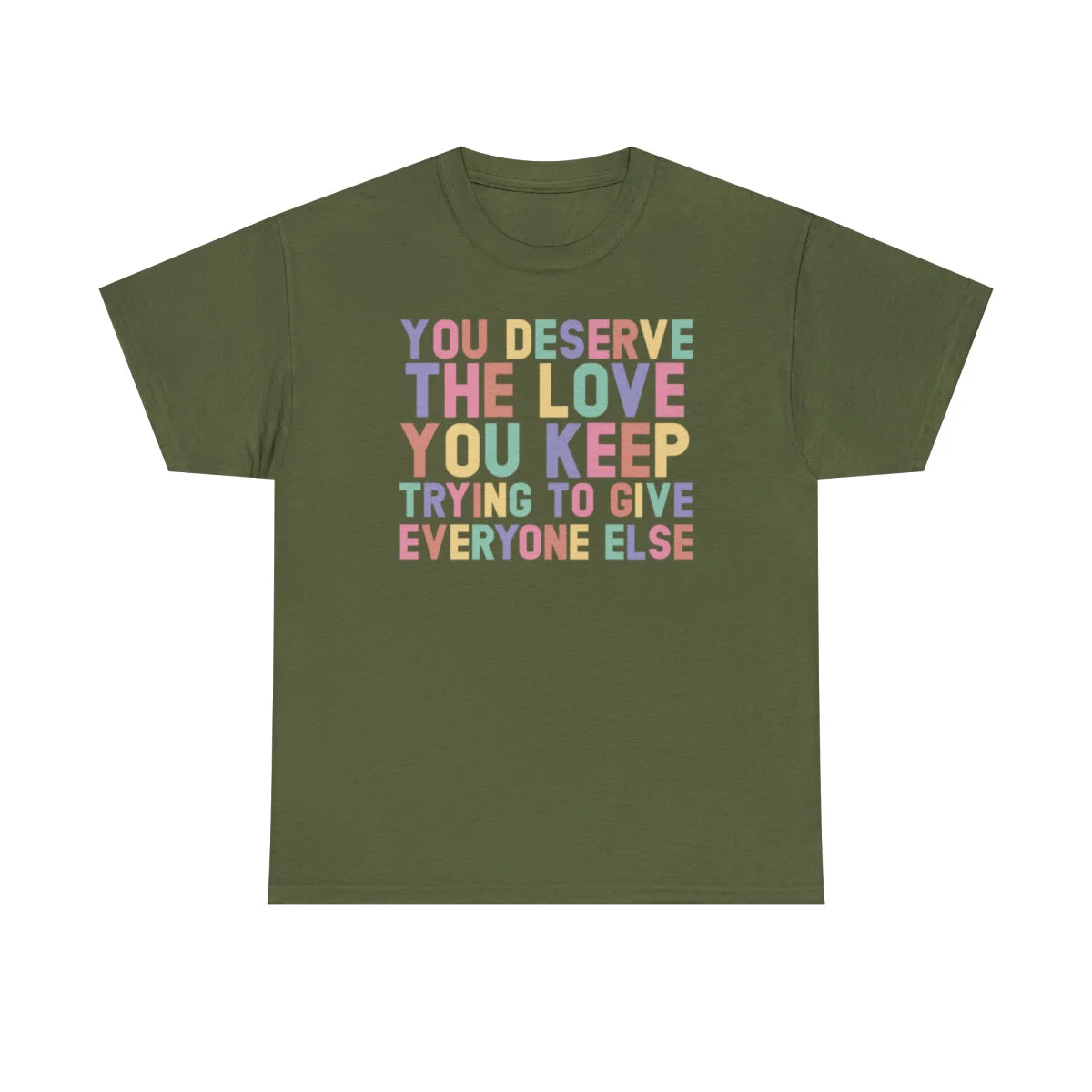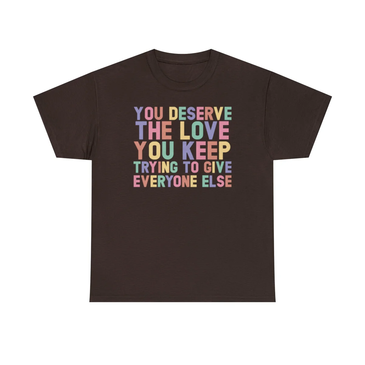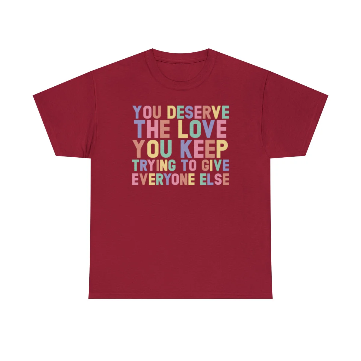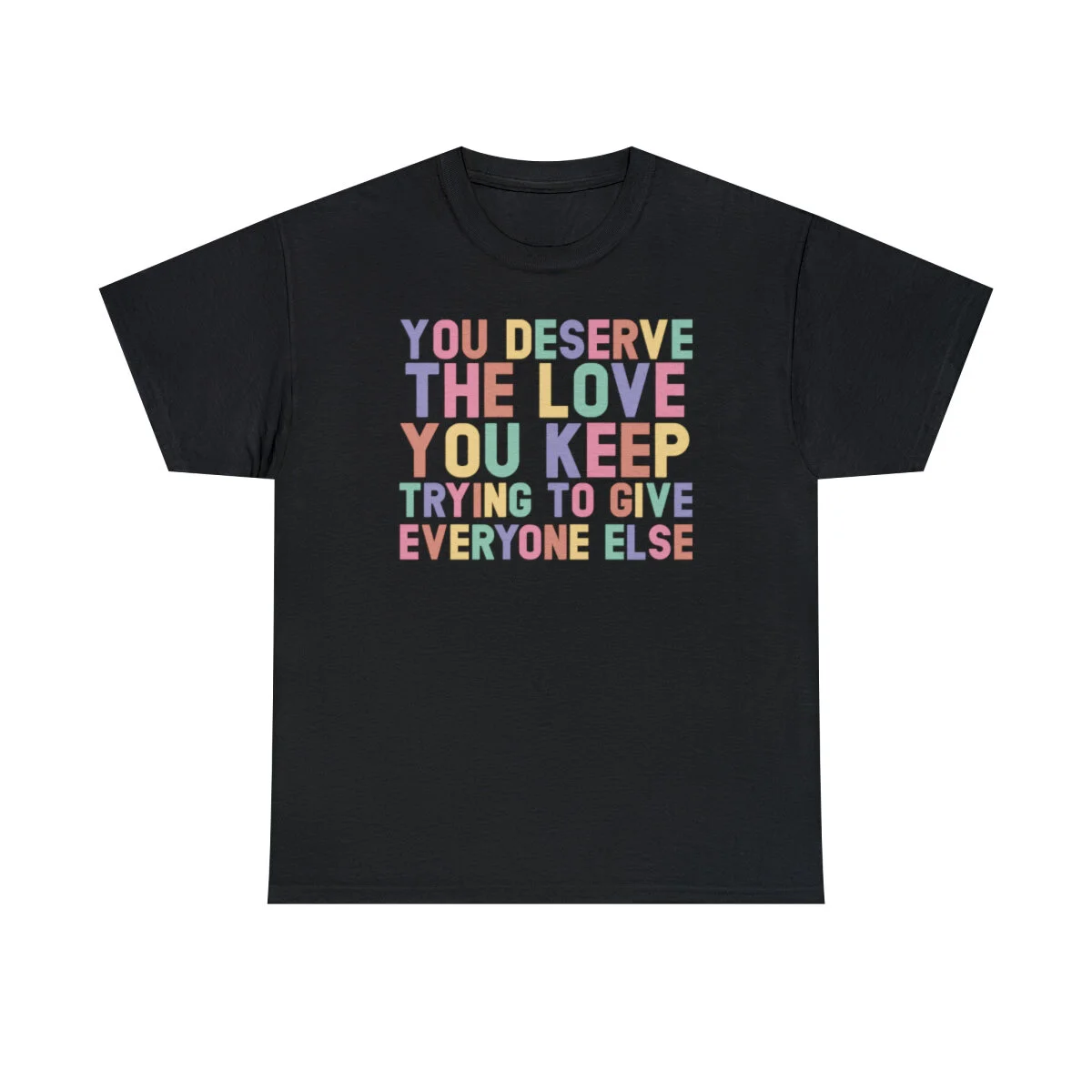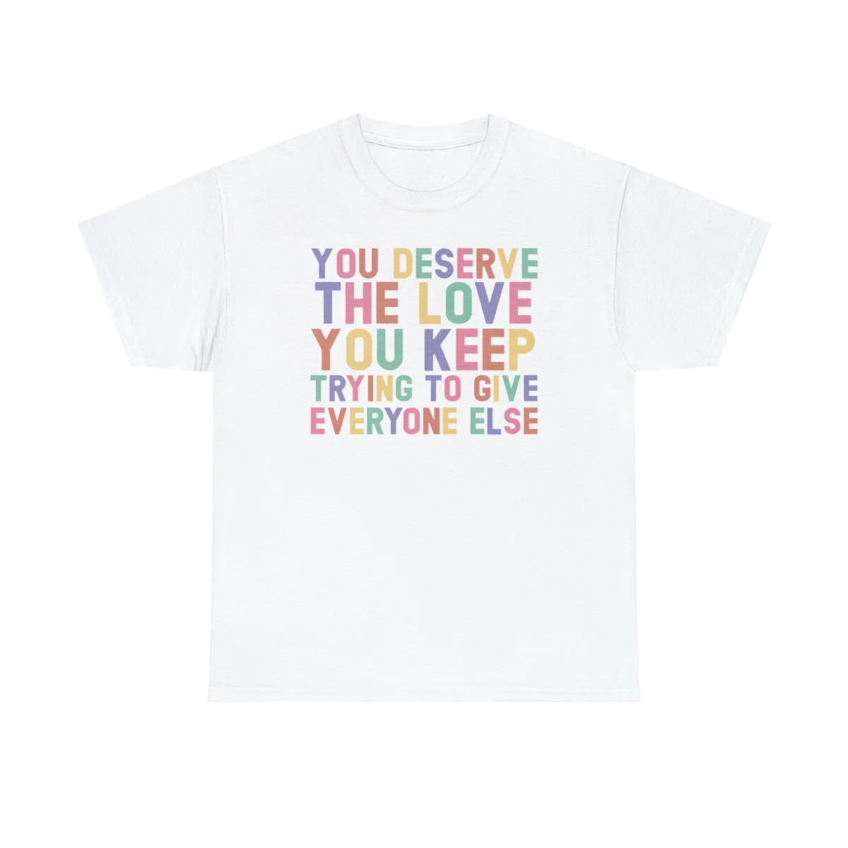 Crafted with care, this t-shirt is made from high-quality fabric to ensure exceptional comfort and durability. The design features the empowering phrase, "You deserve the love you give everyone else," elegantly displayed in multiple colors. Choose from a variety of vibrant options, including red, blue, yellow, or classic black and white, to express your personal style.
