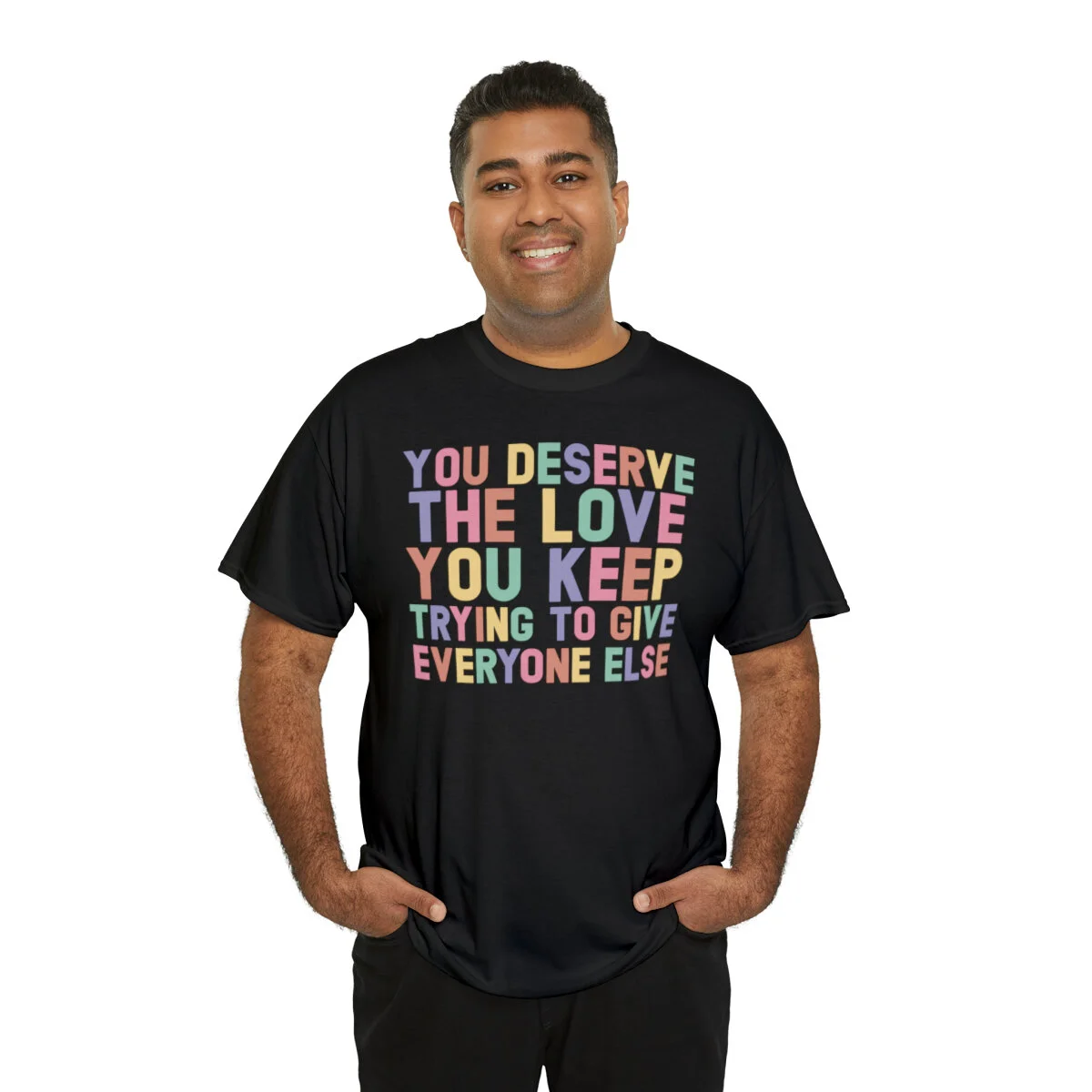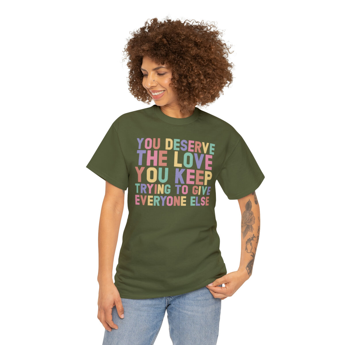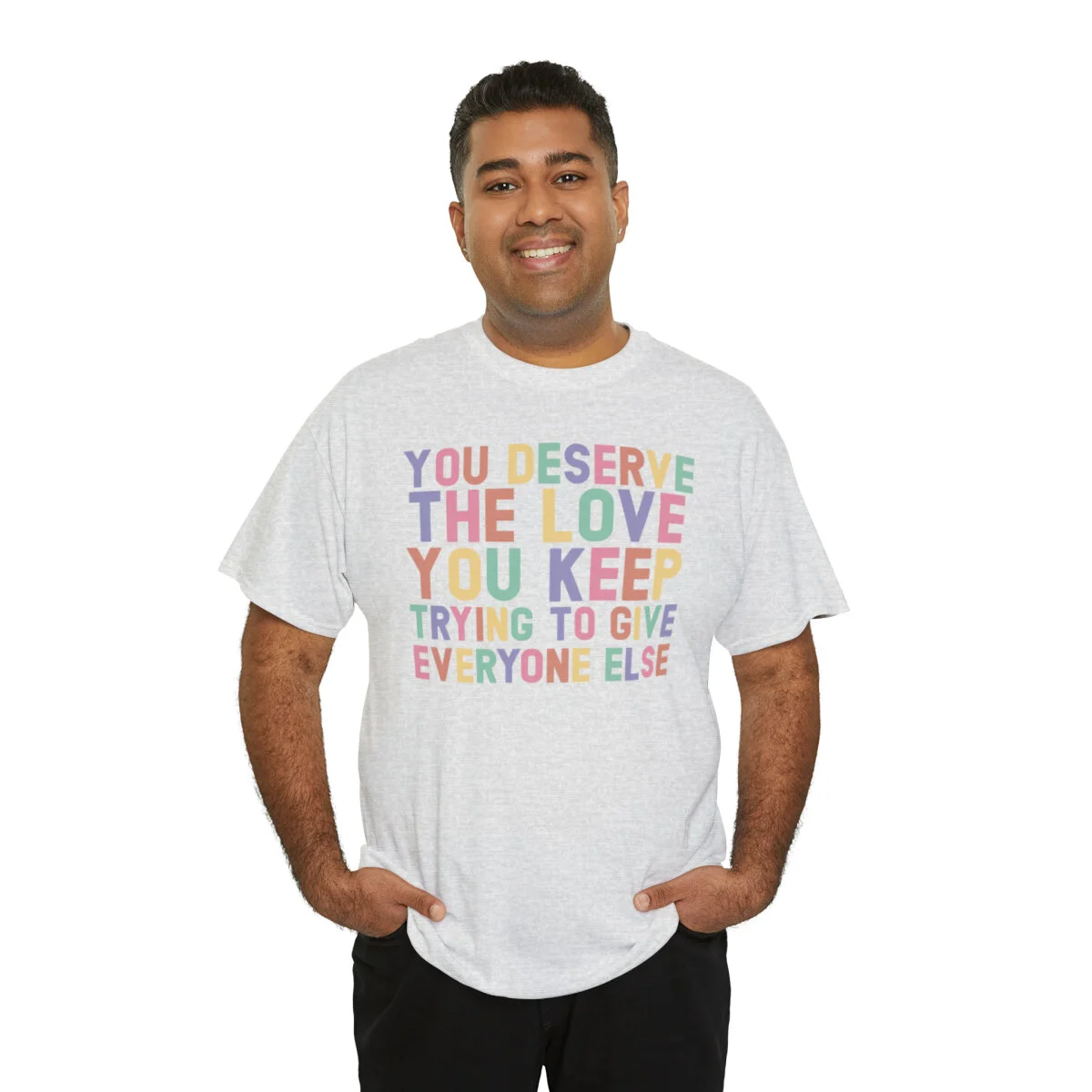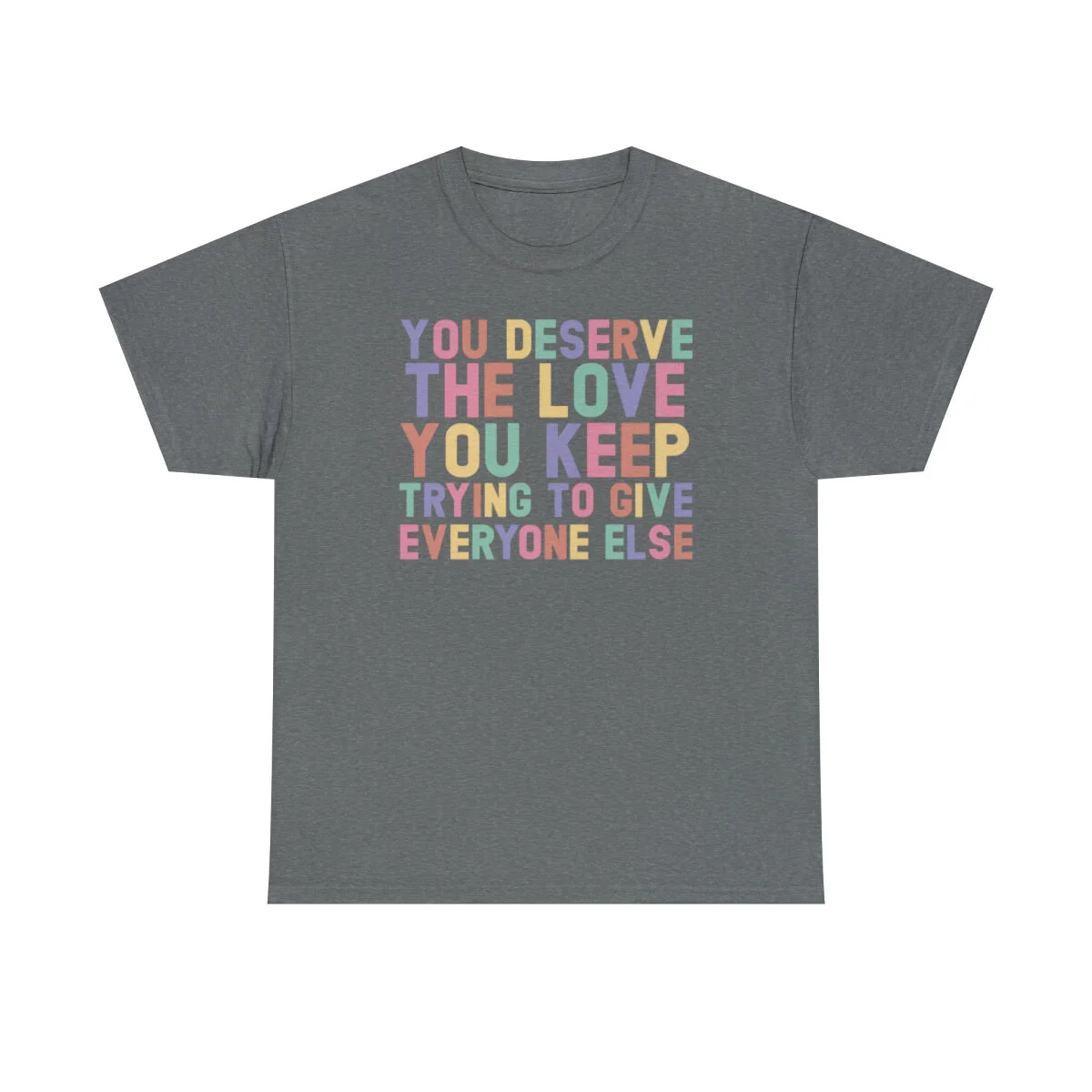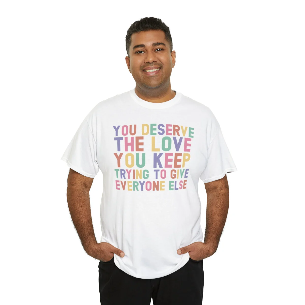 Crafted with care, this t-shirt is made from high-quality fabric to ensure exceptional comfort and durability. The design features the empowering phrase, "You deserve the love you give everyone else," elegantly displayed in multiple colors. Choose from a variety of vibrant options, including red, blue, yellow, or classic black and white, to express your personal style.