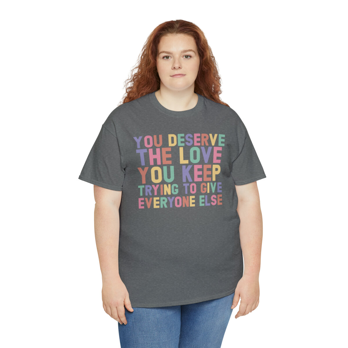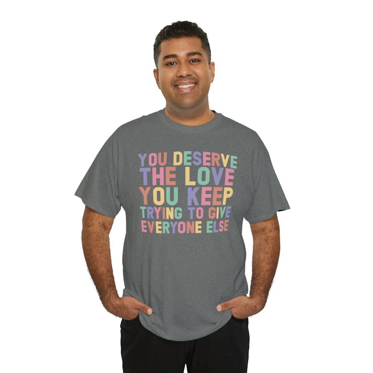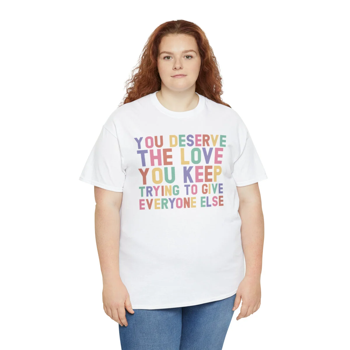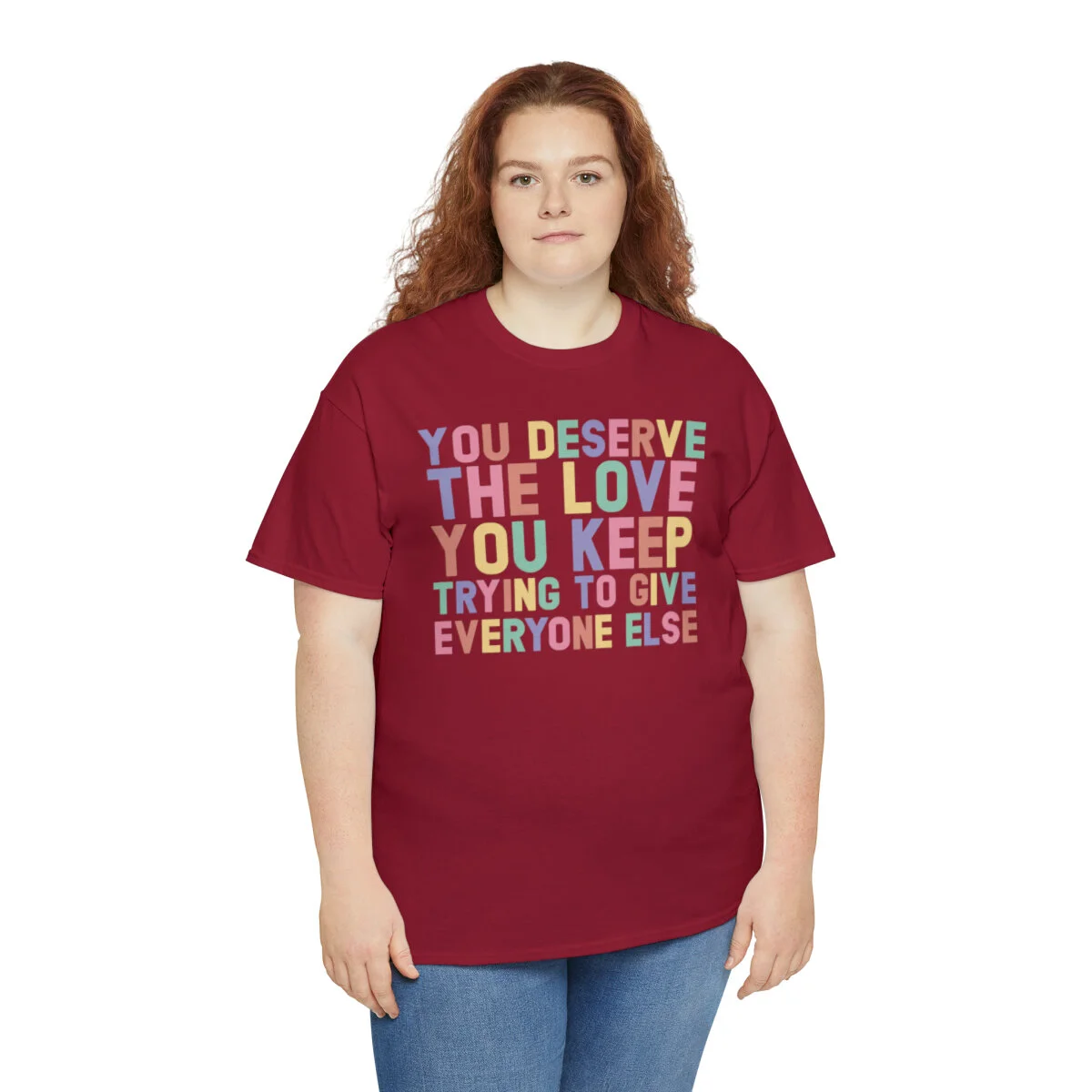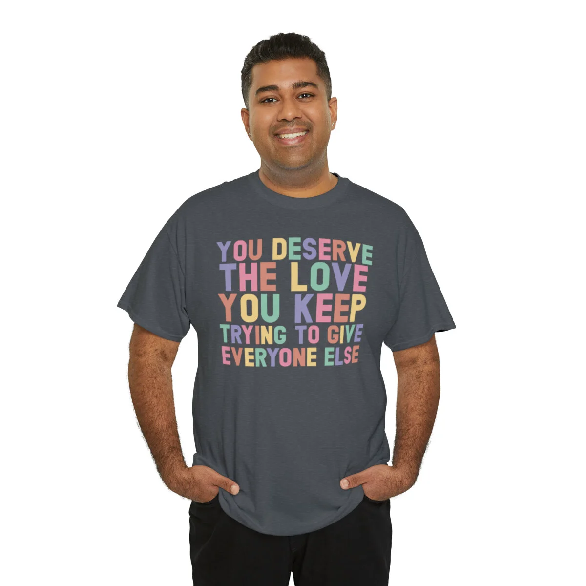 Crafted with care, this t-shirt is made from high-quality fabric to ensure exceptional comfort and durability. The design features the empowering phrase, "You deserve the love you give everyone else," elegantly displayed in multiple colors. Choose from a variety of vibrant options, including red, blue, yellow, or classic black and white, to express your personal style.