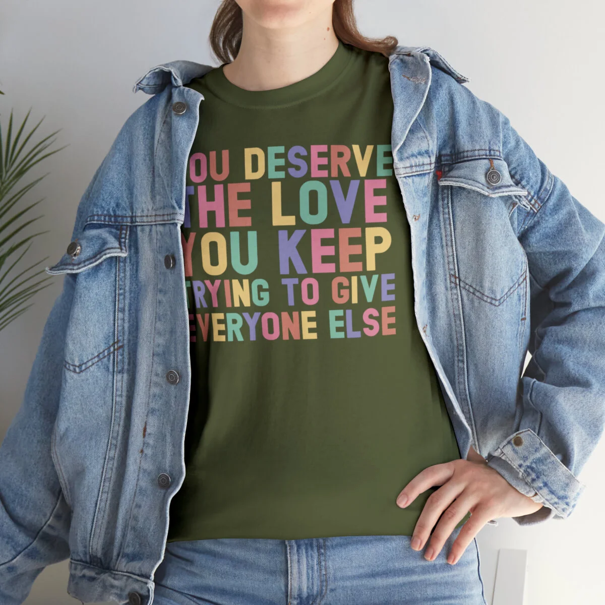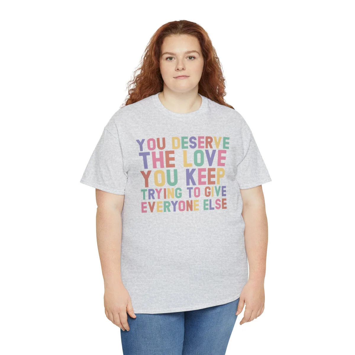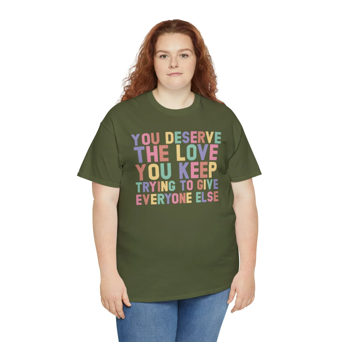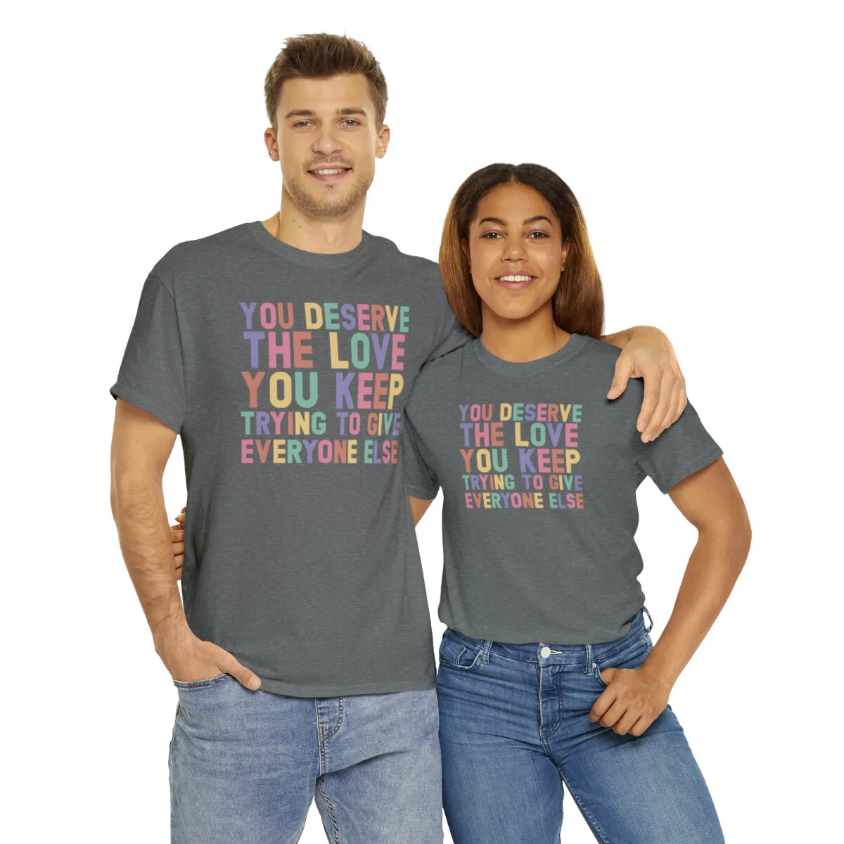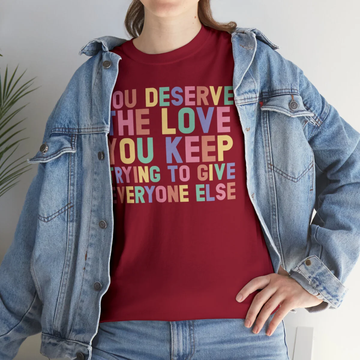 Crafted with care, this t-shirt is made from high-quality fabric to ensure exceptional comfort and durability. The design features the empowering phrase, "You deserve the love you give everyone else," elegantly displayed in multiple colors. Choose from a variety of vibrant options, including red, blue, yellow, or classic black and white, to express your personal style.