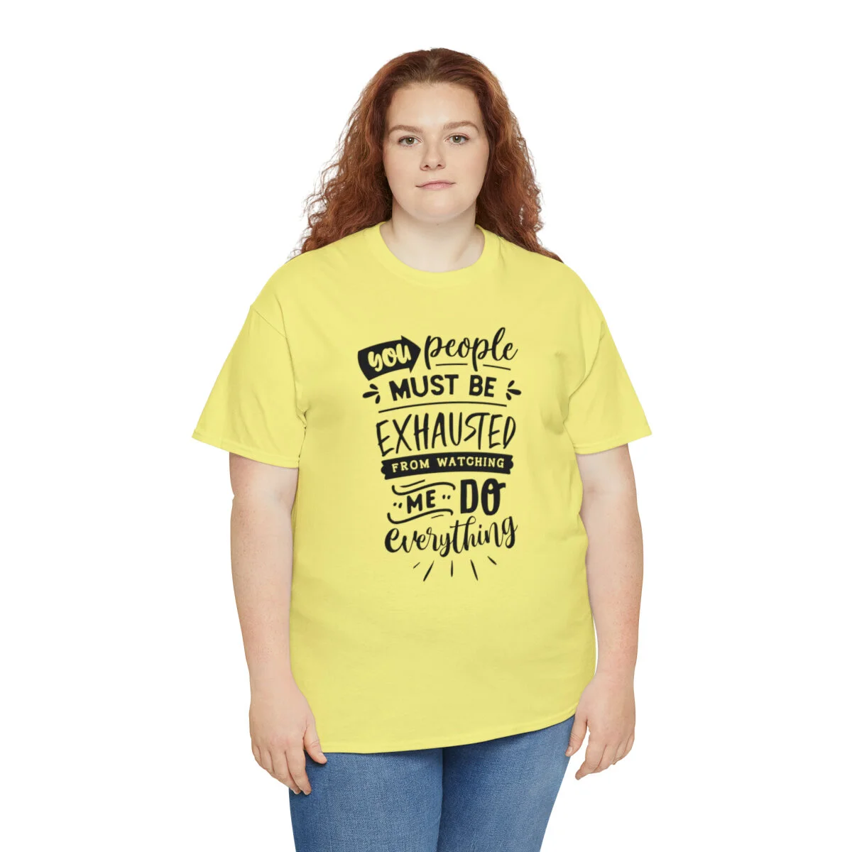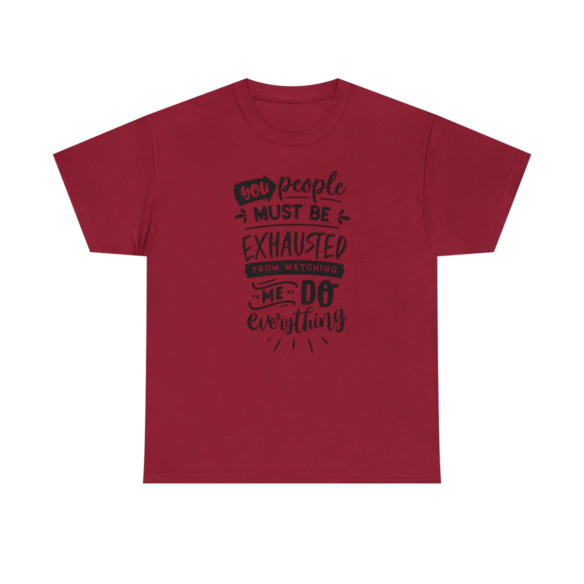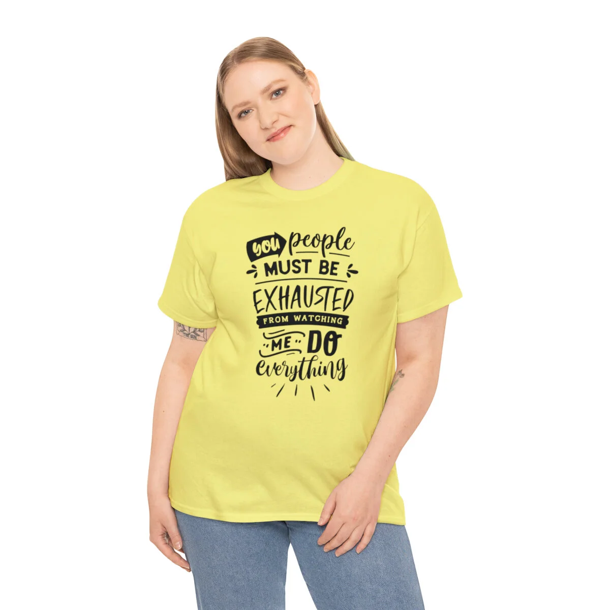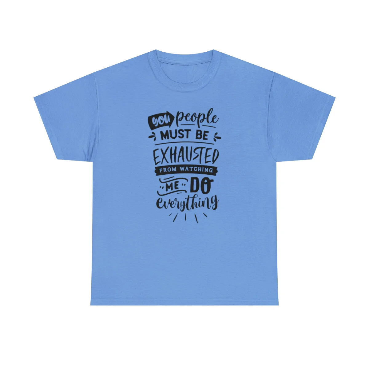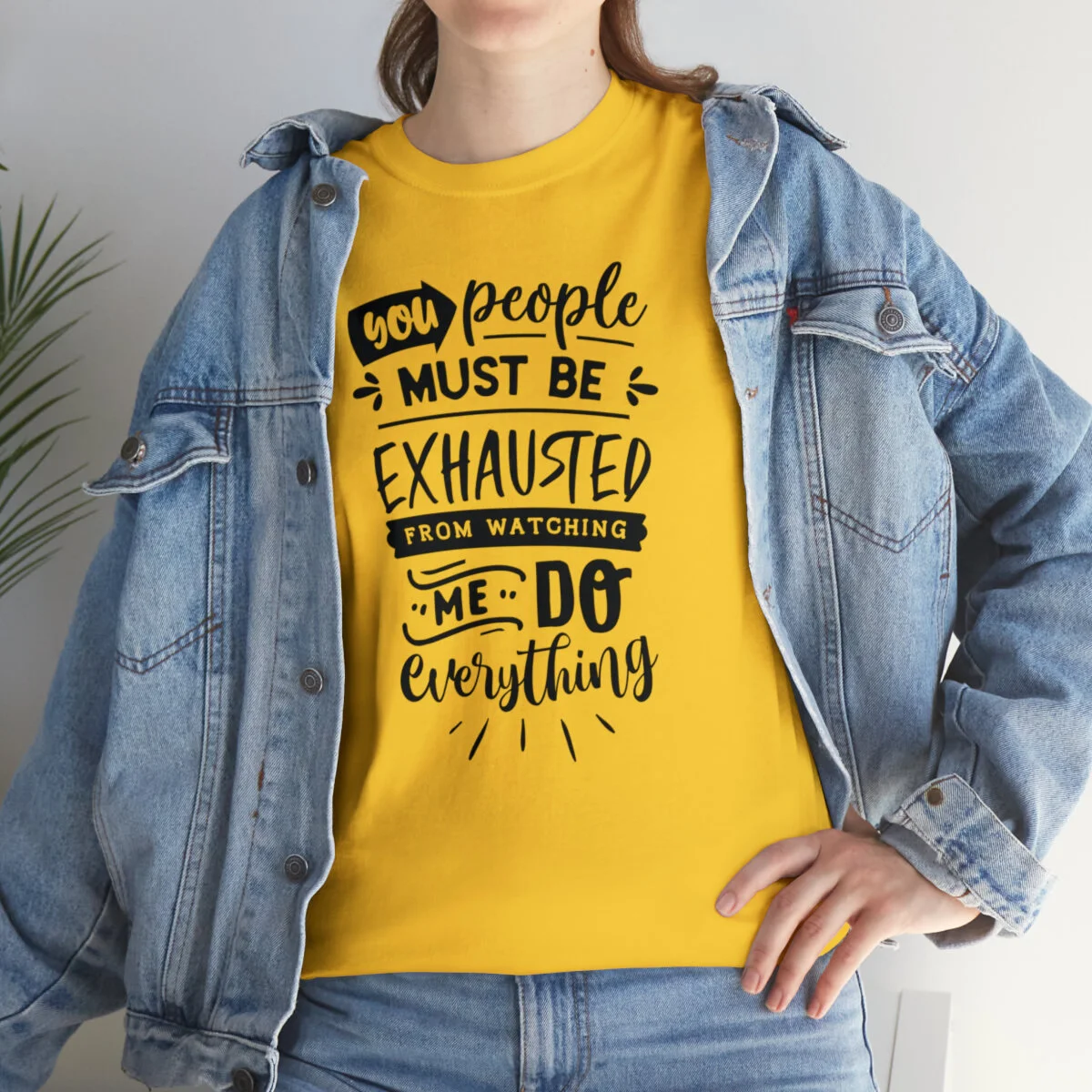 Crafted with care, this t-shirt is made from high-quality fabric to ensure exceptional comfort and durability. The design features the witty phrase, "You people must be exhausted from watching me do everything," elegantly displayed in multiple colors. Choose from a variety of vibrant options, including red, blue, yellow, or classic black and white, to find the hue that best matches your style and personality.