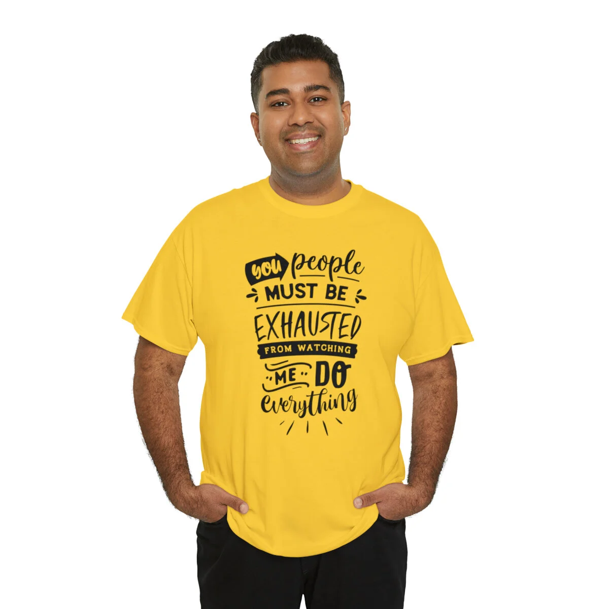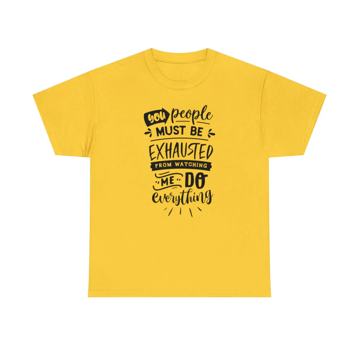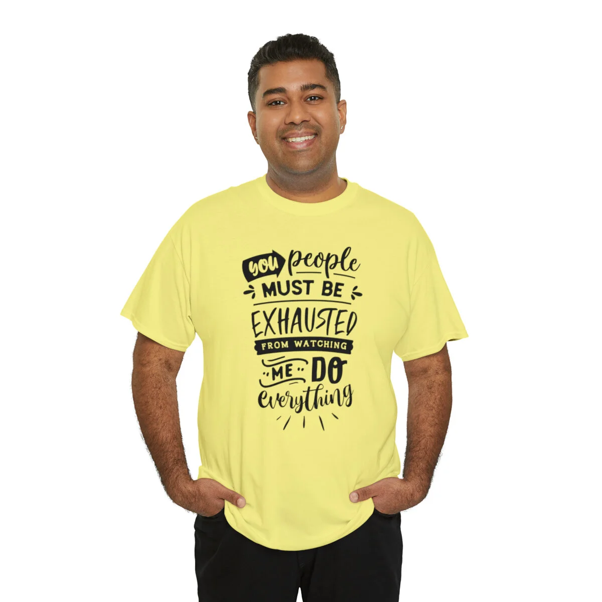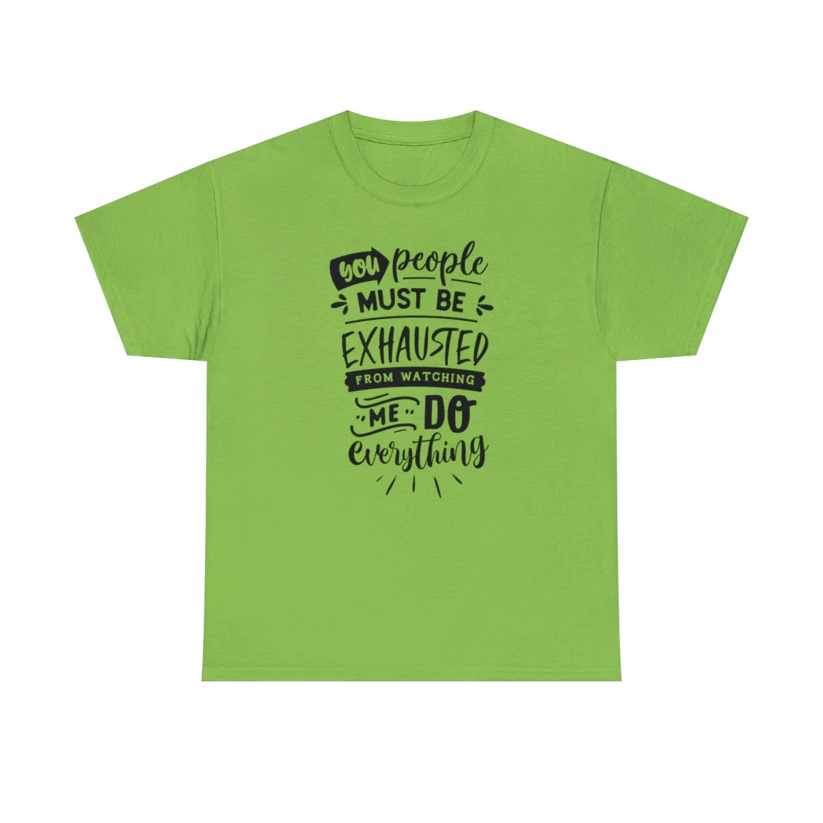 Crafted with care, this t-shirt is made from high-quality fabric to ensure exceptional comfort and durability. The design features the witty phrase, "You people must be exhausted from watching me do everything," elegantly displayed in multiple colors. Choose from a variety of vibrant options, including red, blue, yellow, or classic black and white, to find the hue that best matches your style and personality.