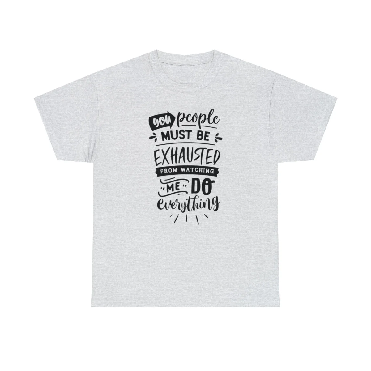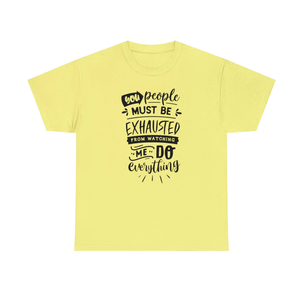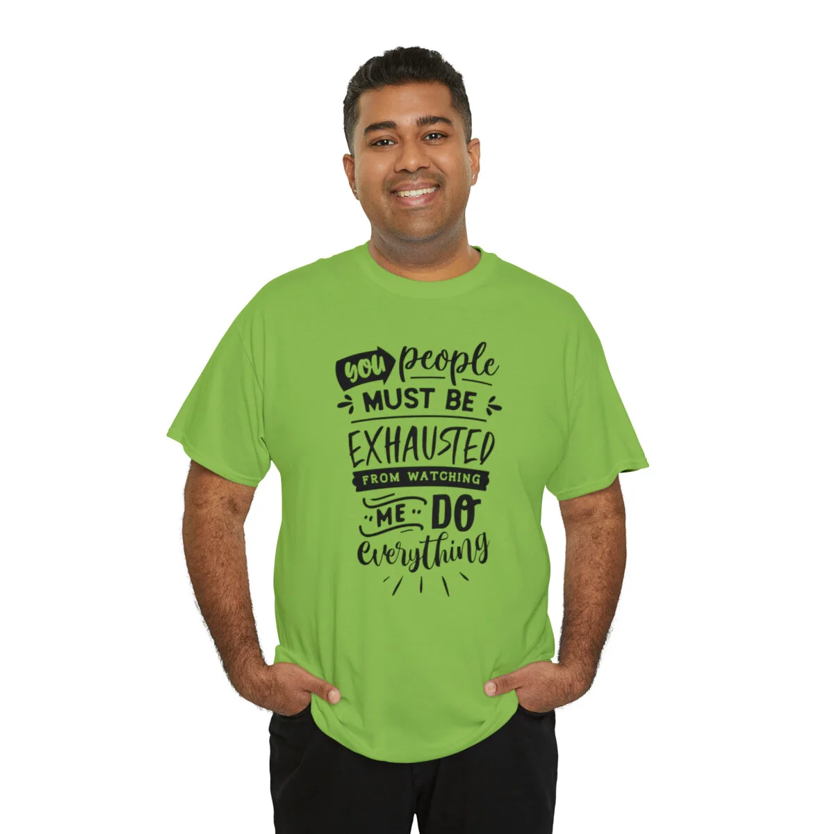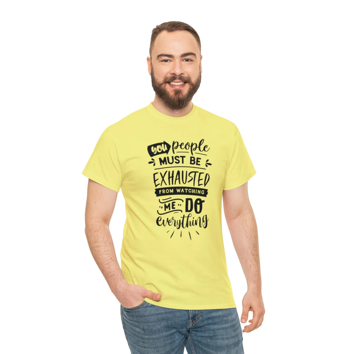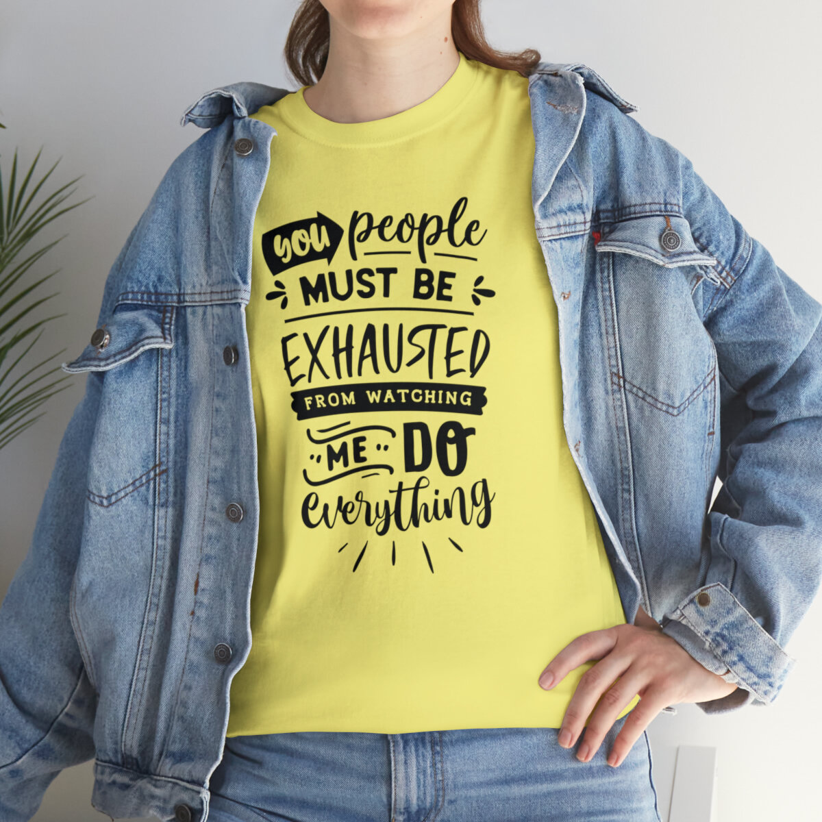 Crafted with care, this t-shirt is made from high-quality fabric to ensure exceptional comfort and durability. The design features the witty phrase, "You people must be exhausted from watching me do everything," elegantly displayed in multiple colors. Choose from a variety of vibrant options, including red, blue, yellow, or classic black and white, to find the hue that best matches your style and personality.