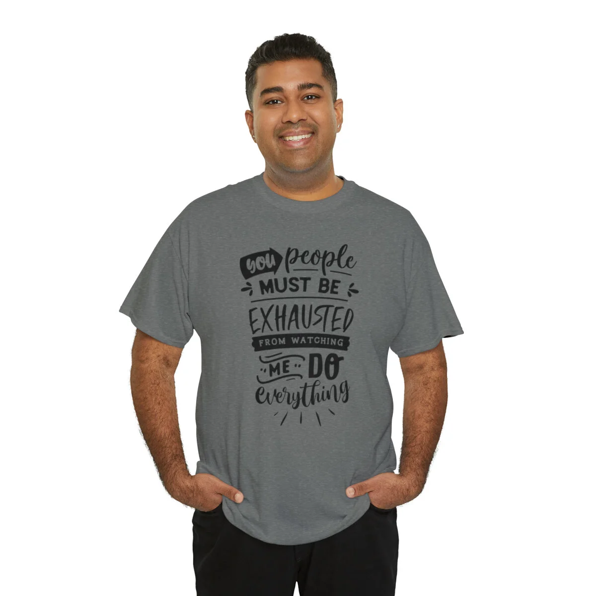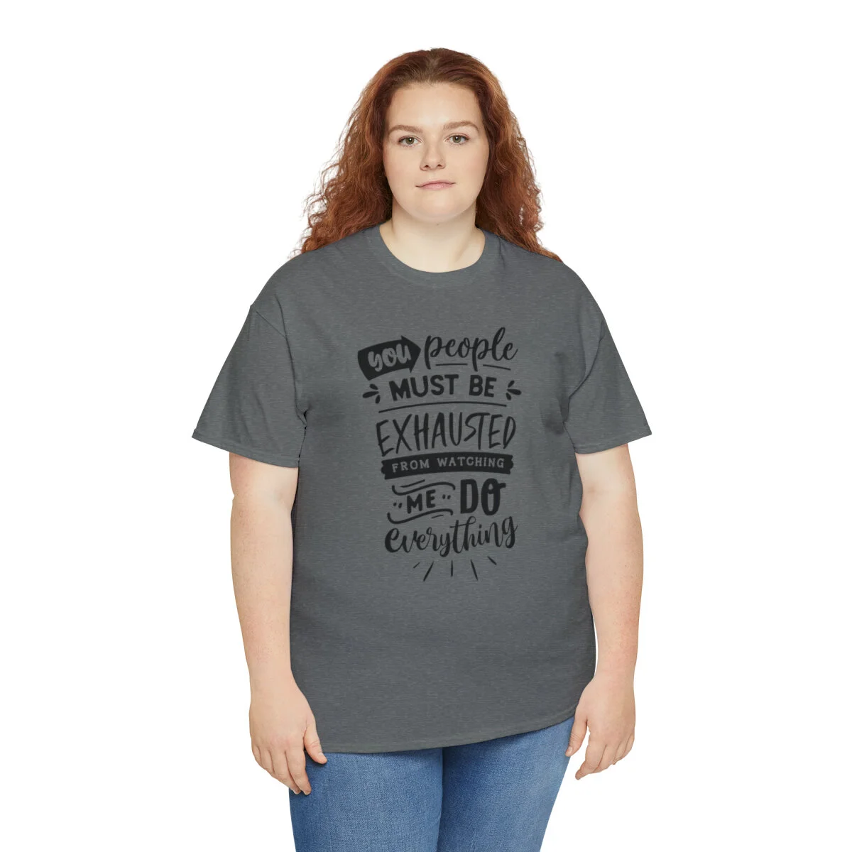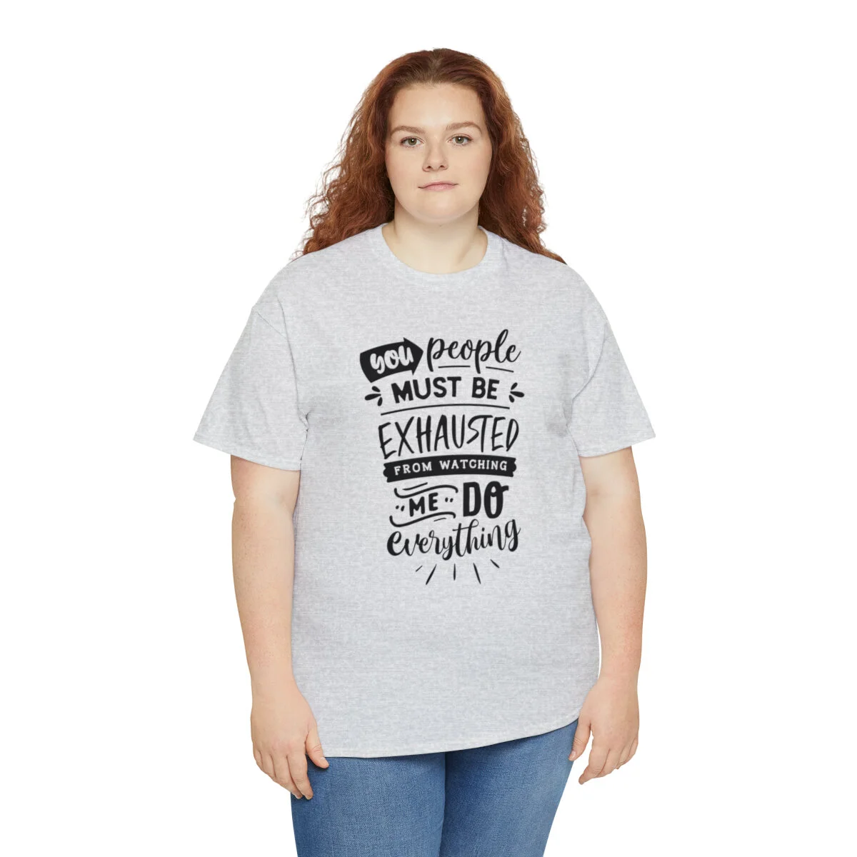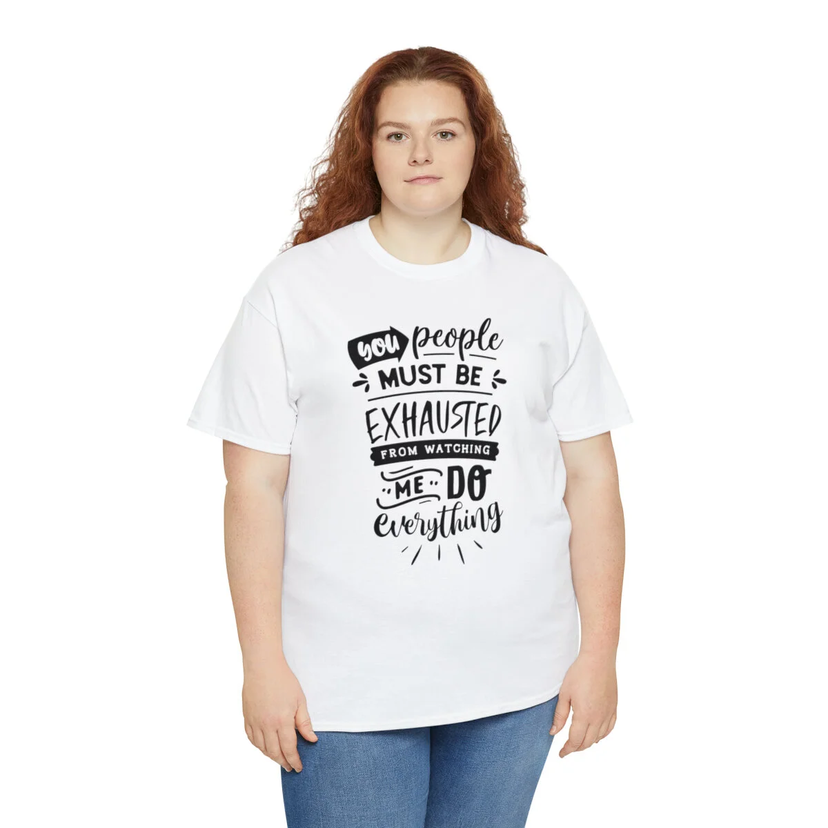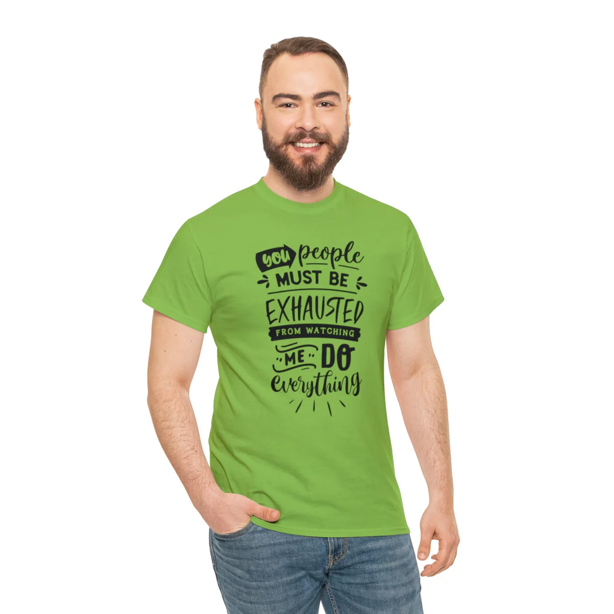 Crafted with care, this t-shirt is made from high-quality fabric to ensure exceptional comfort and durability. The design features the witty phrase, "You people must be exhausted from watching me do everything," elegantly displayed in multiple colors. Choose from a variety of vibrant options, including red, blue, yellow, or classic black and white, to find the hue that best matches your style and personality.